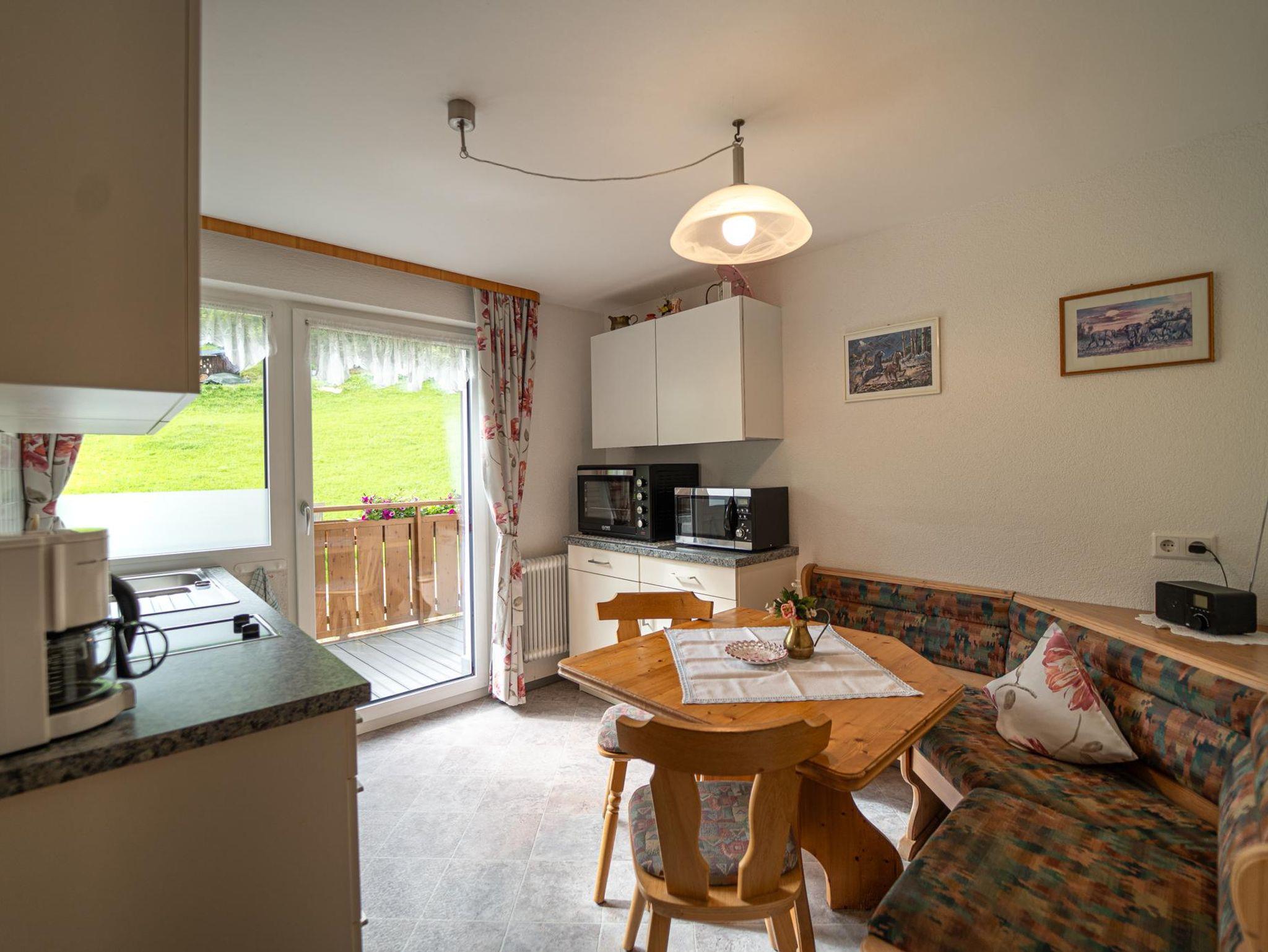 Ferienwohnung Mittagsspitze besteht aus einem kleinen Vorraum mit Garderobe, einer geräumigen, komplett eingerichteten Küche mit Sitzecke und Balkon sowie einem Wohnschlafzimmer und Dusche/WC, ebenfalls mit Balkon.