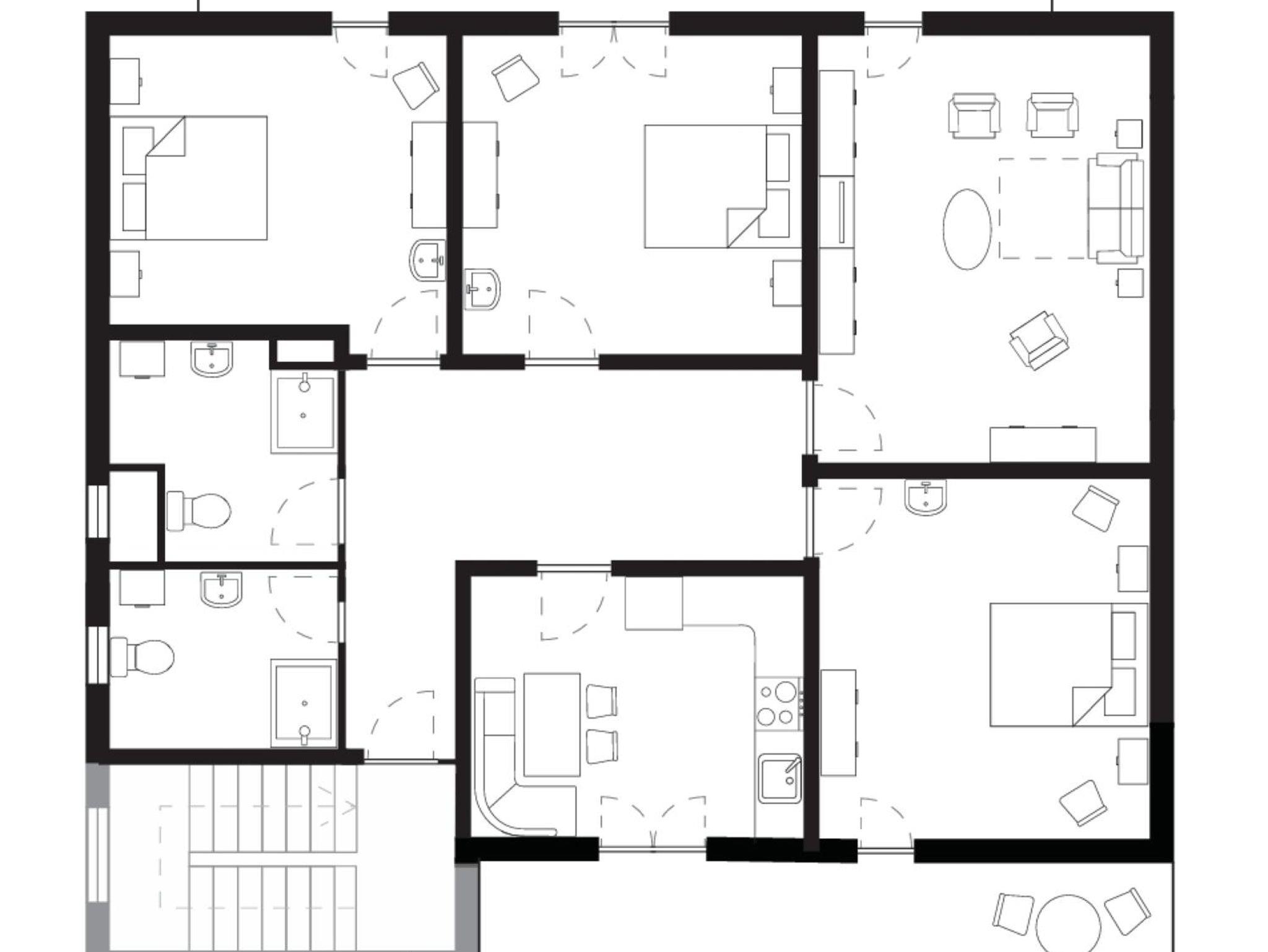Diese Wohnung für 6–8 Personen bietet drei Schlafzimmer mit Doppelbett und Waschbecken, ein Wohnzimmer mit Schlafsofa und eine Küche.