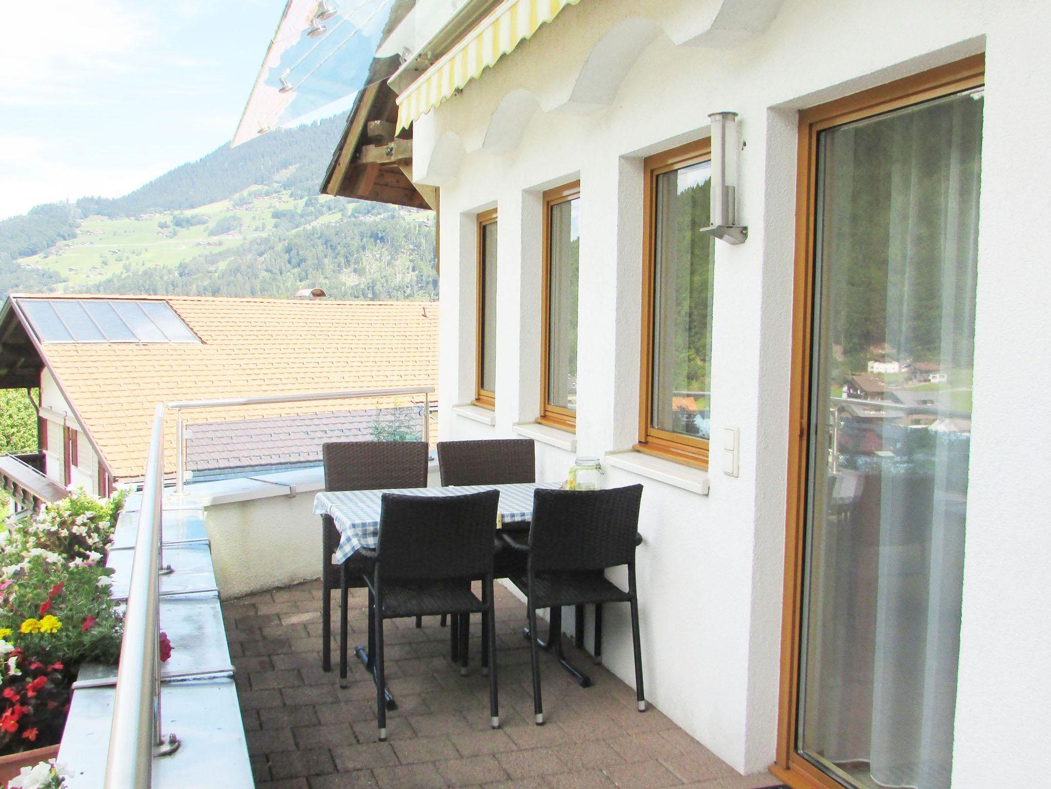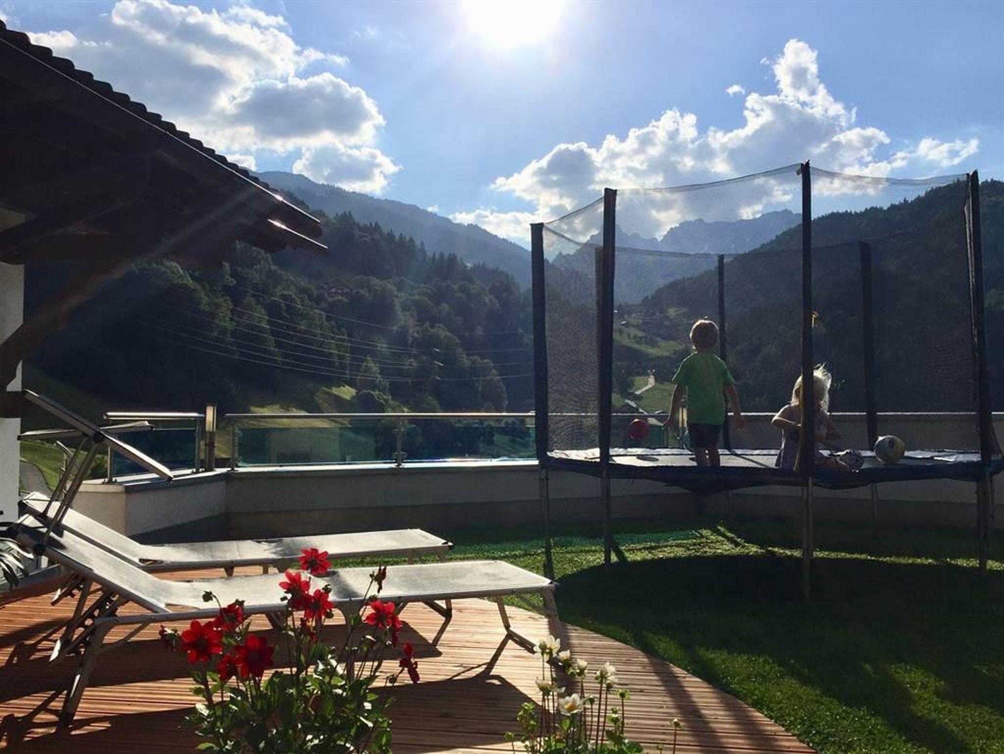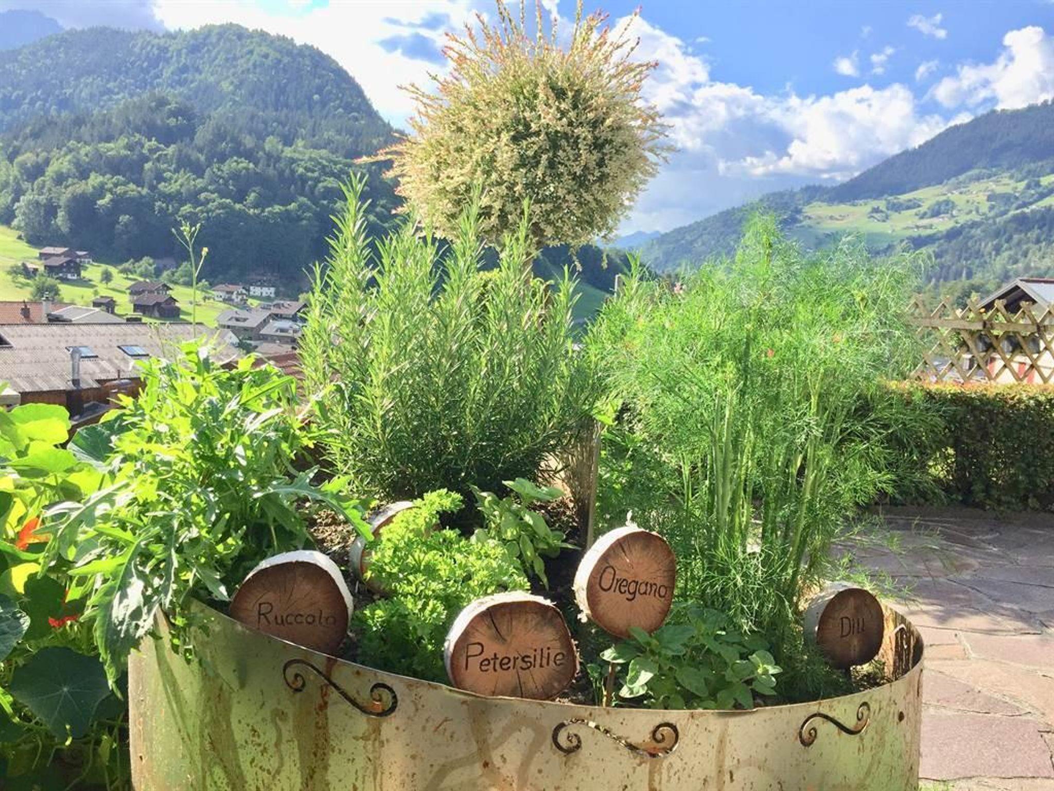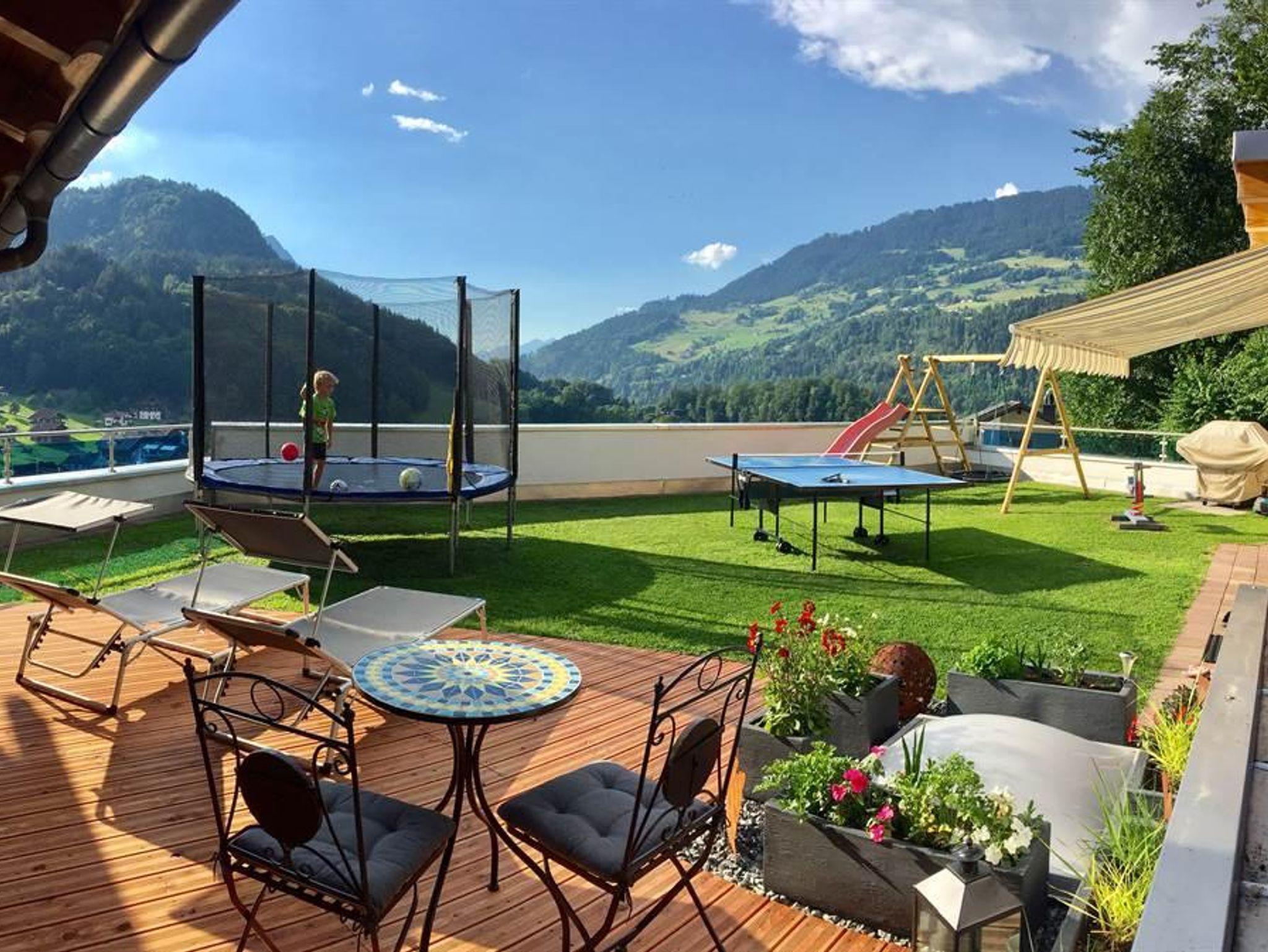 Terrasse mit Sitzgelegenheit und Bergblick, direkter Zugang zum Garten.