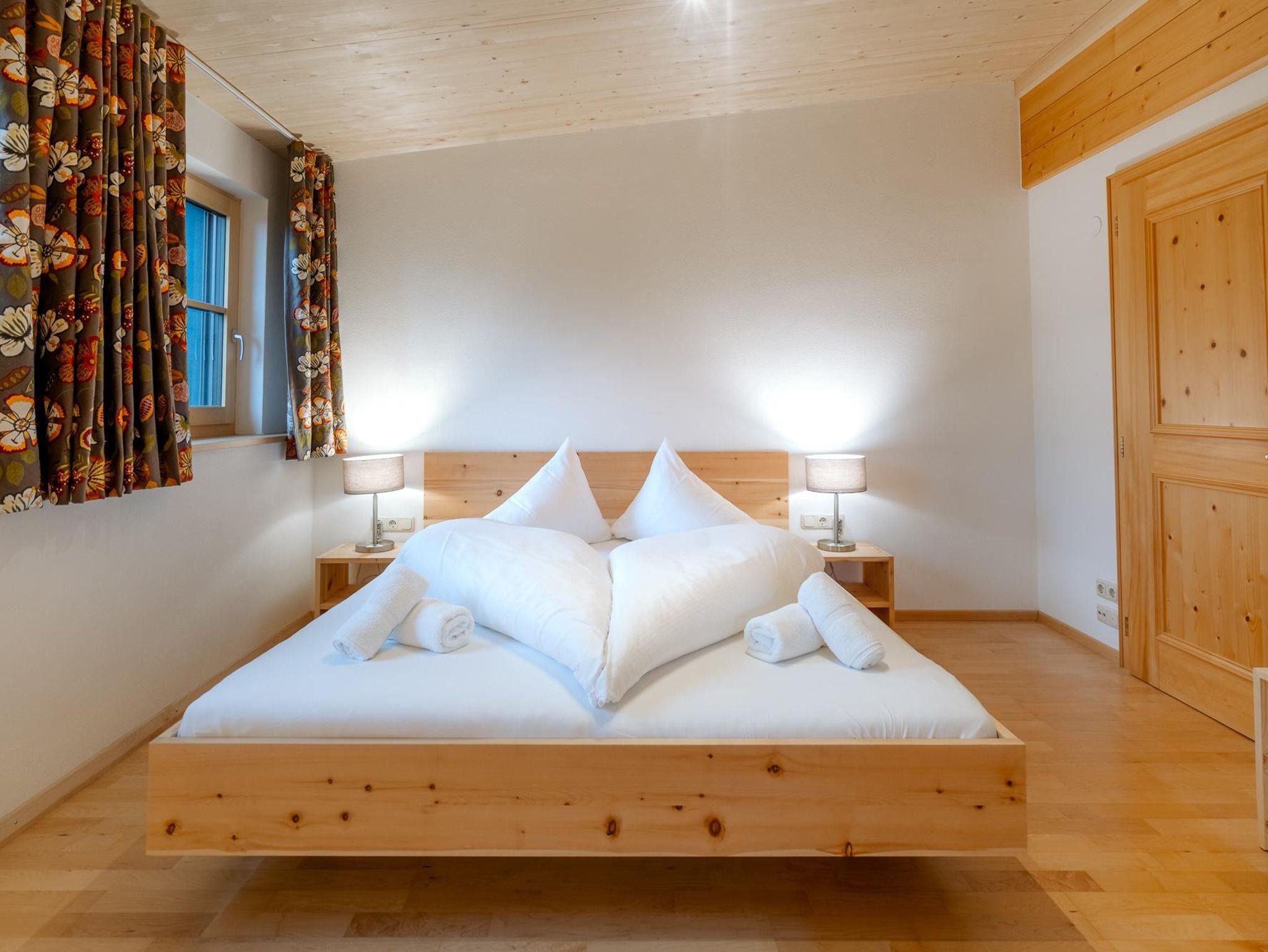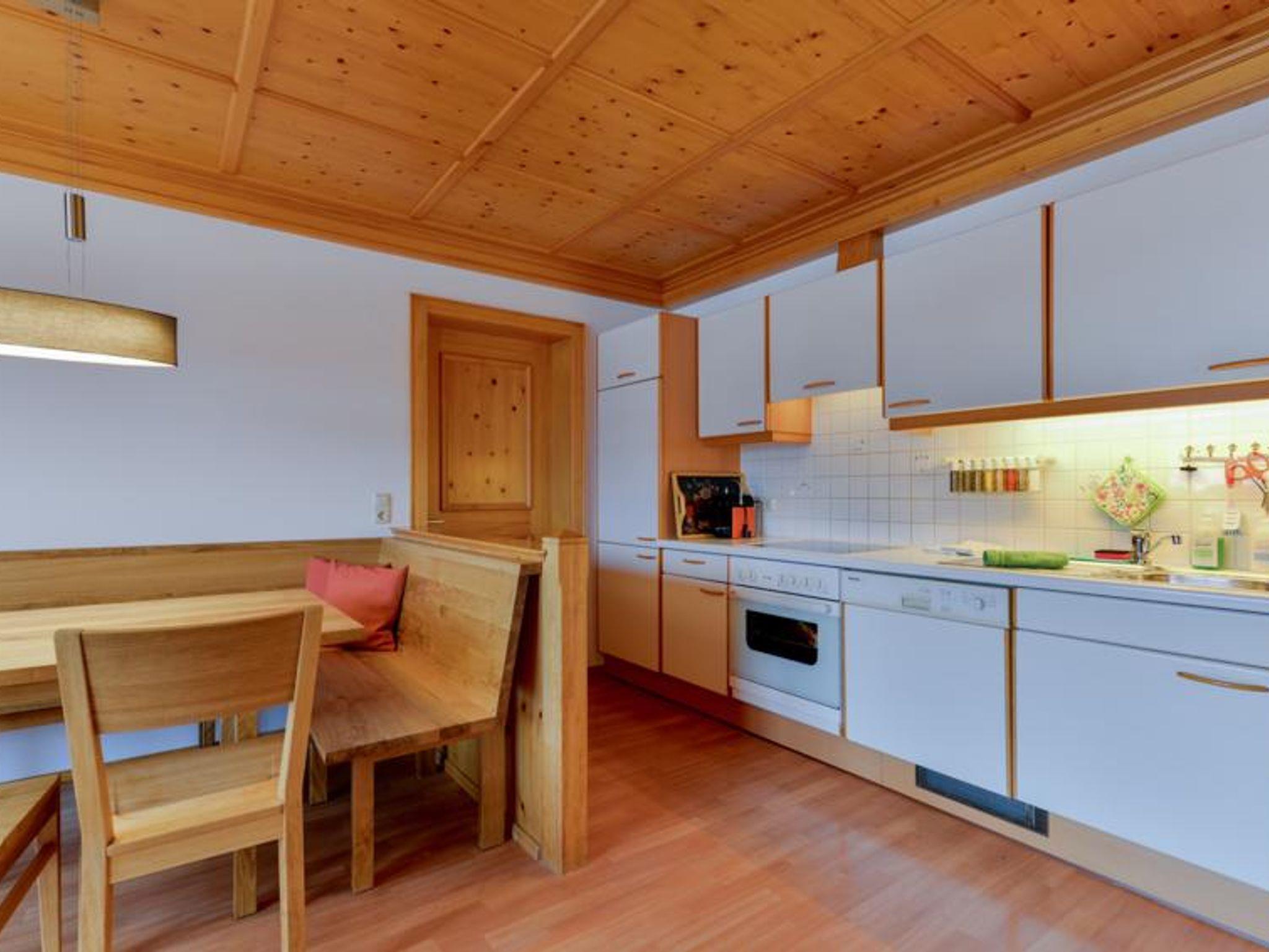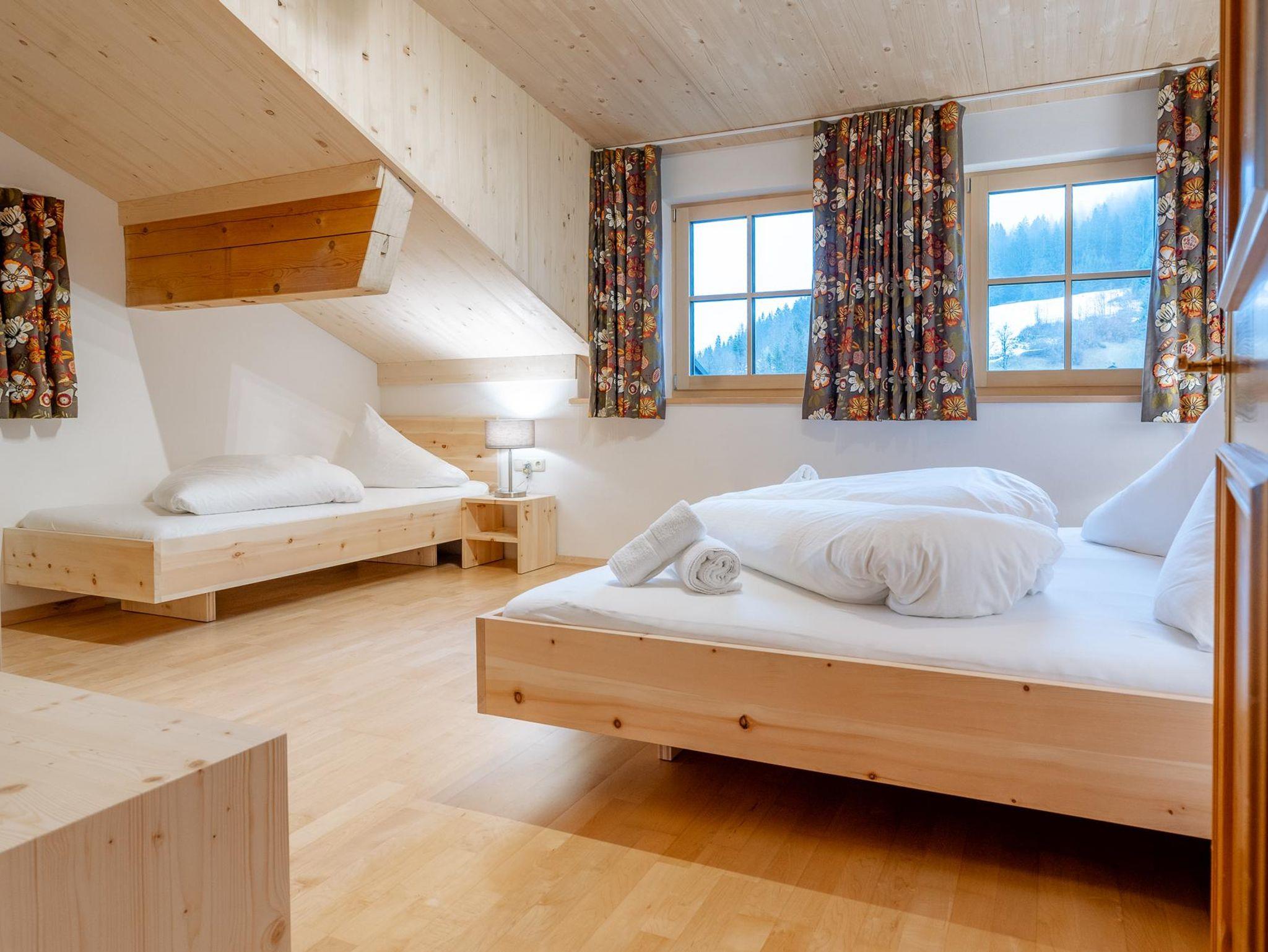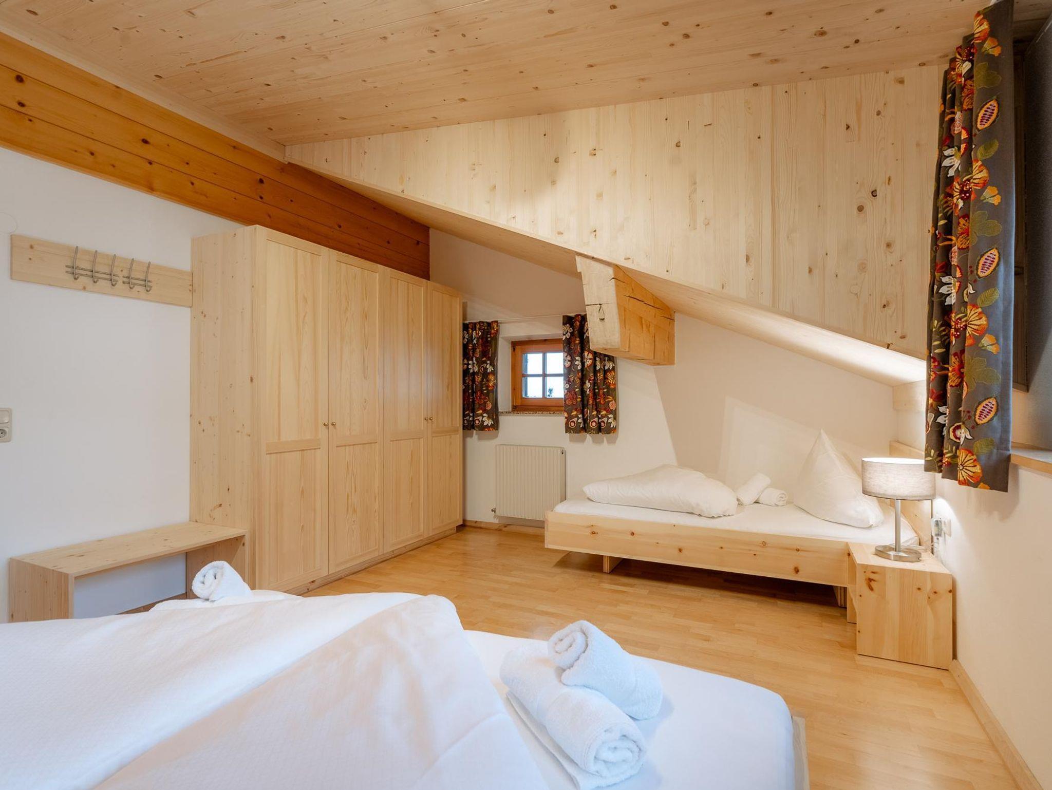 53 m2 im Dachgeschoss, Ostlage, bestehend aus einer großzügigen Wohnküche mit Sitzecke, einem Schlafzimmer mit Doppelbett aus Zirbenholz und einem Einzelbett aus Zirbenholz und einer Schlafkammer (Dachschräge) mit einem Doppelbett (140 x 190 cm), einem Bad mit Dusche, separatem WC und einem Balkon mit Morgensonne.