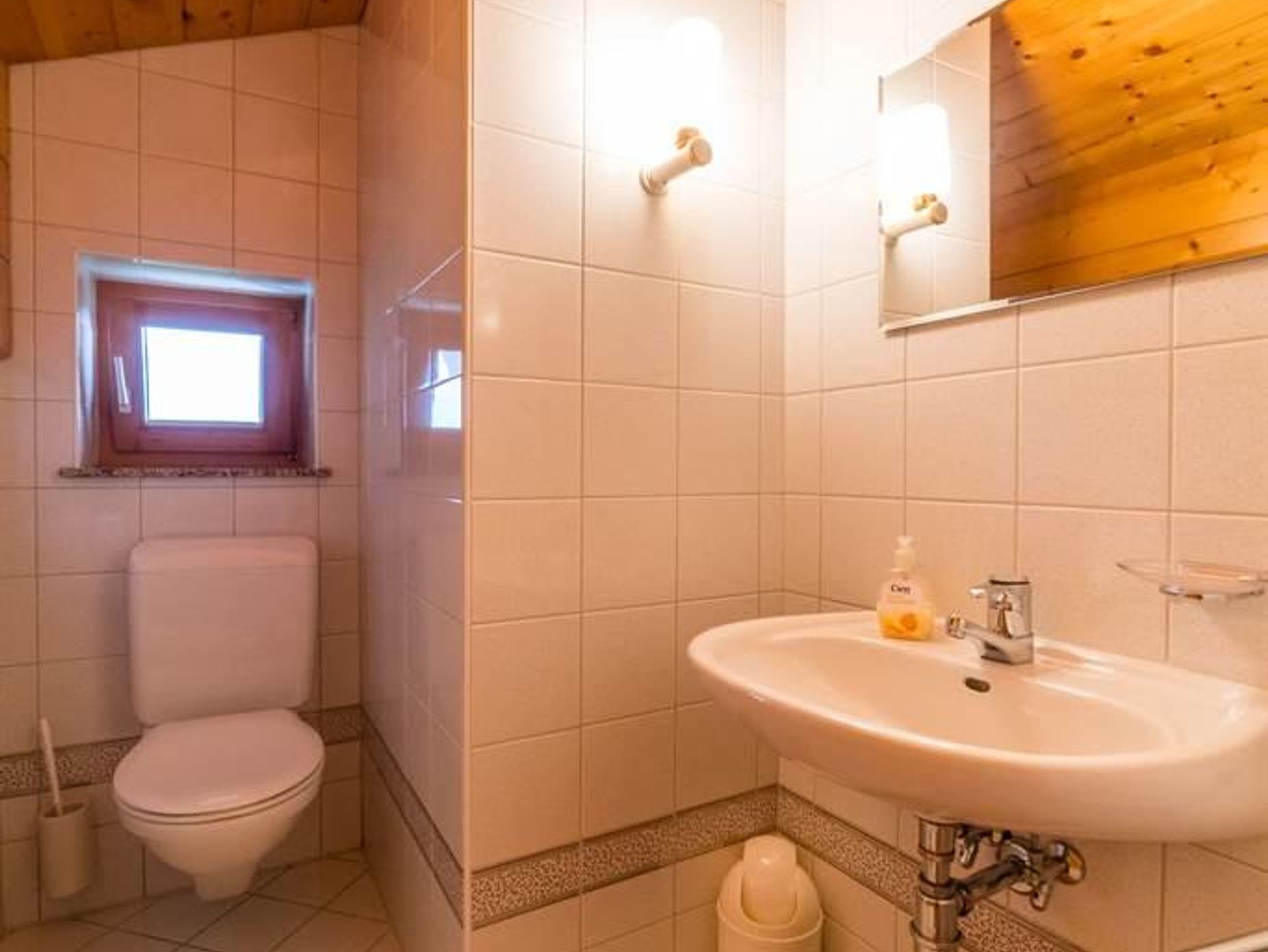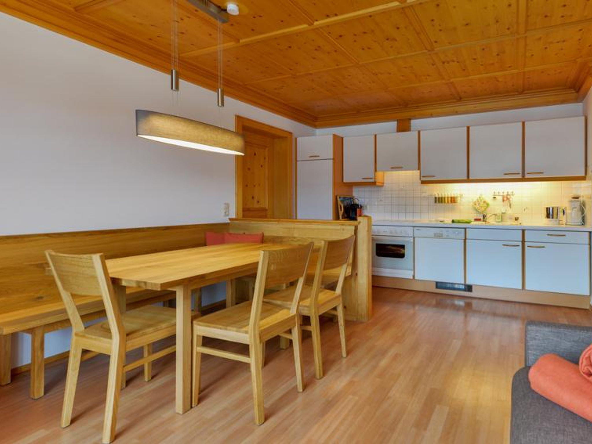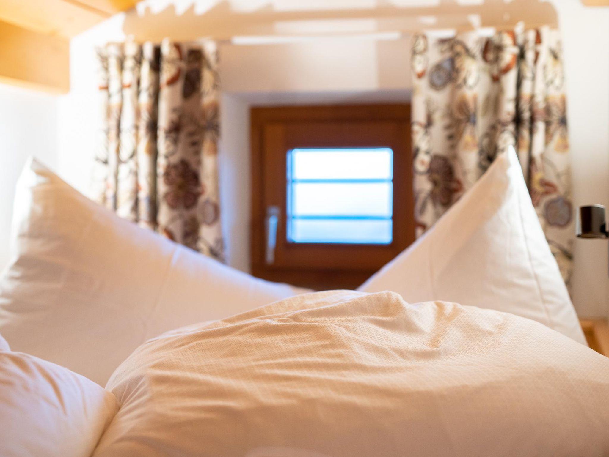 53 m2 im Dachgeschoss, Ostlage, bestehend aus einer großzügigen Wohnküche mit Sitzecke, einem Schlafzimmer mit Doppelbett aus Zirbenholz und einem Einzelbett aus Zirbenholz und einer Schlafkammer (Dachschräge) mit einem Doppelbett (140 x 190 cm), einem Bad mit Dusche, separatem WC und einem Balkon mit Morgensonne.