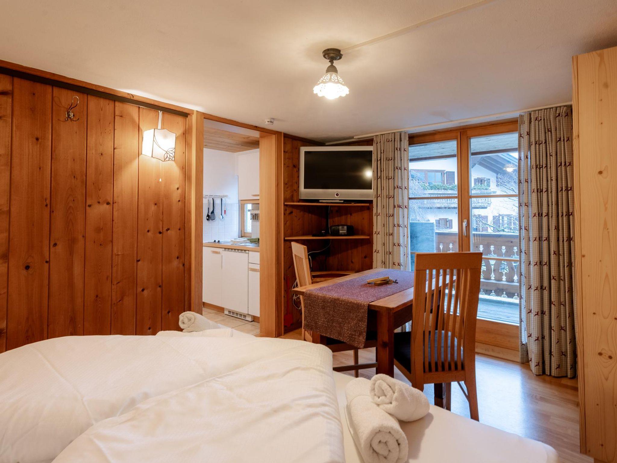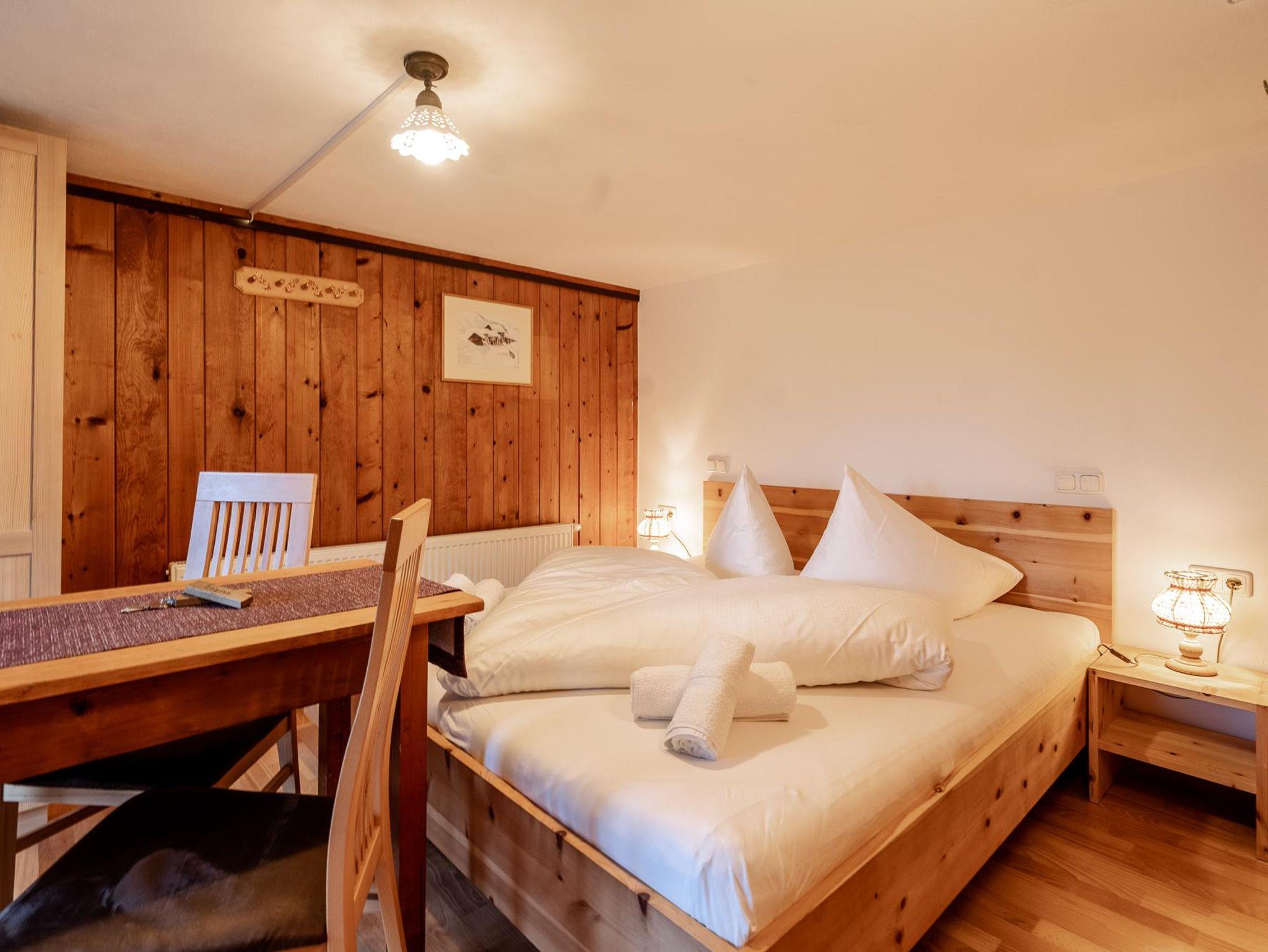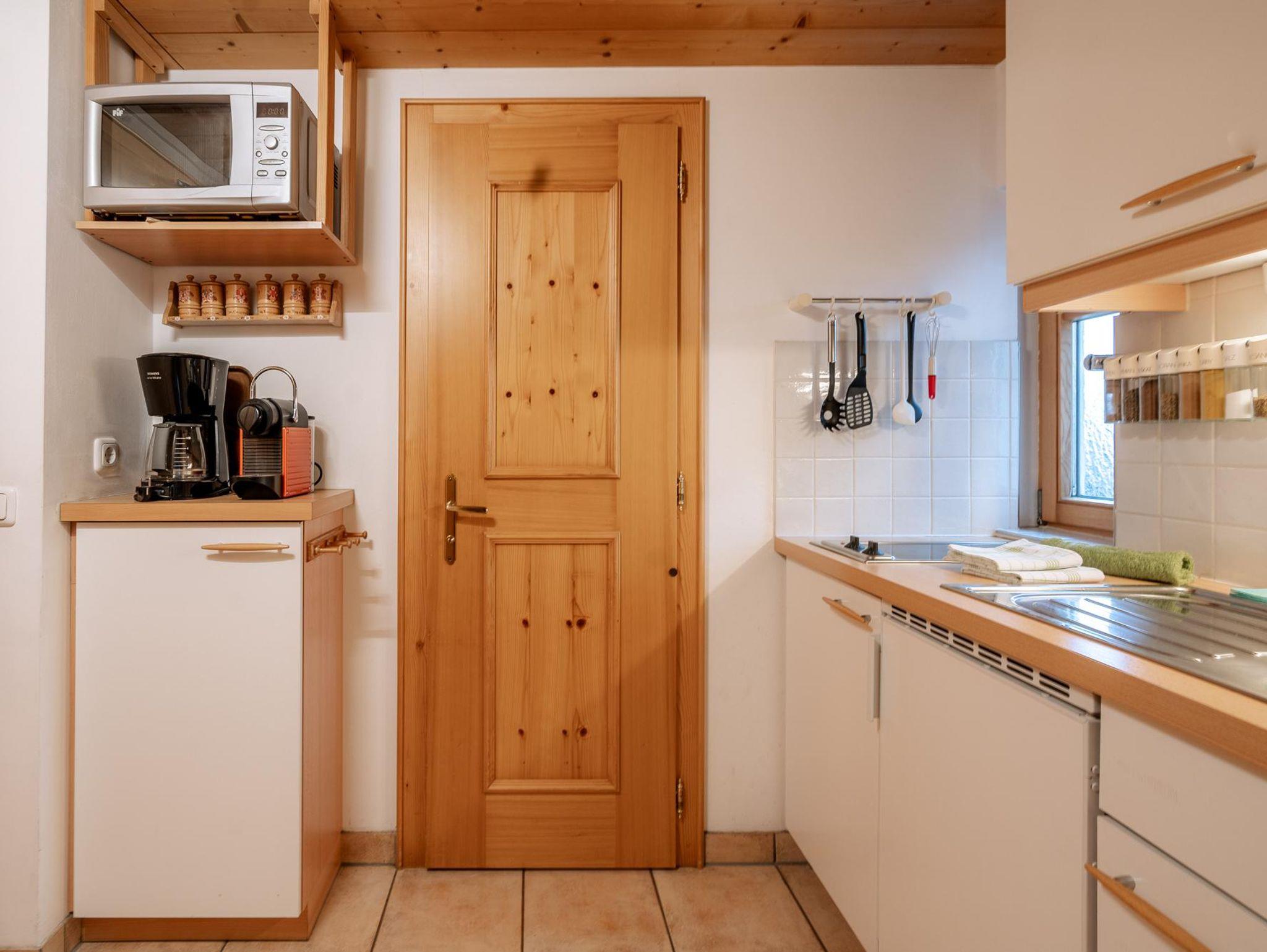 Im Haus Dokas mit 20m2 im 1. Stock, Süd-Ostlage, bestehend aus einer Küche (mit Mikrowelle, kein Backofen und kein Geschirrspüler), einem Wohn-Schlafzimmer mit einem schönen Doppelbett aus Zirbenholz, Bad mit Dusche/WC und einem überdachten Balkon mit komfortablen Möbeln.