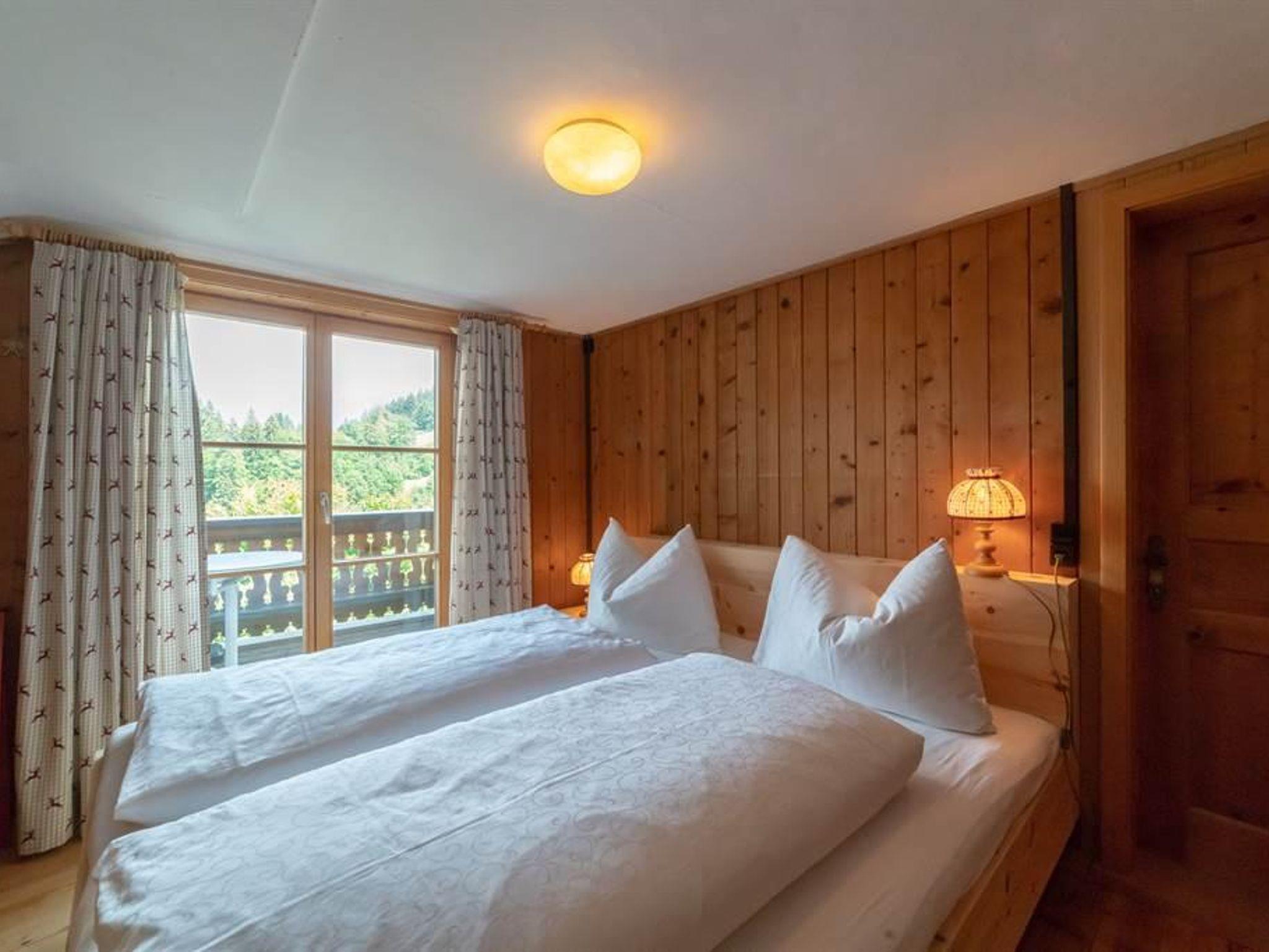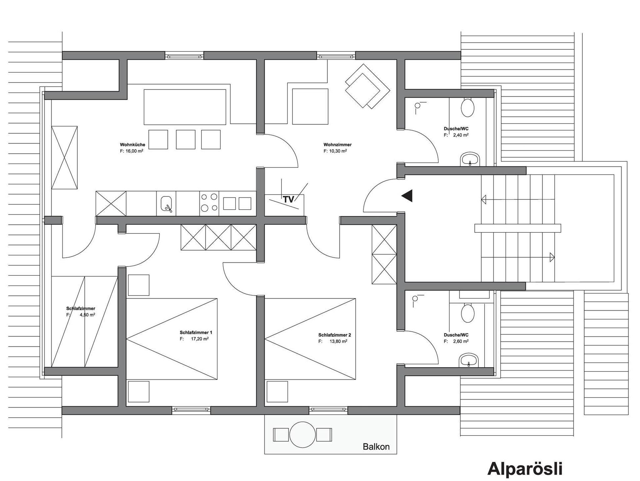 Im Haus Dokas mit 65 m2 im Dachgeschoss (Raumhöhe 2,07 m), Ost-, Süd-Westlage, bestehend aus einer Wohnküche mit Sitzecke, einer gemütlichen Stube mit einer schönen Couch, zwei Schlafzimmer mit Doppelbetten aus Zirbenholz und einer Schlafkammer mit einem Hochbett (140 x 200 cm), zwei Bädern mit Dusche/WC und einem Balkon mit komfortablen Möbeln.