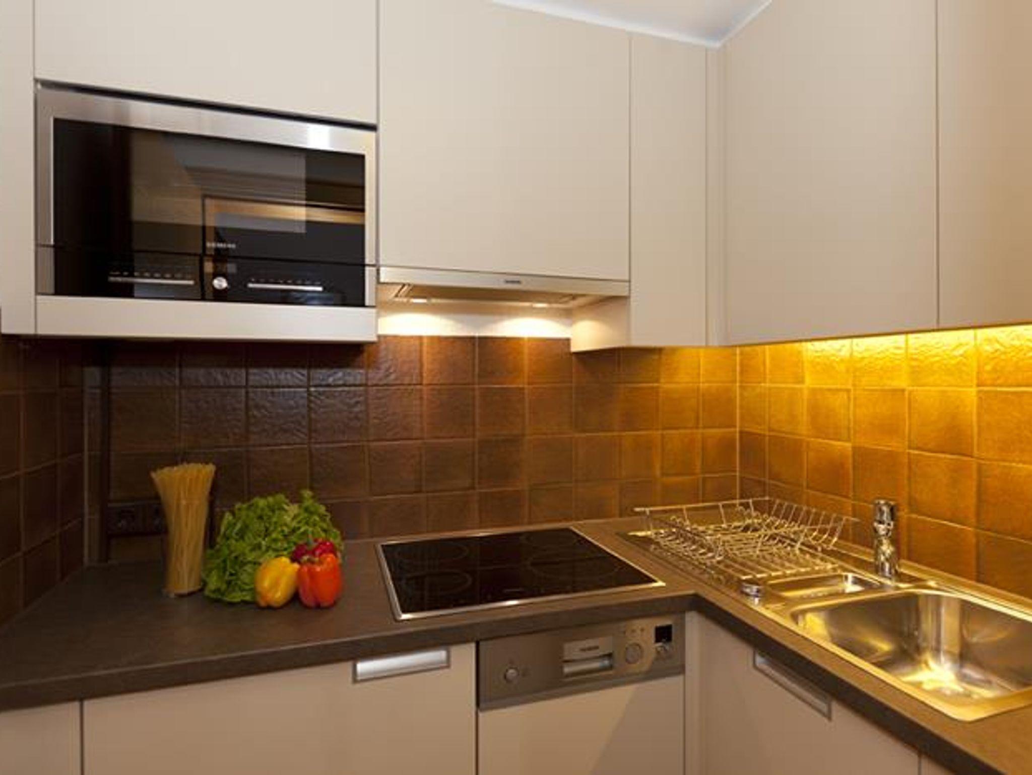 Schlafzimmer mit Doppelbett (inkl. Bettwäsche), komplett eingerichtete Küche, Mikrowelle mit Grill, Geschirrspüler, Dusche/WC (inkl. Hand- u. Duschtücher), Wohnzimmer mit Sitzecke und Eßbereich , Süd-Ost-Balkon mit Gartenmöbel, Safe, Radio, Kabel-TV, W-lan.