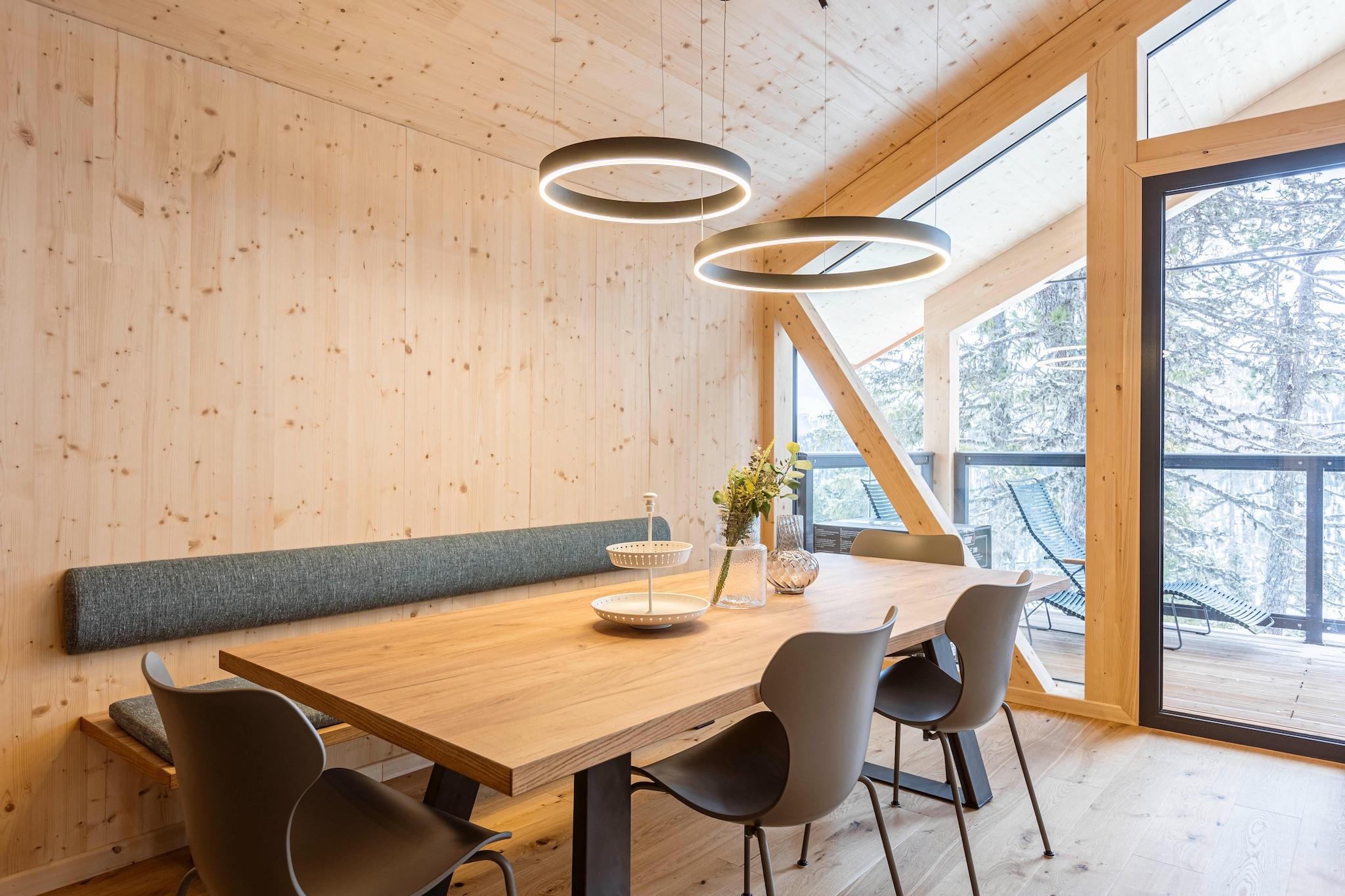 Willkommen in Ihrem alpinen Refugium in diesem bezaubernden Massivholz-Chalet, das 135 m² luxuriöse Wohnfläche auf zwei Etagen bietet. Perfekt für Familien oder Gruppen, bietet dieses Chalet bequem Platz für bis zu 8 Personen und kombiniert rustikalen Charme mit modernen Annehmlichkeiten für einen wirklich unvergesslichen Aufenthalt. Nach einem erlebnisreichen Tag können Sie in der finnischen Sauna entspannen oder ein wohltuendes Bad im Whirlpool auf dem Balkon nehmen, der einen atemberaubenden Blick auf die umliegende Landschaft bietet. Das Chalet verfügt über 4 schön eingerichtete Schlafzimmer, die für Entspannung und Komfort sorgen. Im Erdgeschoss befindet sich ein Schlafzimmer mit einem Doppelbett, eigenem Bad und einem Fernseher. Außerdem gibt es zwei weitere Schlafzimmer im Erdgeschoss, jedes mit einem Doppelbett, TV und einem eigenen Balkon, von dem aus Sie die Aussicht auf den Wald genießen können. Im Obergeschoss befindet sich ein Schlafzimmer mit einem Doppelbett, TV und einem separaten Schlafsofa, das zusätzlichen Schlafplatz bietet. Ein geräumiges Bad mit Badewanne sorgt für zusätzlichen Komfort. Die offene Küche ist voll ausgestattet mit allem, was Sie brauchen, um köstliche Mahlzeiten zuzubereiten. Sie verfügt über ein Cerankochfeld, einen Backofen, einen Geschirrspüler und einen Kühlschrank mit großem Gefrierfach. Weitere Geräte sind ein Toaster, ein Grilltoaster, ein Waffeleisen, ein Wasserkocher, eine Filterkaffeemaschine und eine Nespresso-Kapselkaffeemaschine. Ein kleines Starterset mit Spülmaschinentabs, Spülmittel (Probe), Schwamm, Müllbeuteln, Reinigungsmitteln und einem Geschirrtuch liegt bei Ihrer Ankunft bereit. Bleiben Sie mit kostenlosem Wi-Fi in Verbindung und genießen Sie TV-Unterhaltung während Ihres gesamten Aufenthalts. Das Chalet verfügt außerdem über einen Skischuhtrockner, eine Surround-Sound-Box, eine Waschmaschine und einen Elektrogrill auf dem Balkon (keine Kohle erforderlich), um einen komfortablen und angenehmen Aufenthalt zu gewährleisten. Ihr Aufenthalt beinhaltet eine Butler-Karte oder ein Butler-Programm für einen persönlichen Service, der Ihrem Urlaub einen zusätzlichen Hauch von Luxus verleiht. Bitte beachten Sie, dass die Zufahrt zum Chalet über eine asphaltierte Hauptstraße erfolgt, gefolgt von einem malerischen Wald- und Forstweg. Dieser einzigartige Weg unterstreicht den abgelegenen Charme Ihres alpinen Rückzugsortes.