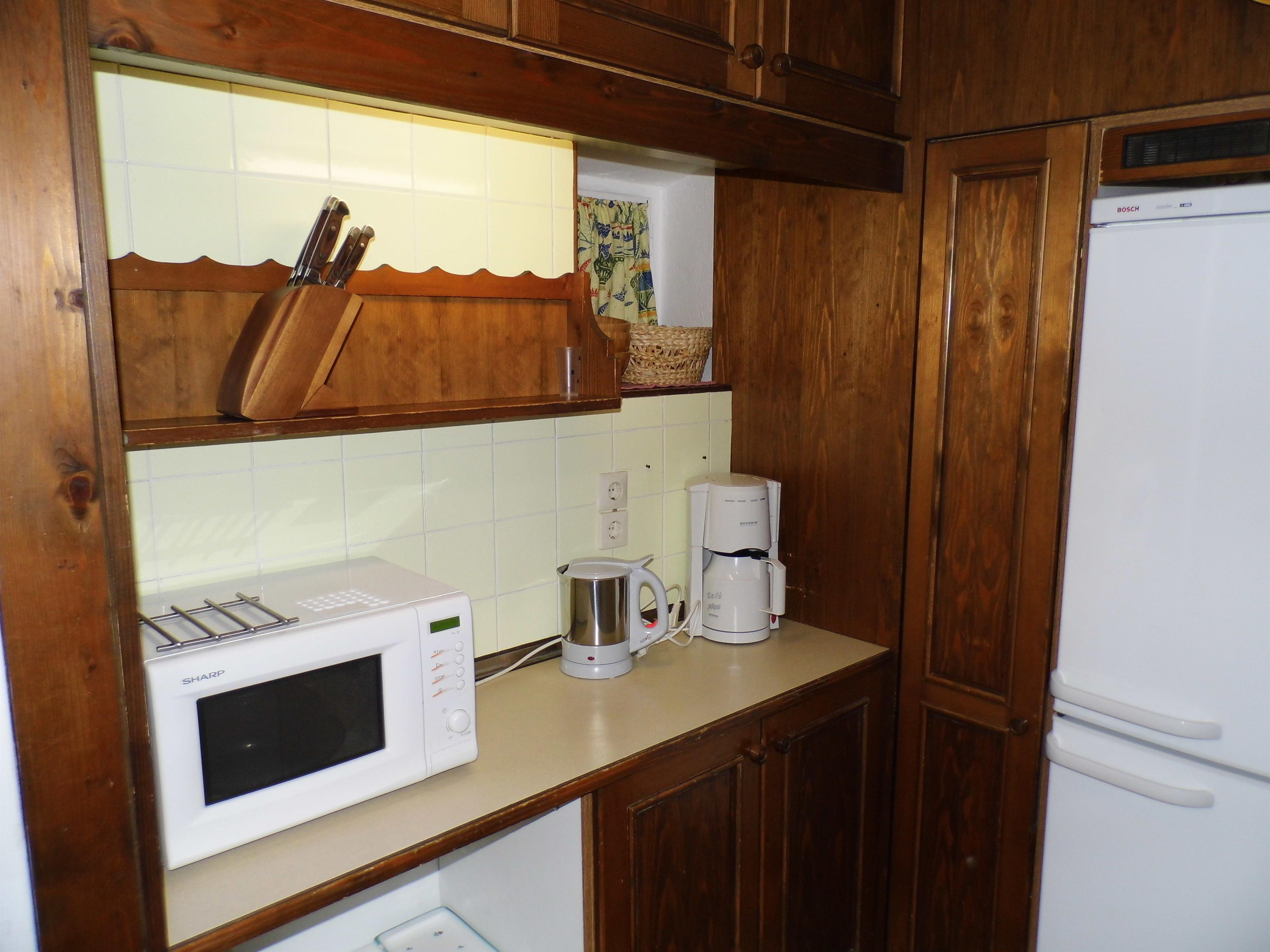 Die erweiterte Fewo hat eine Küche mit Backofen ( auch Umluft), Cerankochfeld, Geschirrspüler, Mikrowelle, Kühl-Gefrierkombination, E-Mixstab, Kaffeemaschine (Filter 1×4 ), Geschirr und Gläser für 8 Personen, Besteck und Kochtöpfe, auch einen grossen Nudelkochtopf, Pfannen einen Eierkocher, Toaster, Wasserkocher und vieles mehr. Ein grosses Esszimmer mit Kachelofen, in der Verbindung zum Wohnzimmer eine Etagenbett-Kombination für Kinder. Wohnzimmer und Flur und Schlafzimmer mit Teppichboden.