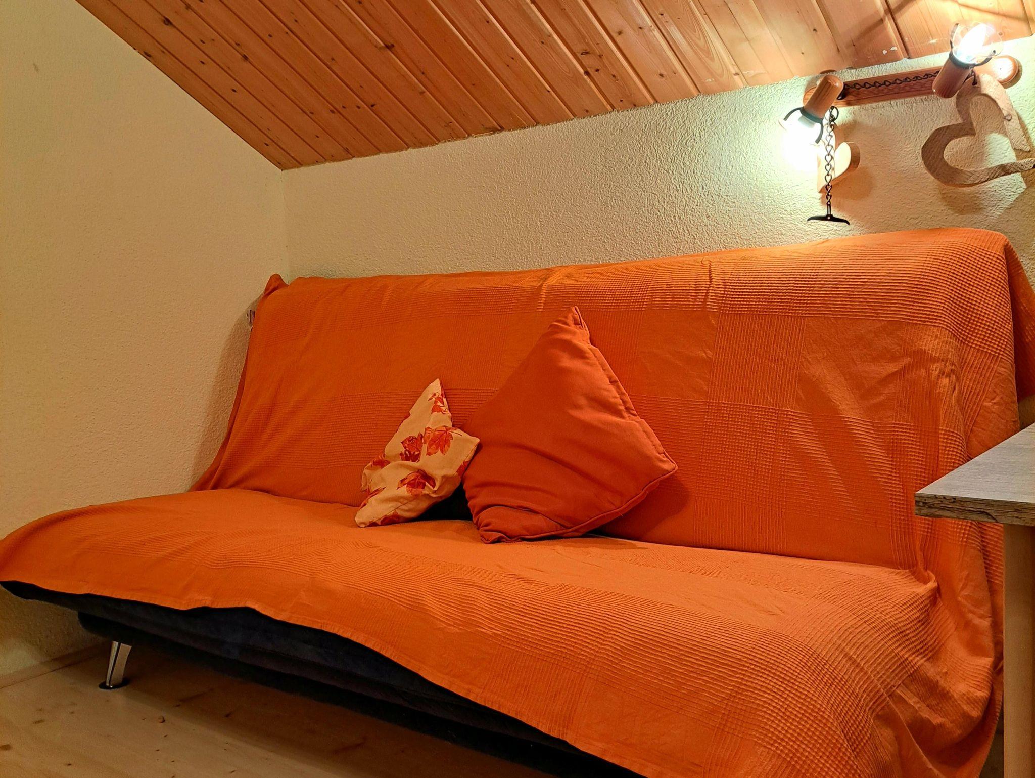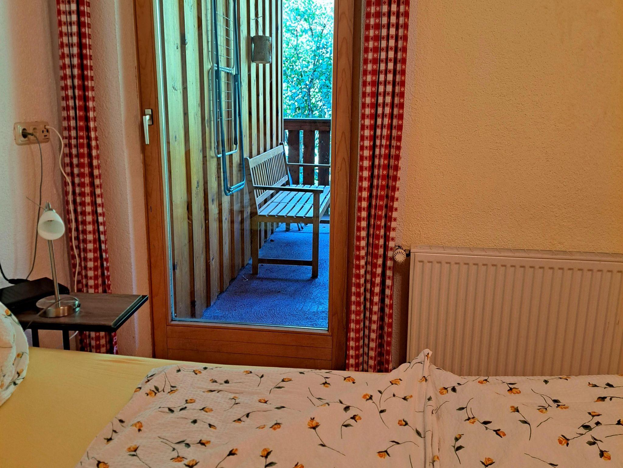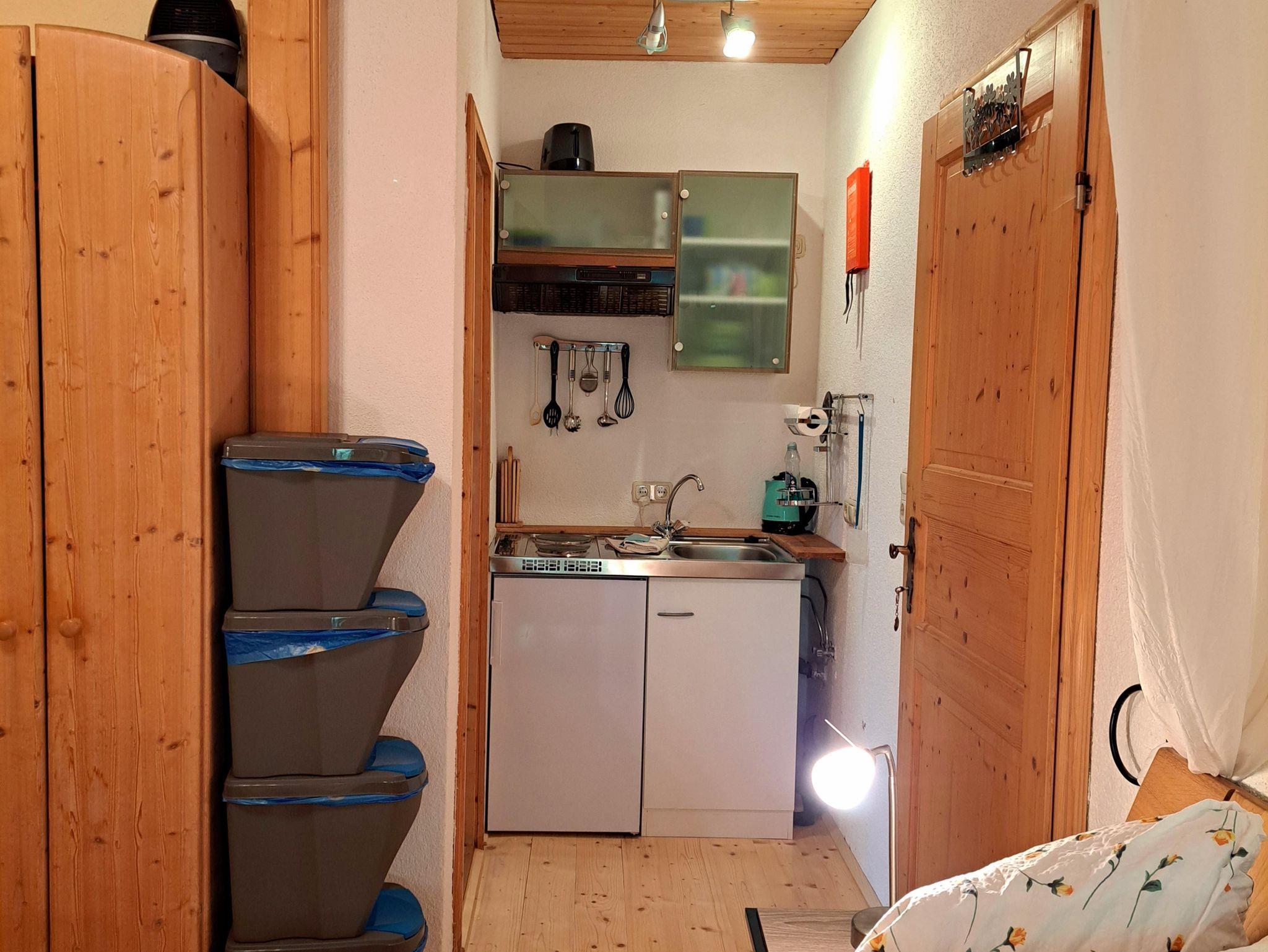 gemütliches Doppelzimmer mit einem Bett (2m x 1,60m) und einer Sitzcouch eine kleine Essecke 2 m Kochnische mit Kochutensilien Balkon mit Blick auf den Hang Sanitärbereich mit Bad und WC