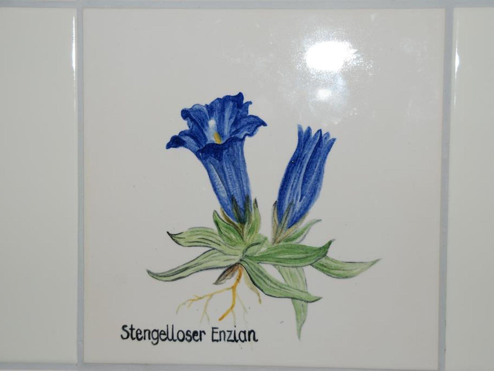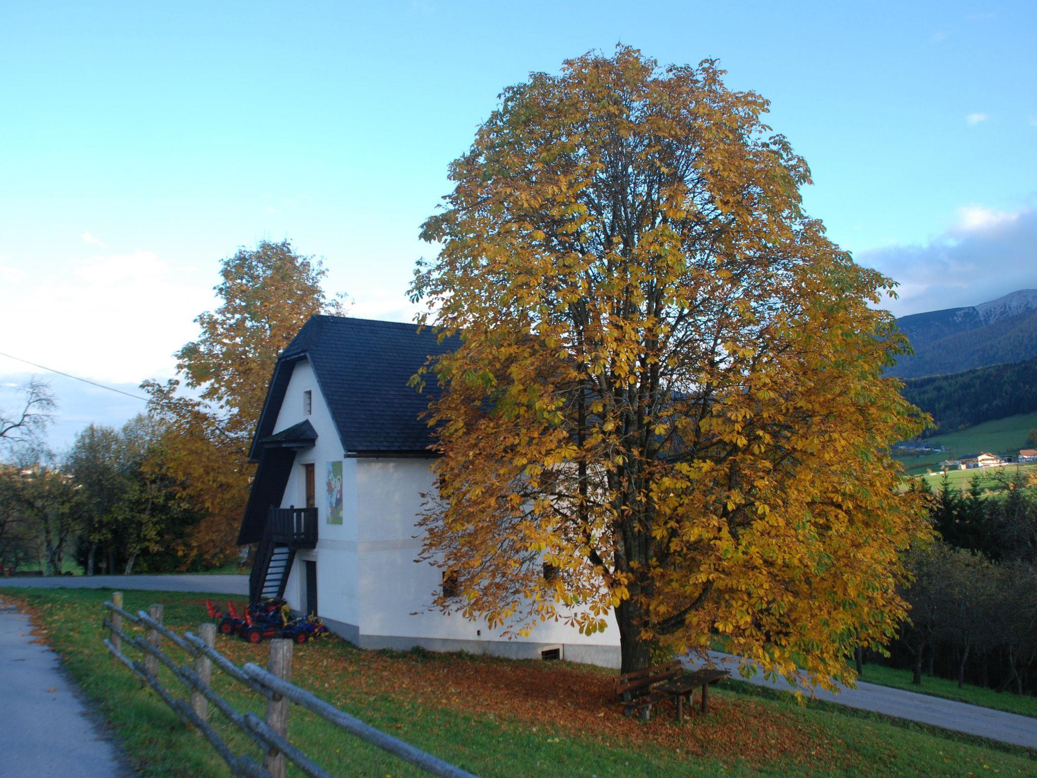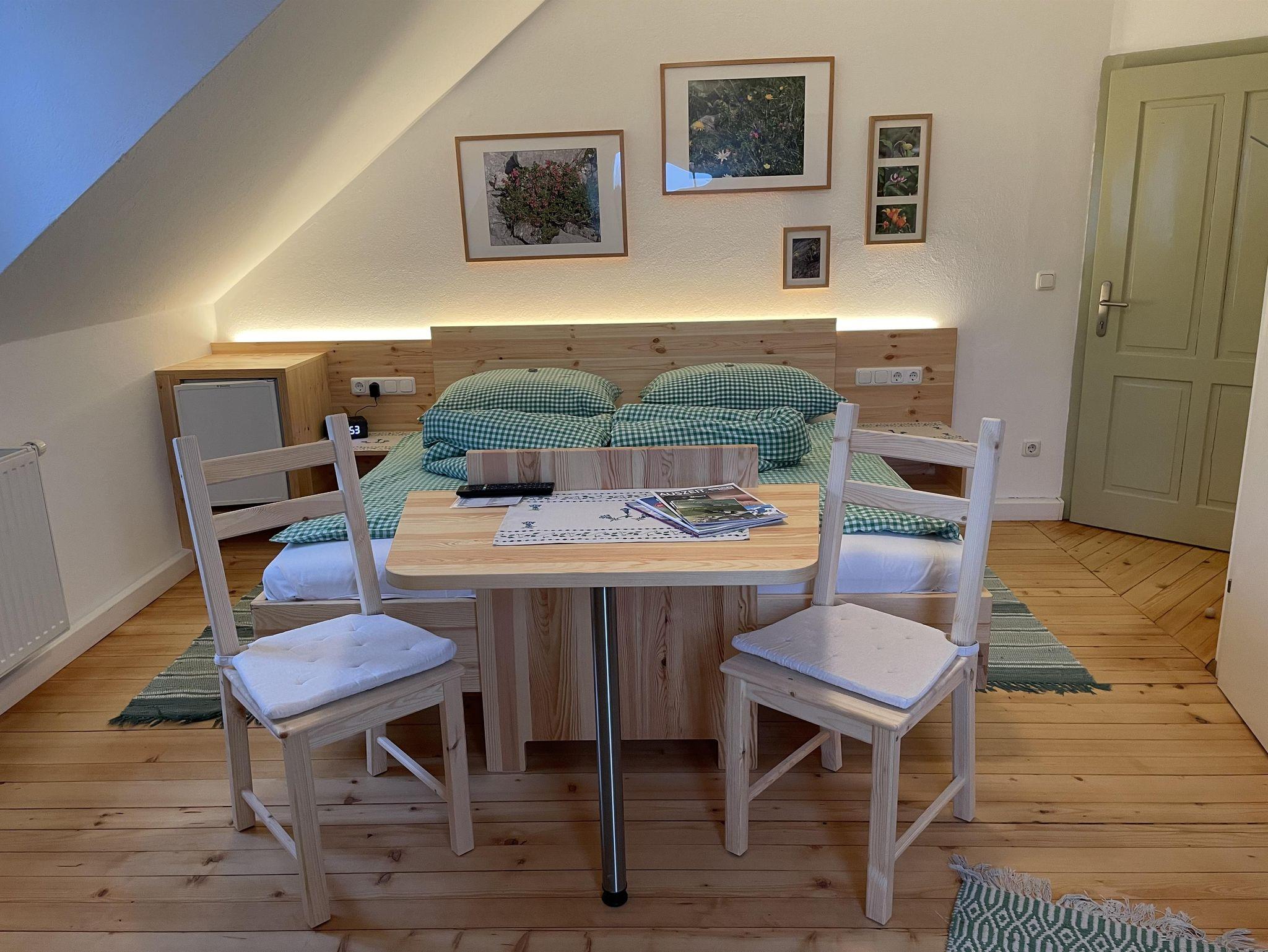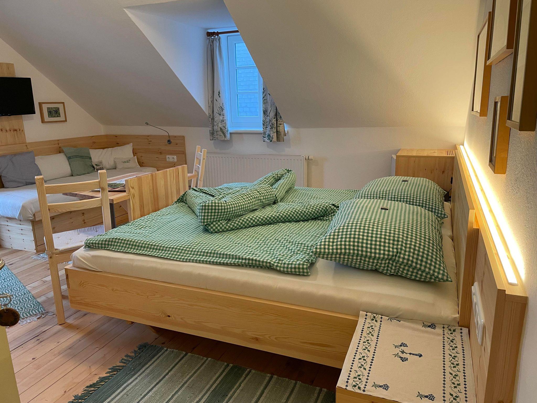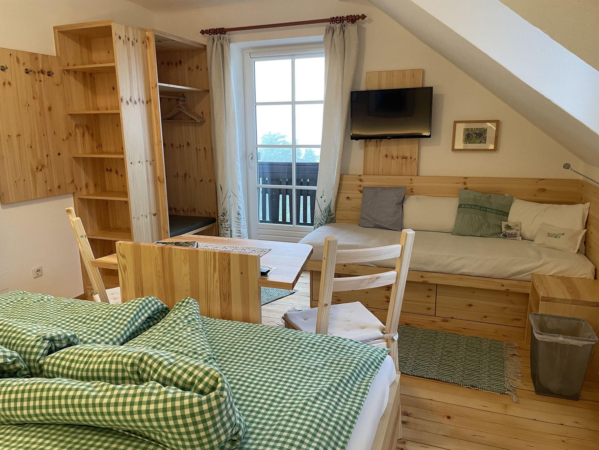 Das Zimmer hat einen schönen Ausblick auf das Dorf. Es ist hell und freundlich. Die rustikale Vollholzeinrichtung unterstreicht den bäuerlichen Stil. Das Badezimmer enthält selbstbemalte Fliesen mit Bauernhoftieren.