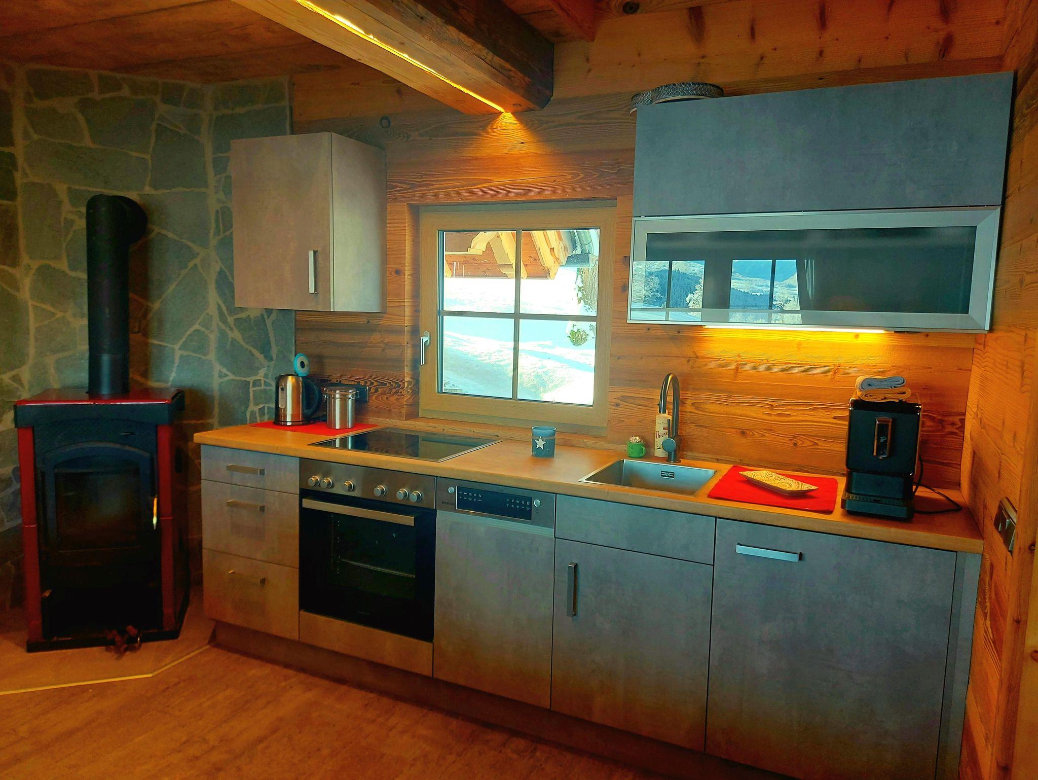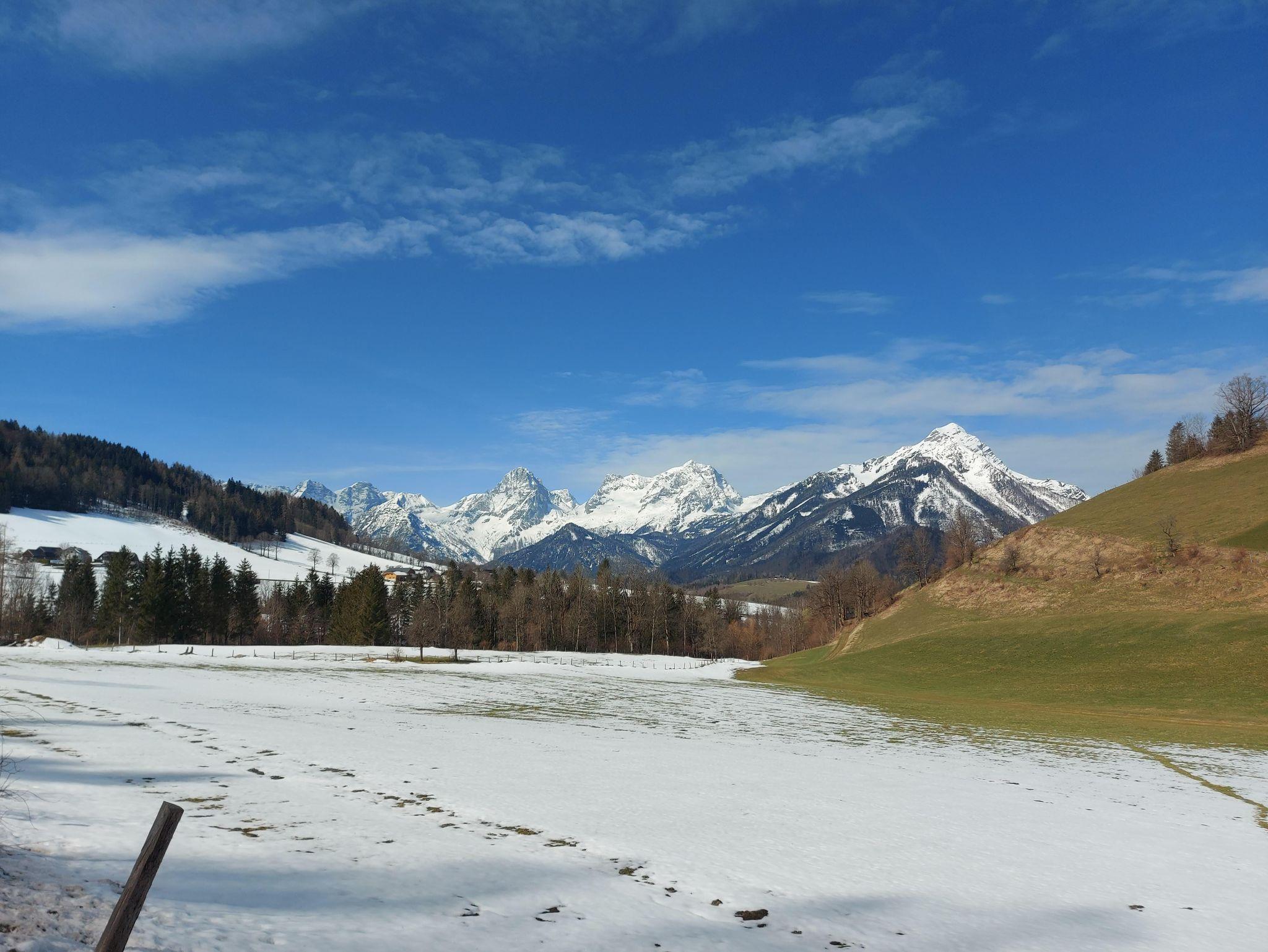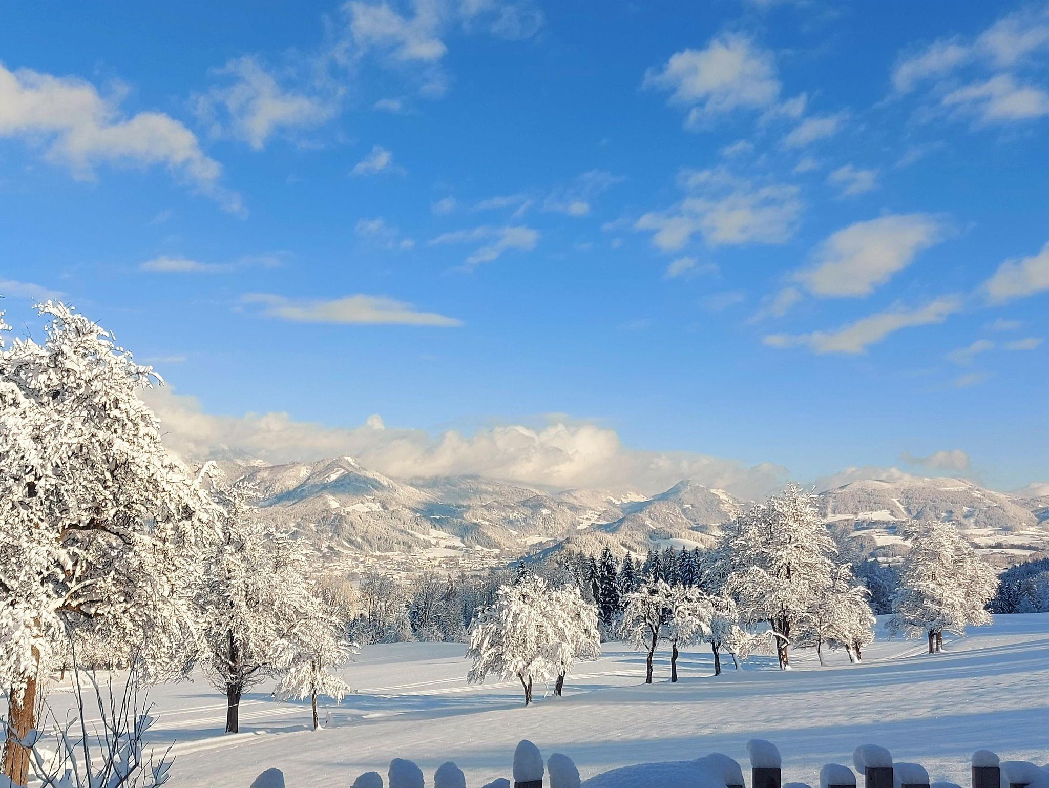 Genießen Sie das Knistern des Kaminfeuers in einer idyllischen Winterlandschaft umringt von Berggipfeln.