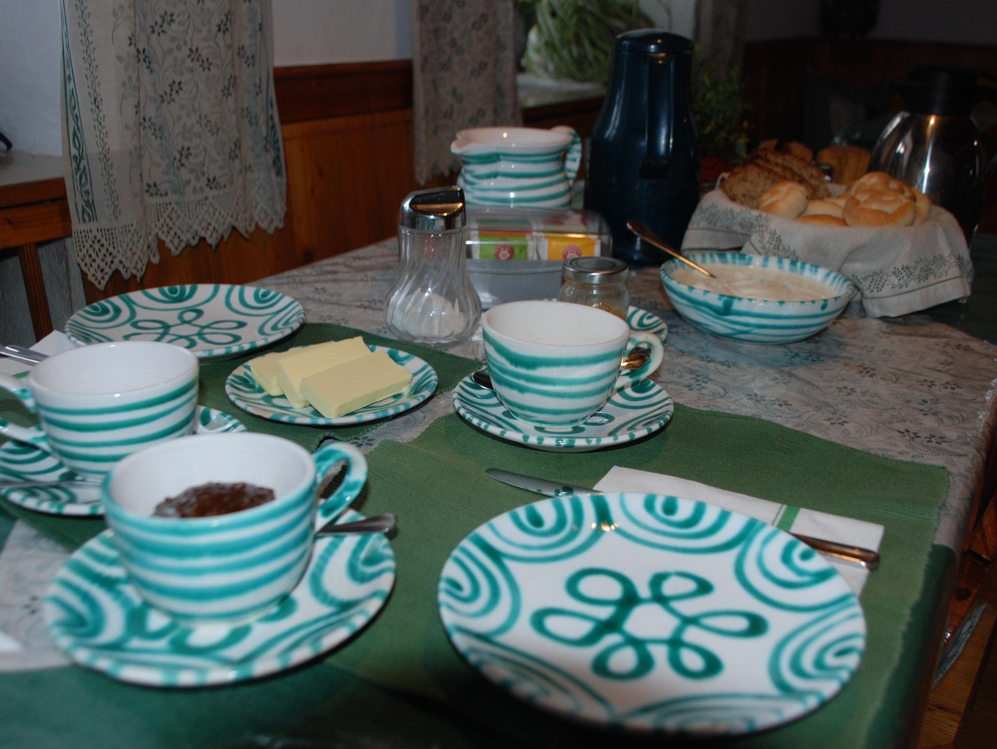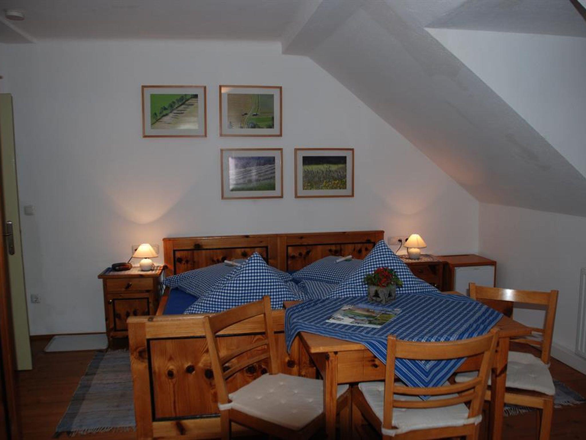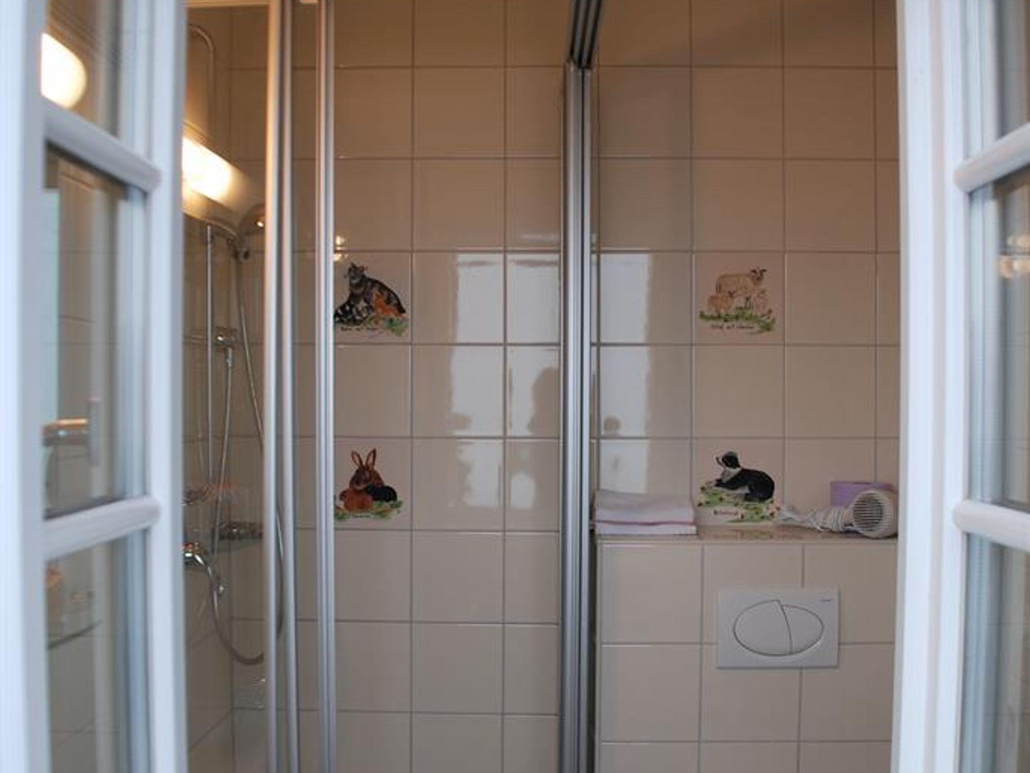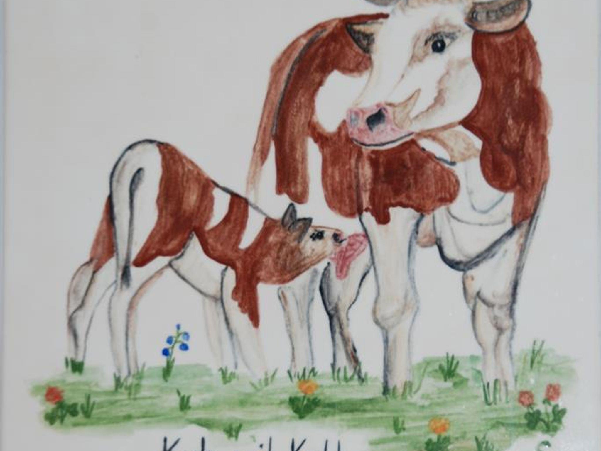 Das Zimmer hat einen schönen Ausblick auf das Dorf. Es ist hell und freundlich. Die rustikale Vollholzeinrichtung unterstreicht den bäuerlichen Stil. Das Badezimmer enthält selbstbemalte Fliesen mit Bauernhoftieren.
