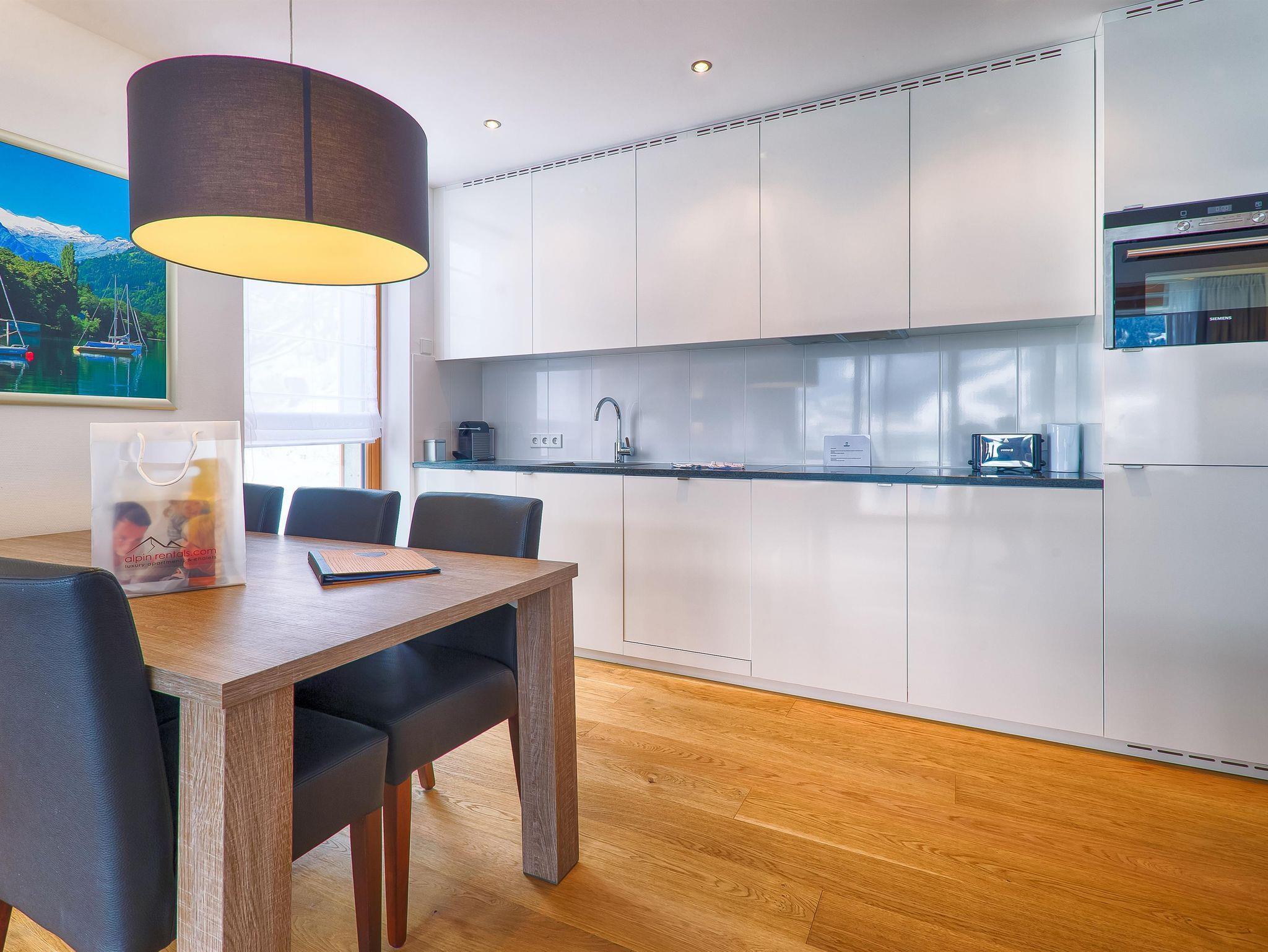 Das Apartment mit drei Schlafzimmern befindet sich auf der zweiten Etage der Residence Bellevue. Die Schlafzimmer sind jeweils mit einem Doppelbett ausgestattet. Zusätzlich gibt es ein Badezimmer mit Badewanne / Dusche und WC. Das geräumige Wohnzimmer verfügt über einen großen Esstisch und eine offene Designerküche. Am Balkon eröffnet sich ein atemberaubender Blick auf die Berge und den See.
