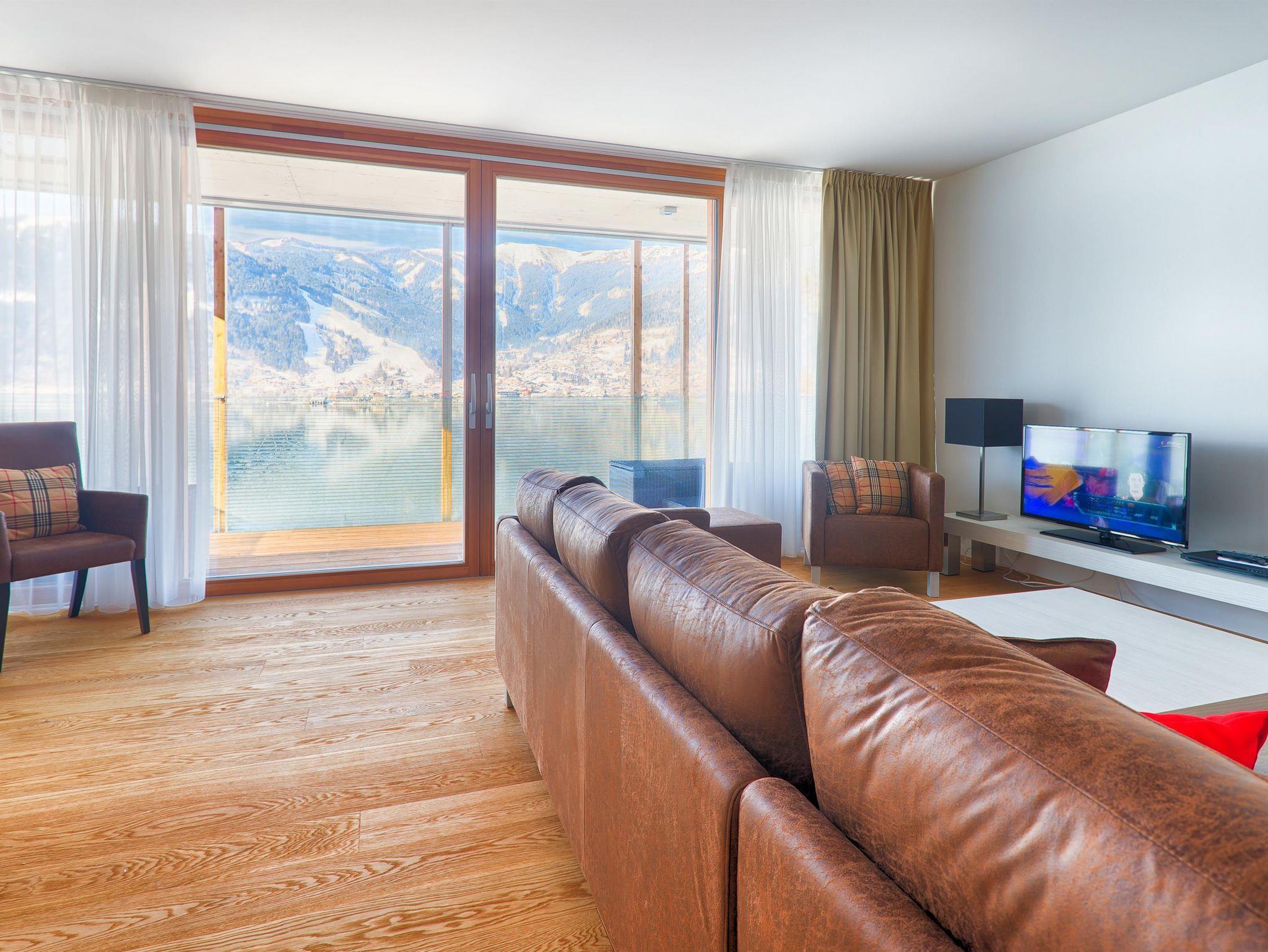 Erleben Sie das Bellevue-Gefühl: Die majestätische Schmittenhöhe umrahmt den klaren Zeller See direkt vor der Residenz. Entspannen Sie auf der eleganten Sonnenterrasse und genießen Sie den atemberaubenden Blick auf das Wasser und die umliegenden Berge.