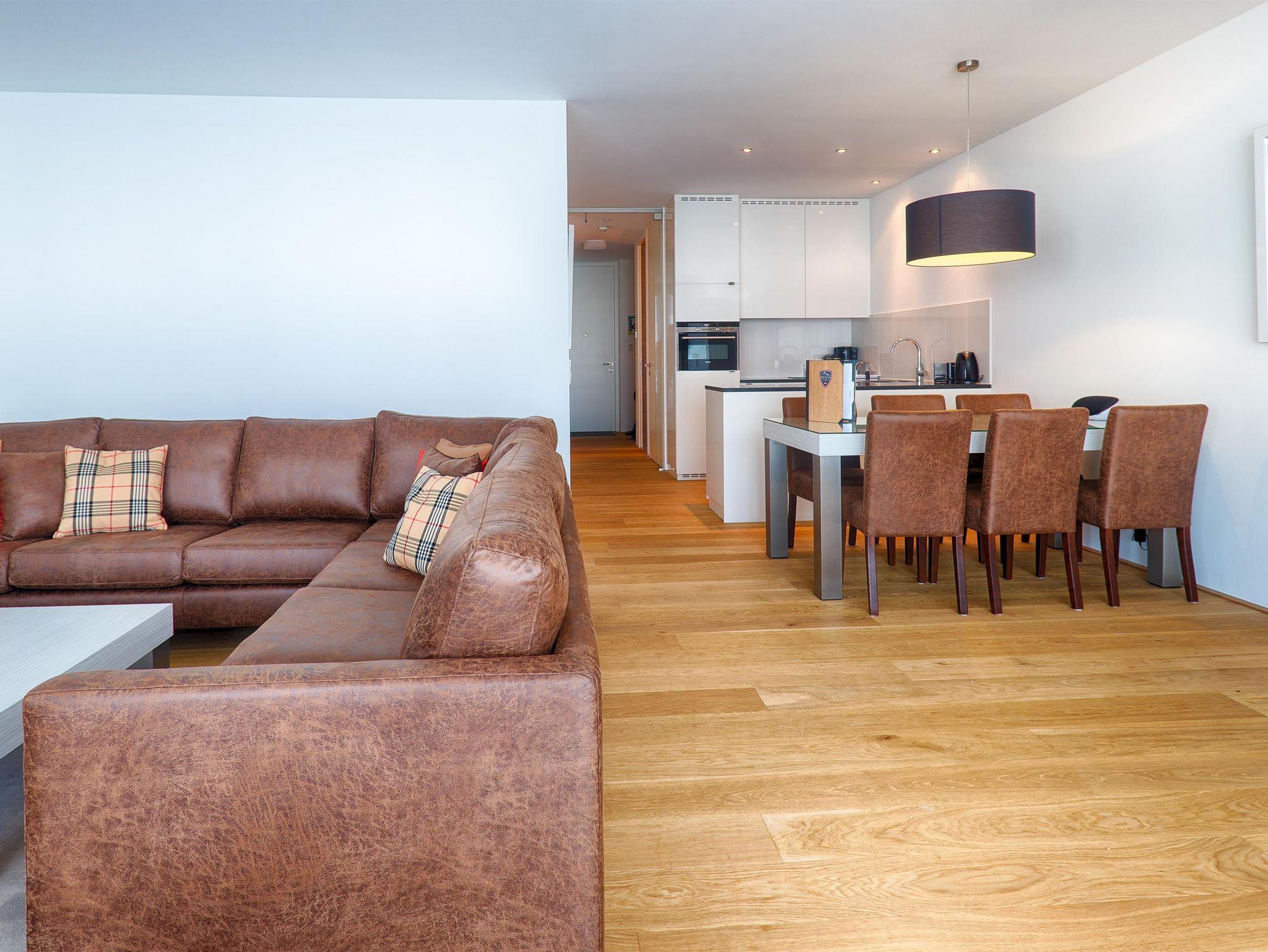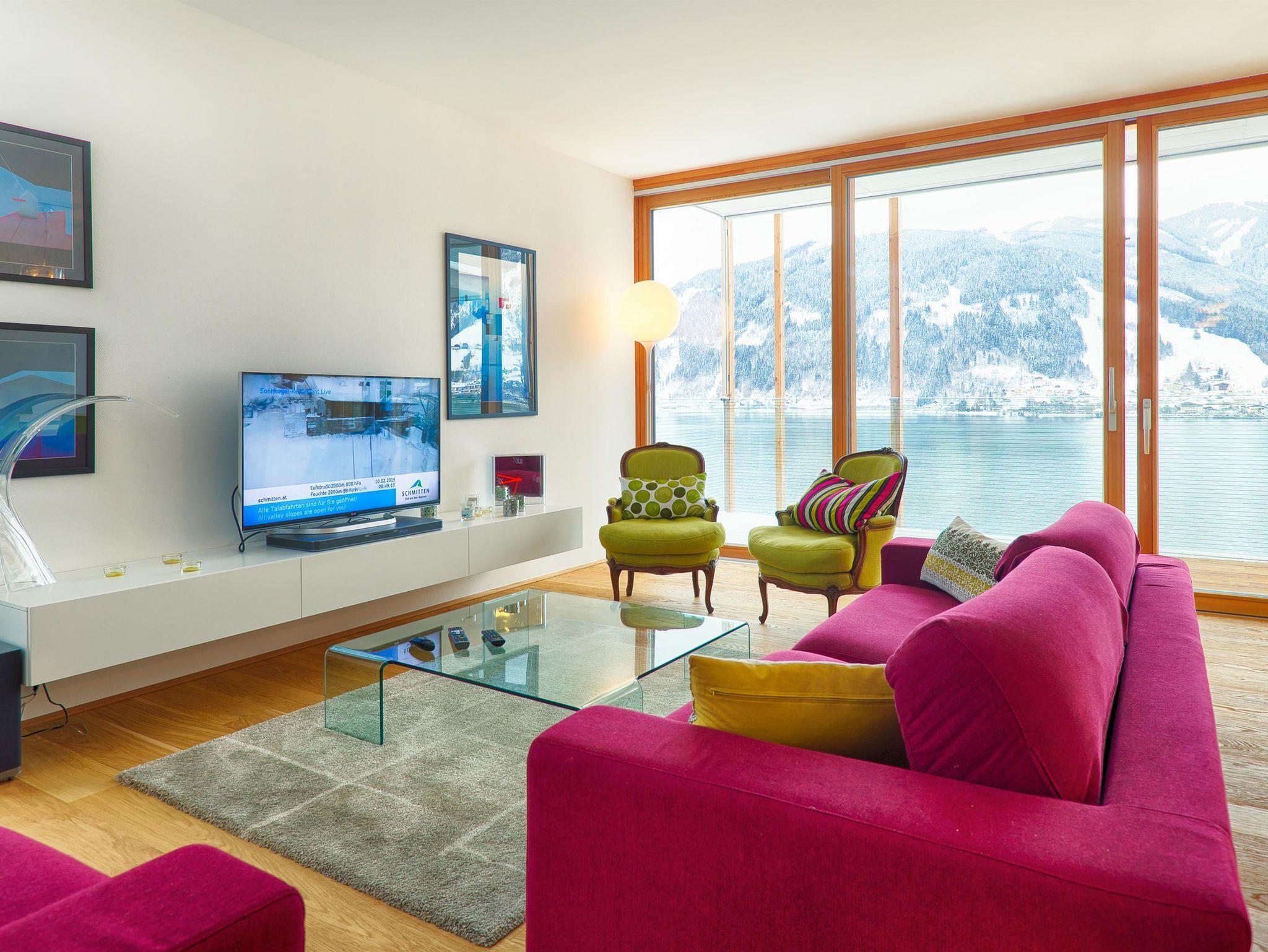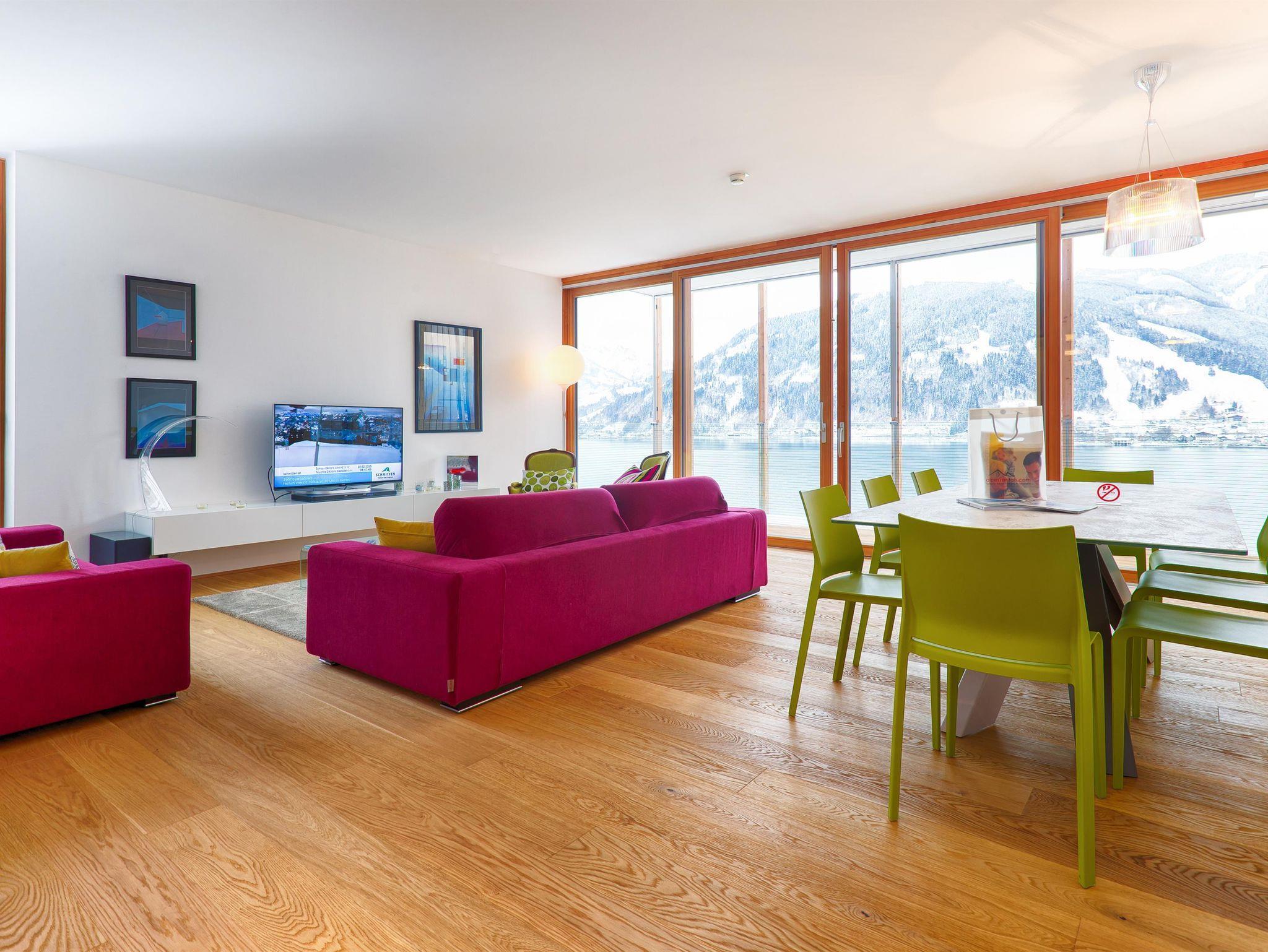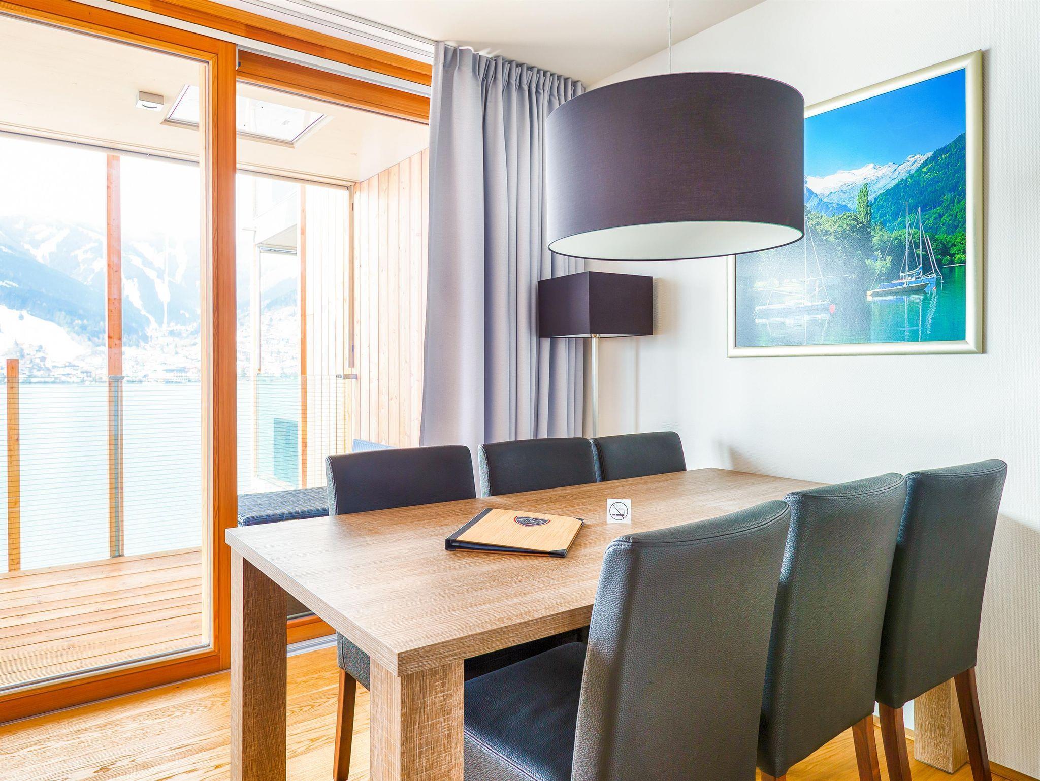 Das Apartment verfügt über zwei Schlafzimmer, mit jeweils einem Doppelbett, sowie zwei Badezimmer mit Badewanne oder Dusche und WC. Das geräumige Wohnzimmer verfügt über einen großen Esstisch und eine offene Designerküche. Vom Balkon aus genießt man einen herrlichen Blick auf den Zeller See.