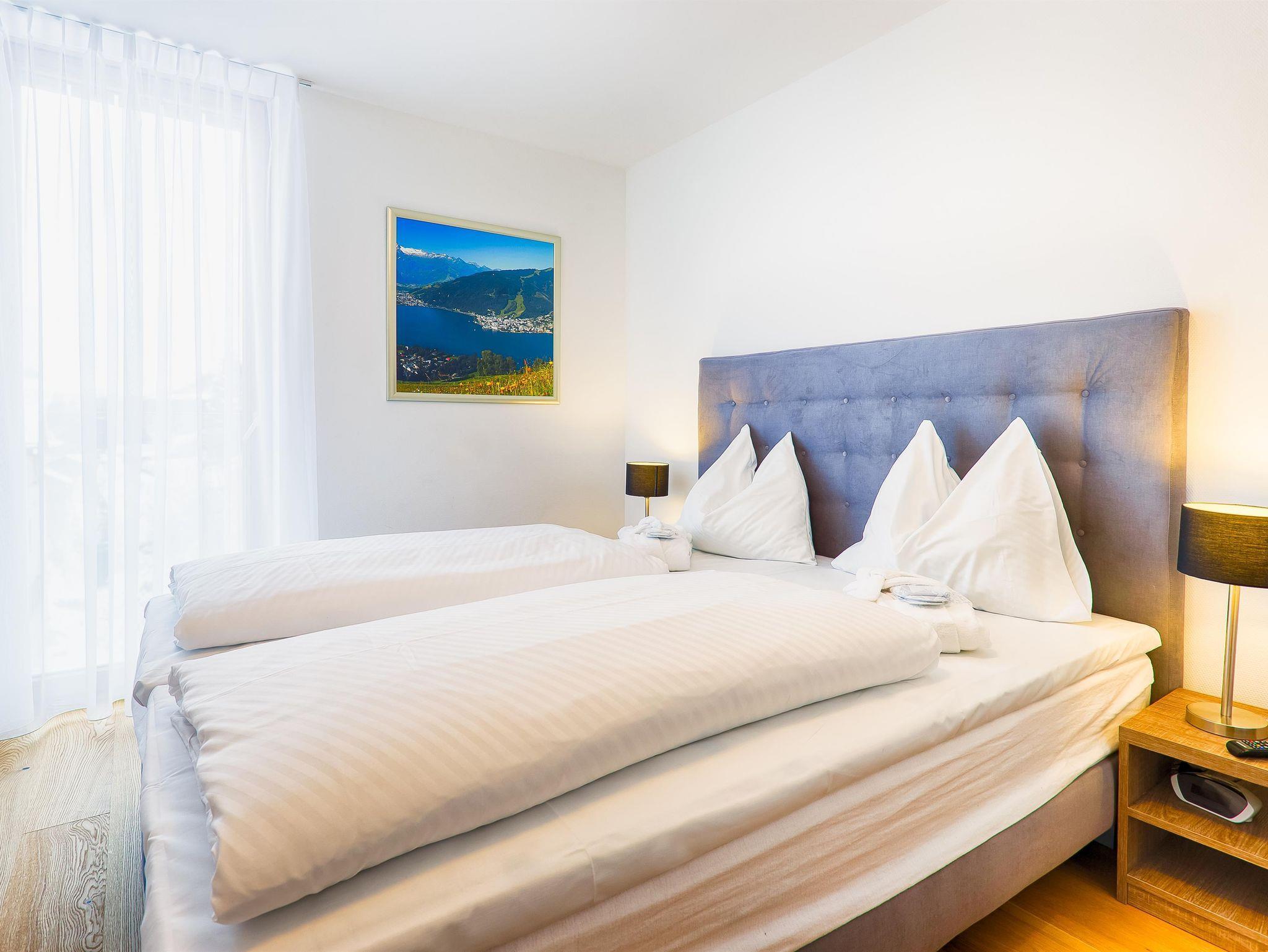 Das Apartment mit drei Schlafzimmern befindet sich auf der fünften Etage der Residence Bellevue. Die Schlafzimmer sind jeweils mit einem Doppelbett ausgestattet. Zusätzlich gibt es ein Badezimmer mit Badewanne / Dusche und WC. Das geräumige Wohnzimmer verfügt über einen großen Esstisch und eine offene Designerküche. Am Balkon eröffnet sich ein atemberaubender Blick auf die Berge und den See.
