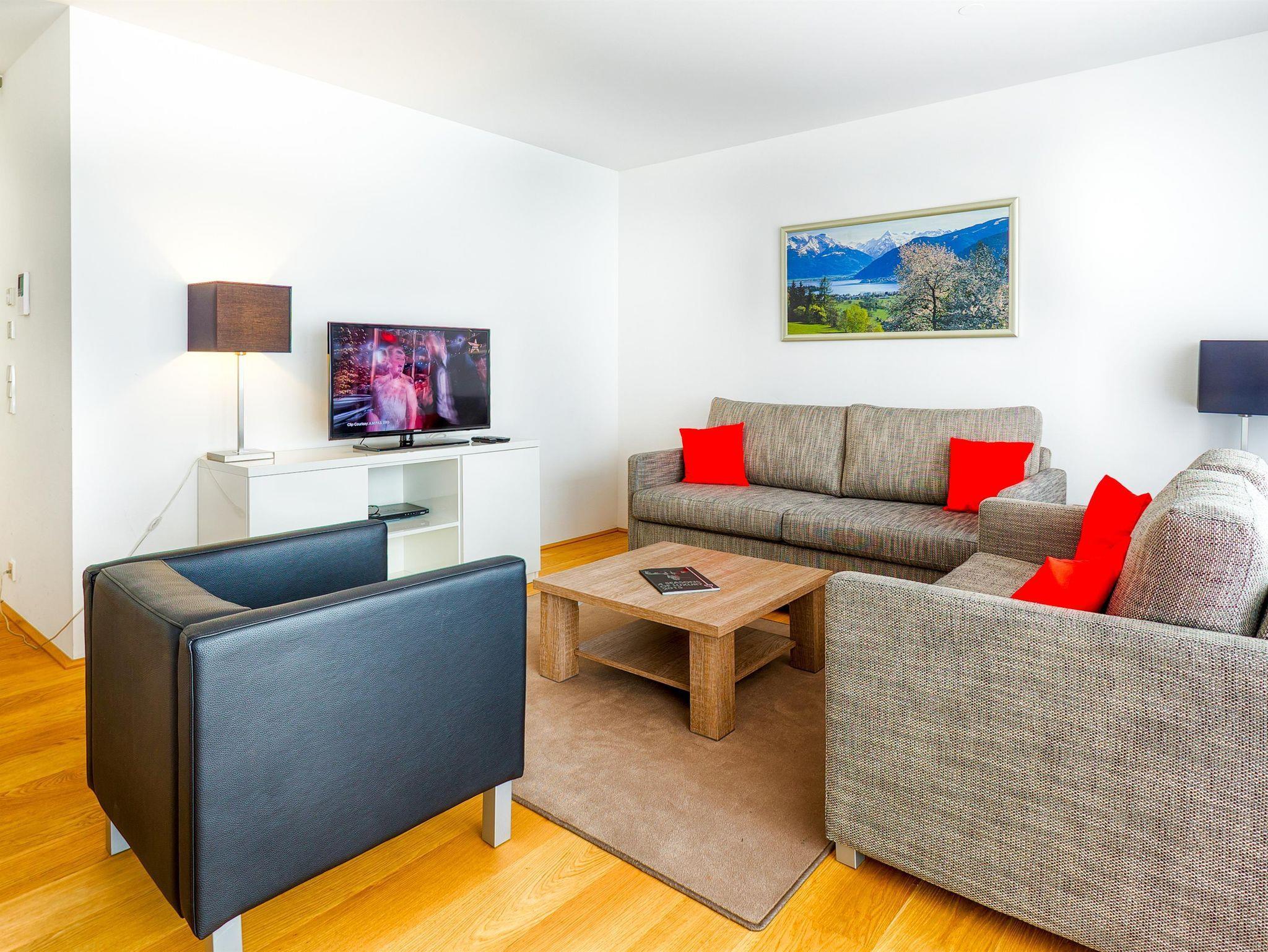 Erleben Sie das Bellevue-Gefühl: Die majestätische Schmittenhöhe umrahmt den klaren Zeller See direkt vor der Residenz. Entspannen Sie auf der eleganten Sonnenterrasse und genießen Sie den atemberaubenden Blick auf das Wasser und die umliegenden Berge.