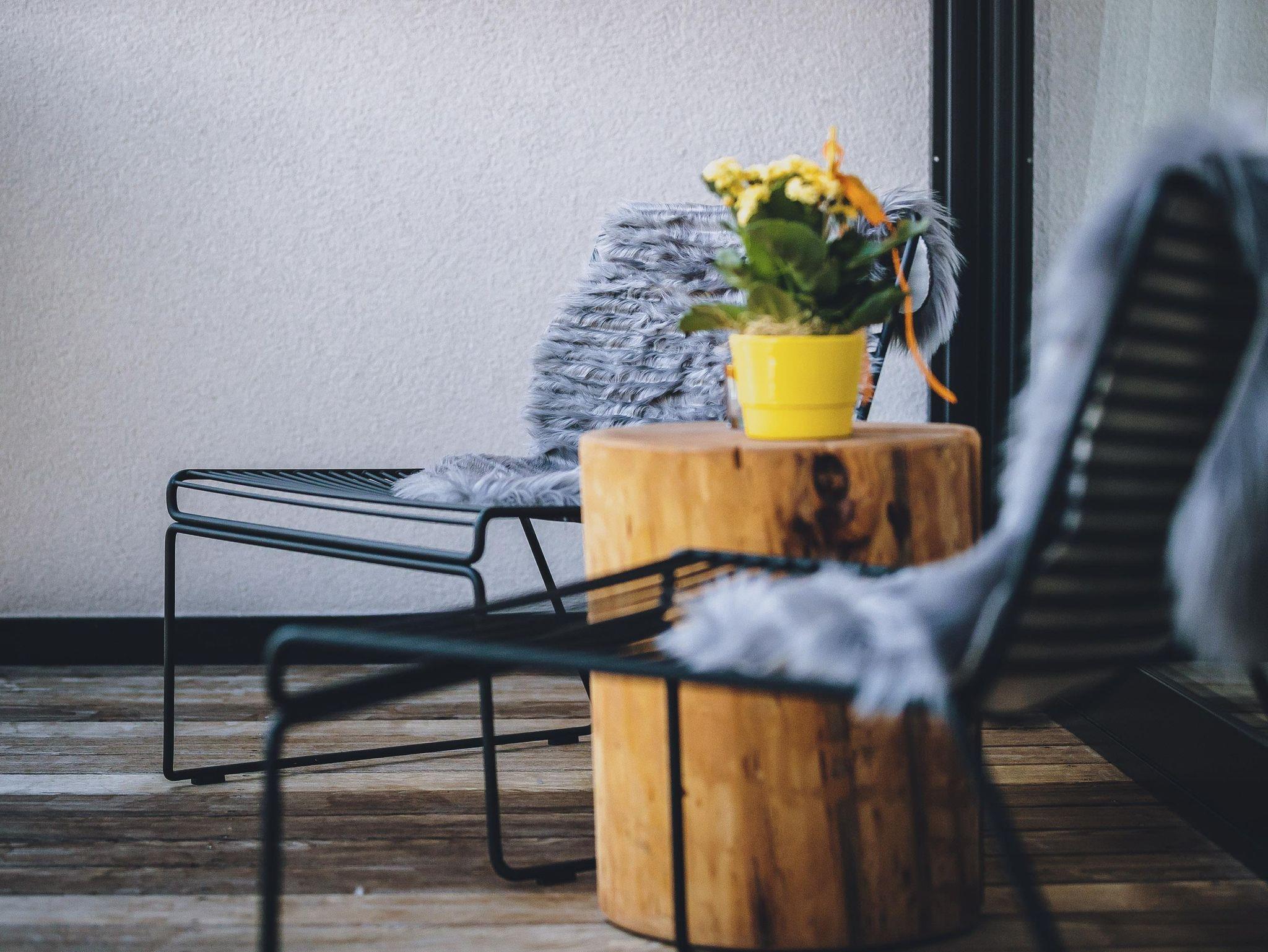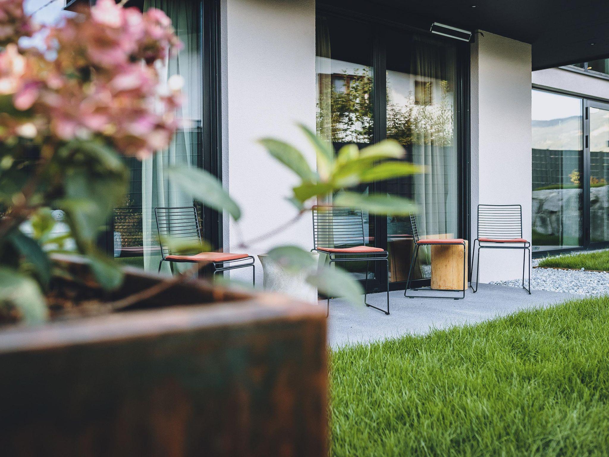 Der Balkon ist möbliert, bietet einen traumhaften Bergblick und lädt zum Verweilen ein.