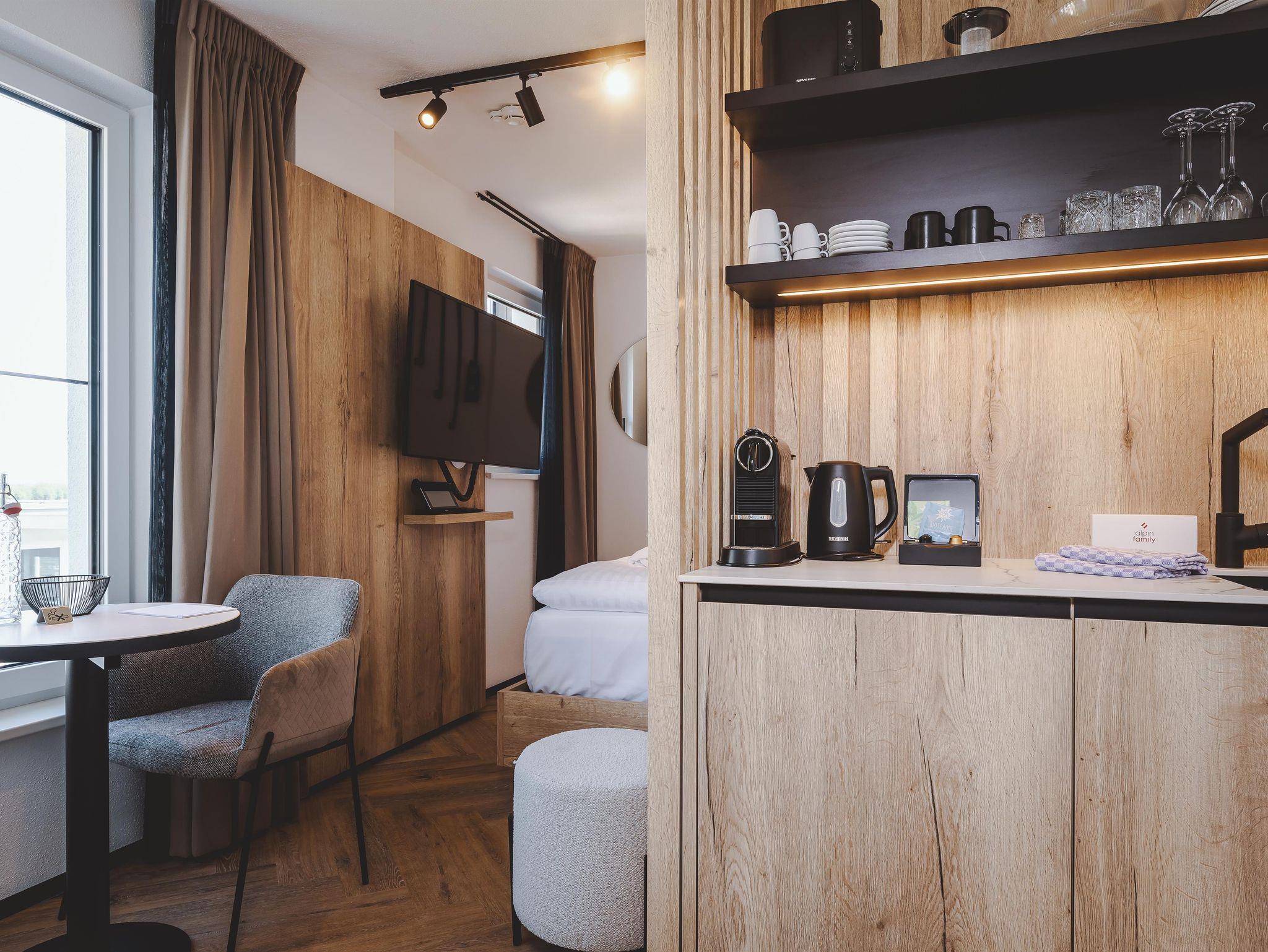 Unser großzügiges Classic Doppelzimmer ist ausgestattet mit einem gemütlichen Doppelbett. Neben dem Bad mit Dusche, findet man im Zimmer eine Anrichte mit Geschirr und Besteck, sowie einen Balkon.
