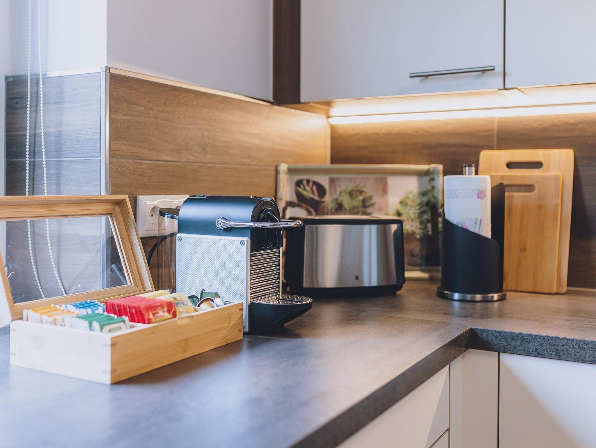 Die offene Küche bietet alles was unsere Gäste zum Zaubern ihrer Gerichte benötigen: Kühl/Gefrierschrank, Backofen, Spülmaschine, Geschirr/Besteck, Kochutensilien, Kaffeemaschine (Tabs), Toaster und einen Wasserkocher. Zentralheizung und klimatisierter Boden sorgen immer für die richtige Temperatur. Bügeleisen, Waschmaschine und Trockner sowie ein Parkplatz vor dem Haus komplettieren das Angebot.