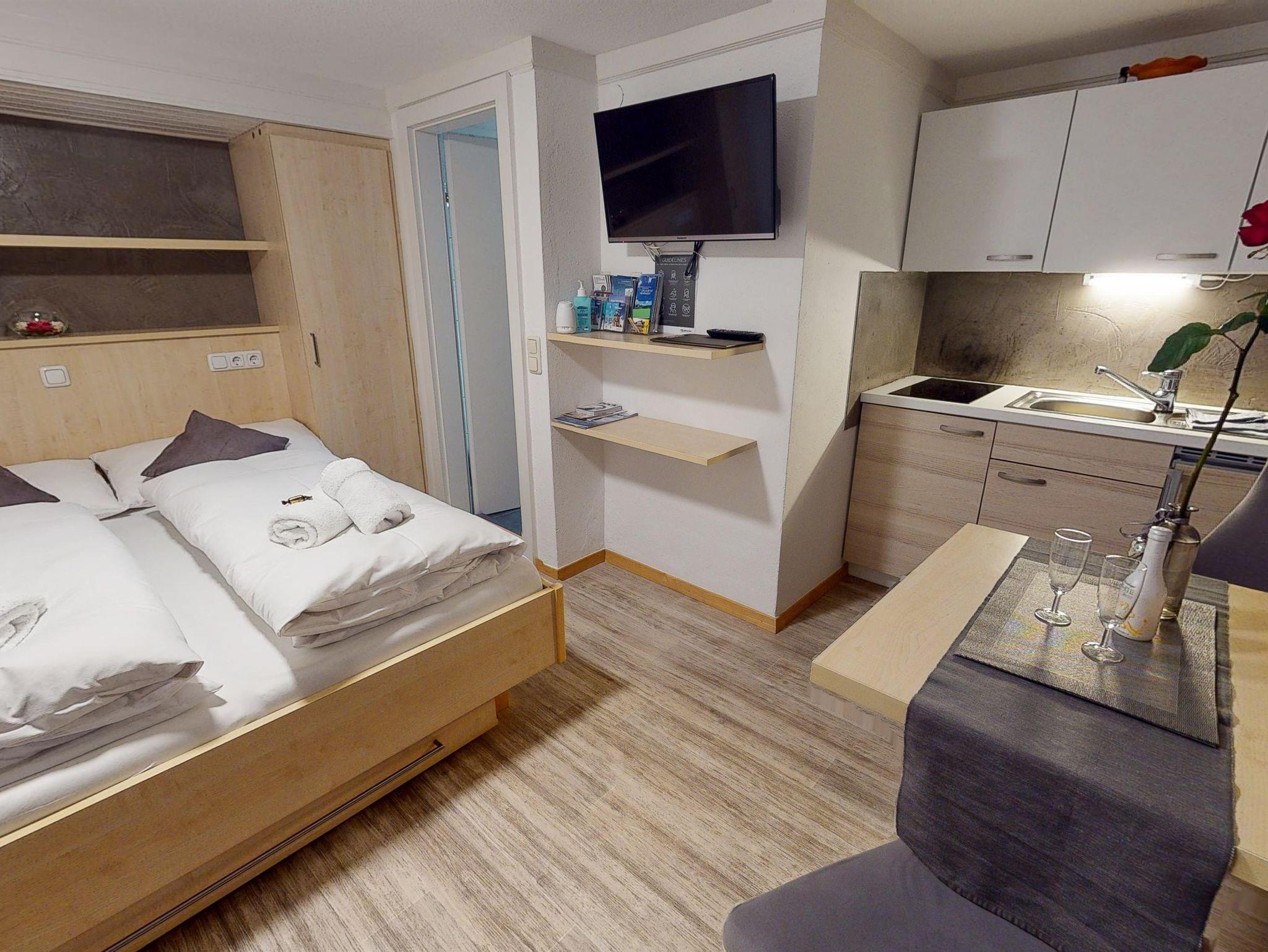 - ein Wohn-Schlafraum mit vollausgestatteter Küche, E-Herd, Backrohr, Geschirrspüler,Kaffeemaschine, Wasserkocher, Essecke, ausziehbarer Doppelcouch, Kabel-TV, Wifi und großen Balkon mit See-Panoramablick -