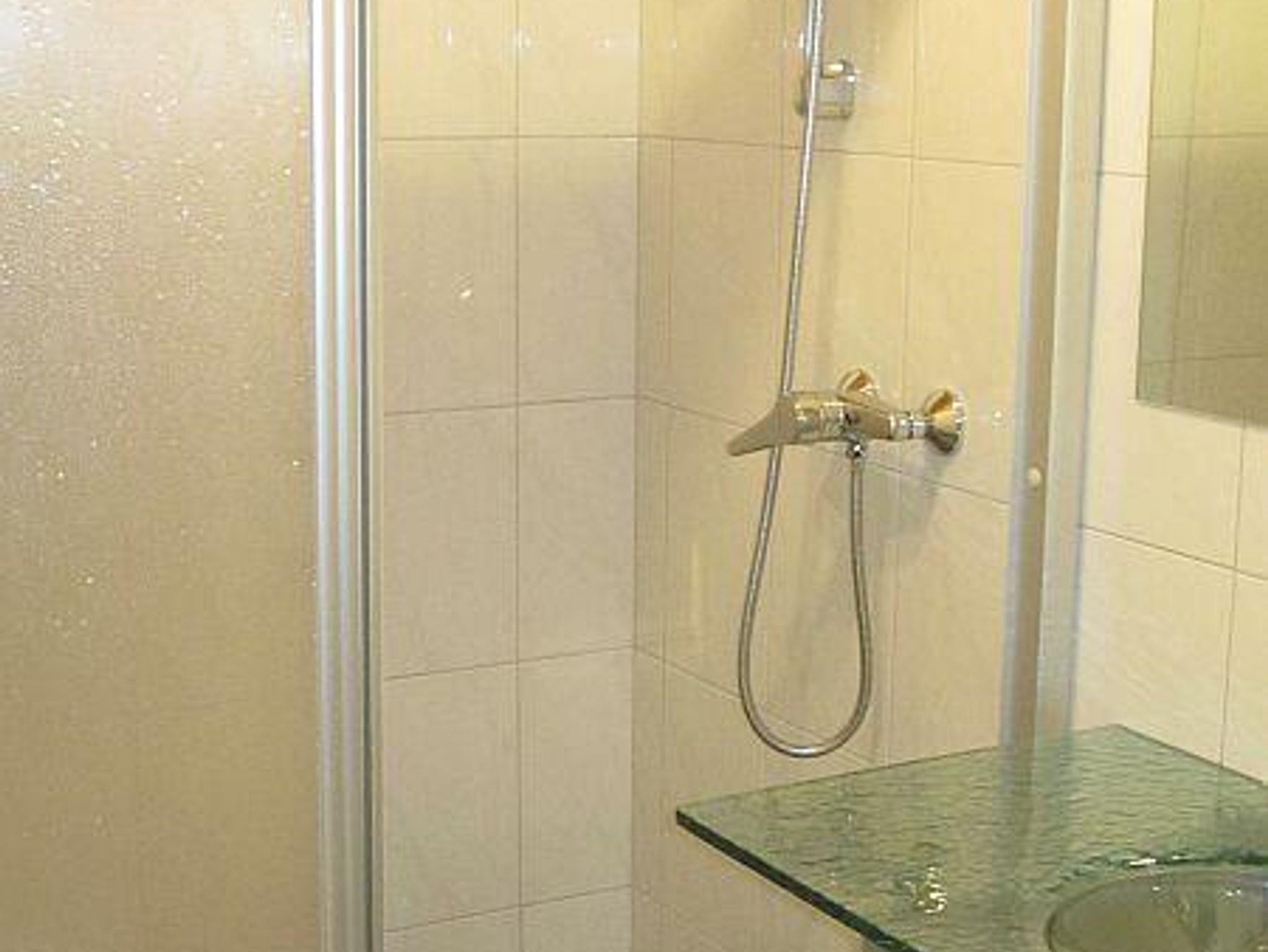 * Badezimmer mit Dusche, Waschbecken und Haartrockner