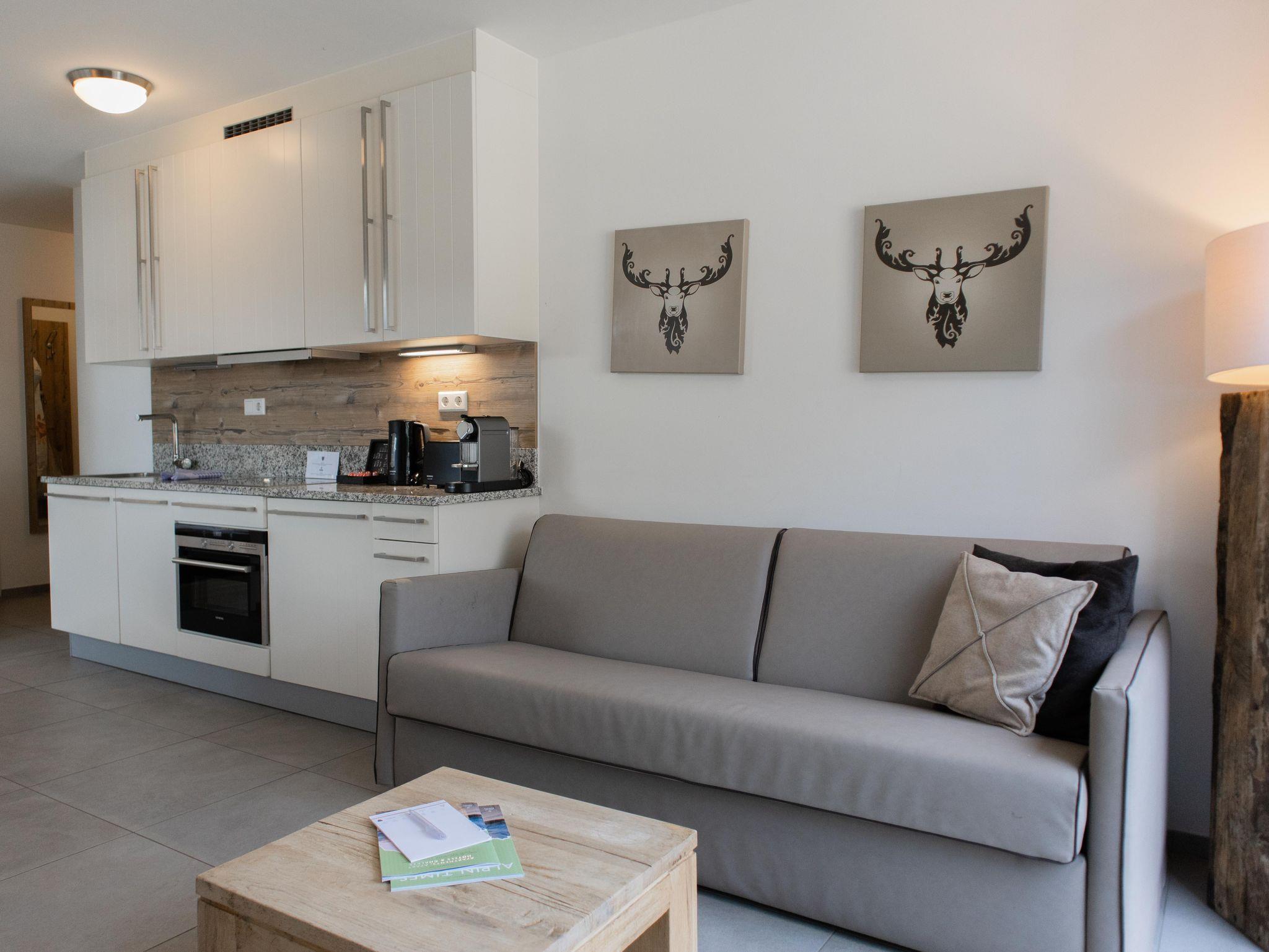 Das Apartment mit zwei Schlafzimmern befindet sich im ersten Stock der Ski & Golf Suites. Die zwei Schlafzimmer sind jeweils mit einem Doppelbett ausgestattet und es gibt zwei Badezimmer. Das geräumige Wohnzimmer verfügt über einen großen Esstisch und eine offene Designer Küche. Die gemütliche Sitzecke bietet ein bequemes Sofa-Bett. Der Balkon ist vom Wohnzimmer aus zugänglich.