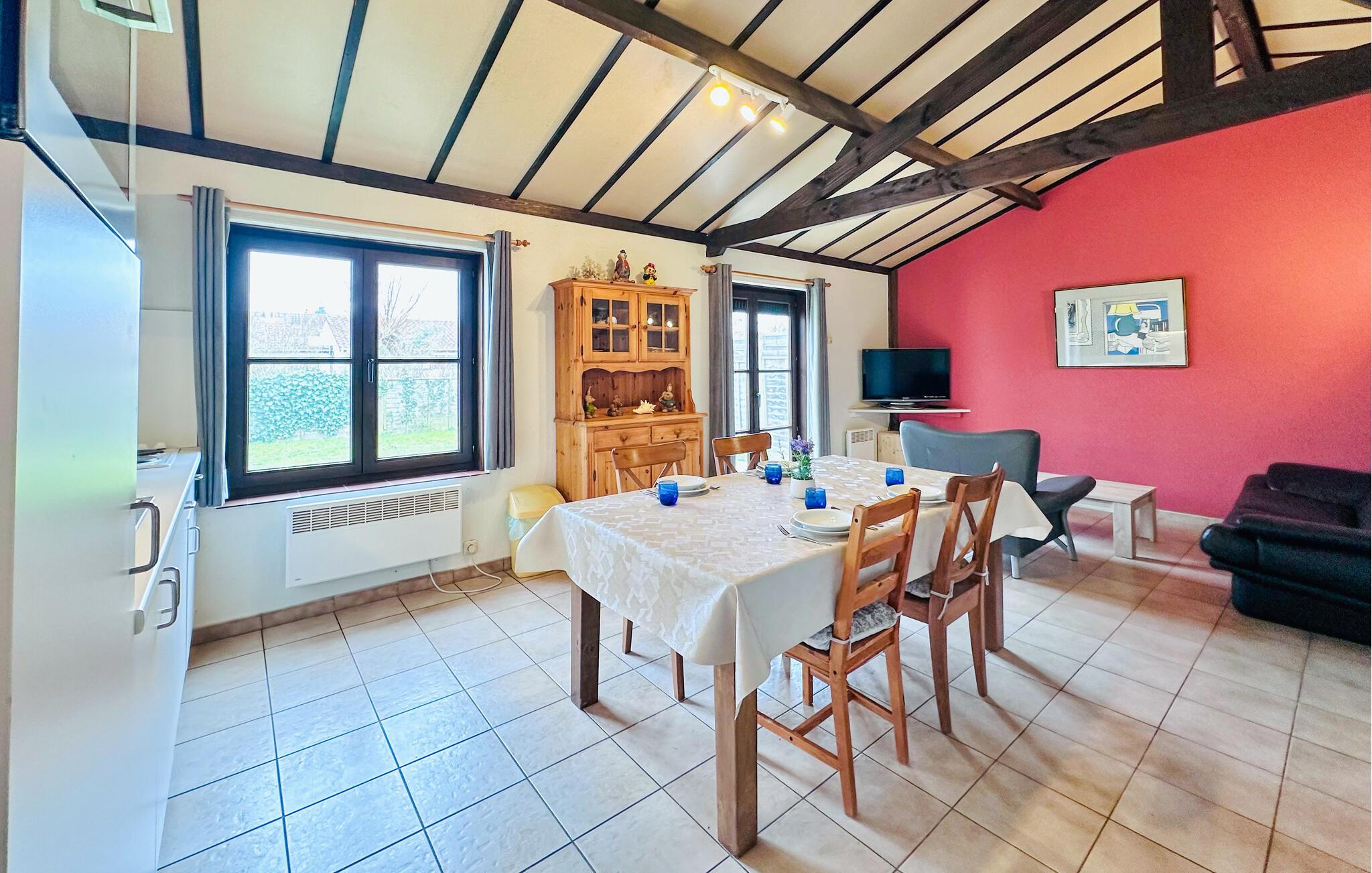 In Ihrem kompakten Ferienhaus finden Sie alles Nötige für einen angenehmen Familienurlaub vor. Beginnen Sie den Tag in der kleinen, praktischen Küche, wo Sie gemeinsam das Frühstück zubereiten können. Genießen Sie anschließend bei einer morgendlichen Tasse Kaffee gesellige Momente am Esstisch. Die einladende Sofaecke mit Blick auf den Garten schafft den idealen Rahmen für heitere Spielerunden oder für Entspannung bei einem behaglichen Filmabend. Draußen erwartet Sie die Möglichkeit, in einer schönen Atmosphäre zu fröhlichen Abenden beim Grillen zusammenzukommen.