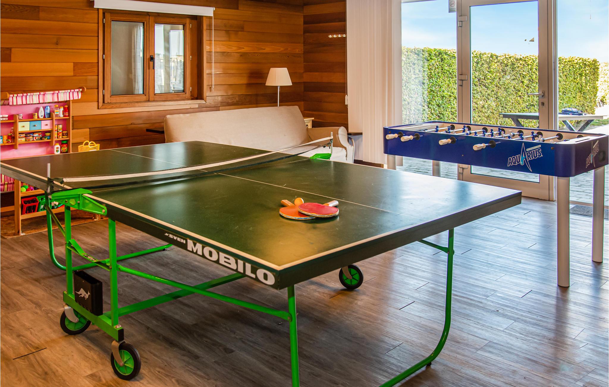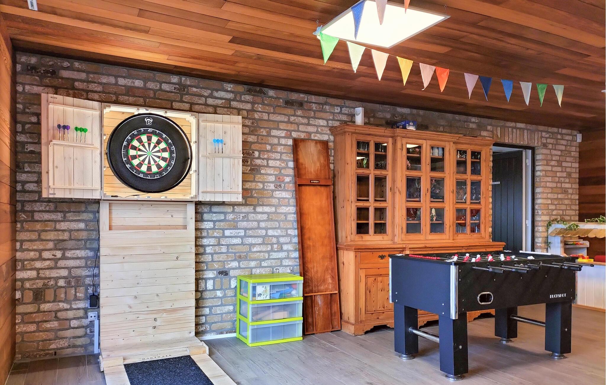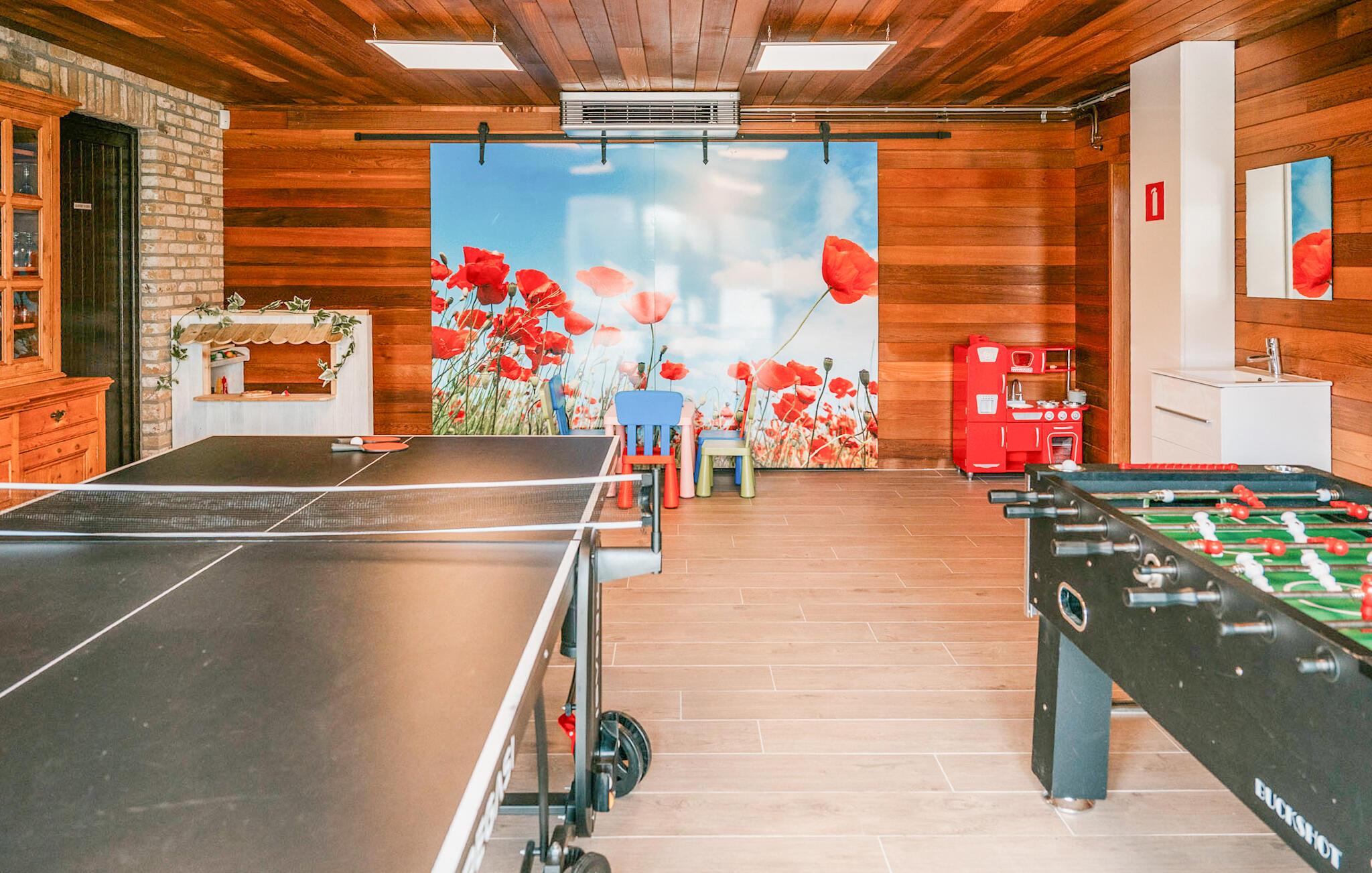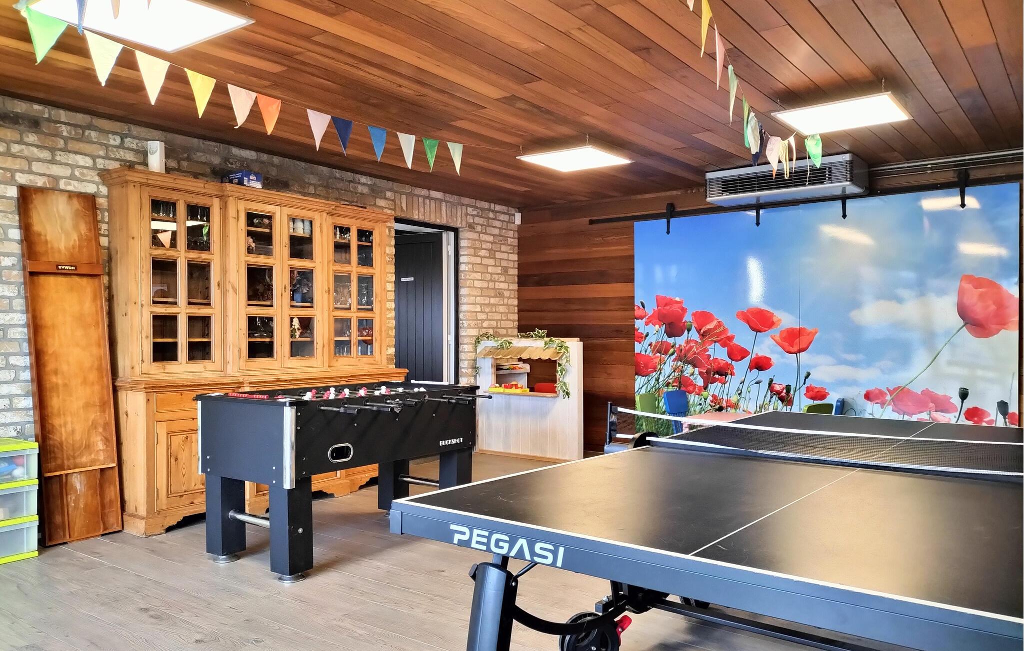 Die ganze Gruppe wird mit allen Aktivitäten, die im Inneren zu finden sind, sehr zufrieden sein. Genießen Sie nach einem aktiven Tag in der attraktiven Umgebung den angenehmen Wellnessbereich mit beheiztem Swimmingpool, Whirlpool, Sauna und Dampfbad. Dann ist natürlich Zeit für Unterhaltung im großen Aktivitätsraum mit Tischfußball, Tischtennis und Gesellschaftsspielen. Die Gruppenunterkunft verfügt außerdem über eine sehr gut ausgestattete Großküche für die ganze Gruppe und einen großen Raum mit gemütlicher Bar, wo die ganze Gruppe zusammensitzen kann. Mit Beamer und Leinwand eignet sich dieser Raum auch besonders gut für Meetings und Präsentationen. Durch die besondere Atmosphäre und den Luxus eignet sich dieses Ferienhaus das ganze Jahr über für einen Urlaub, aber auch für einen festlichen Anlass.