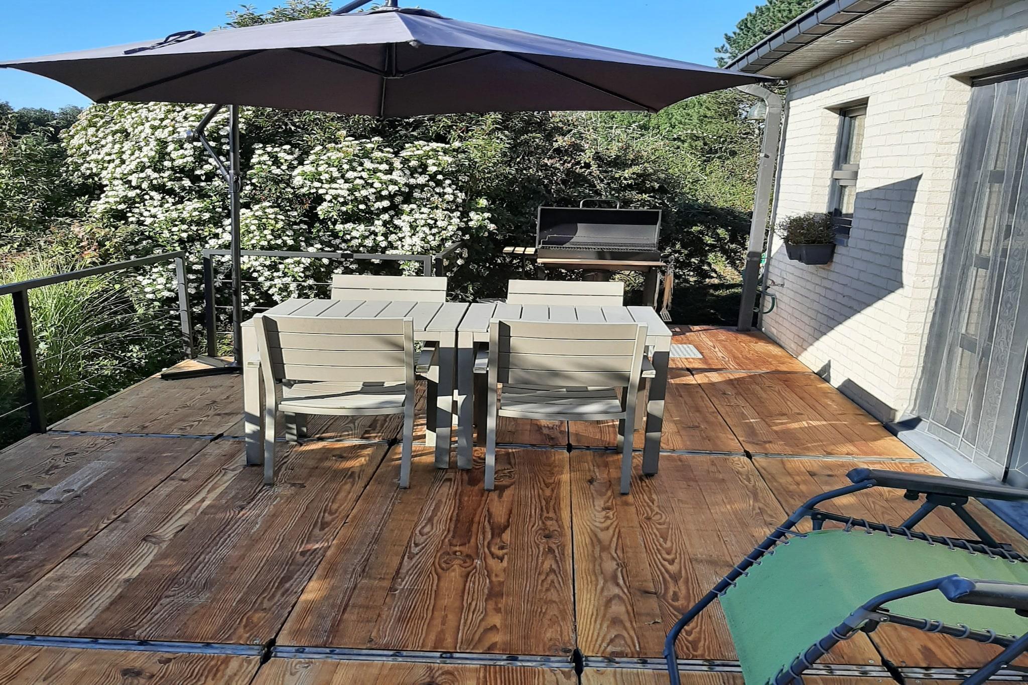 Parterre: (offene Küche(Toaster, Kochherd(4 Kochplatten, Ceranfeld), Dunstabzugshaube, Kaffeemaschine(Filter, pads), Backofen, Mikrowelle, Spülmaschine, Kühl-/Gefrierkombination), Wohn/Esszimmer(TV, Esstisch(4 Personen), Sitzecke, Radio), Schlafzimmer(Doppelbett(140 x 200 cm)), Badezimmer(Dusche, Waschbecken, Toilette, Heizung), Terrasse(alleinige Nutzung, 30 m2)) Heizung(durch Klimaanlagen), Klimaanlage, Garten, Gartenmöbel, Grill, Parkplatz, Sonnenschirm