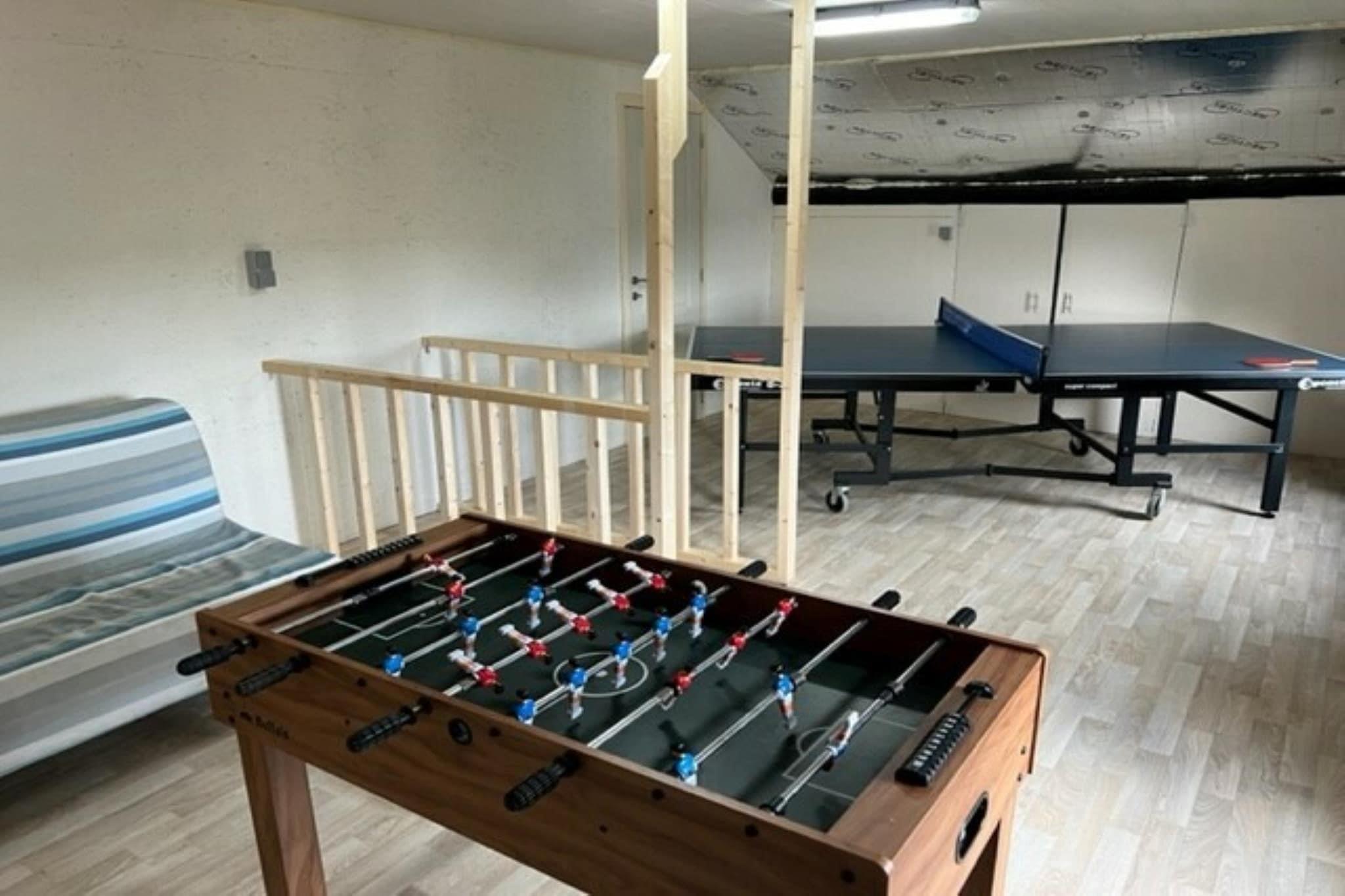 Parterre: (Eingangshalle, Aufenthaltsraum(TV, Kaminofen, Sitzecke), Esszimmer(Esstisch), Küche(Wasserkocher, Kochherd, Dunstabzugshaube, Kaffeemaschine, Backofen, Mikrowelle, Spülmaschine, Kühl-/Gefrierkombination, Hochstuhl), Toilette(Waschbecken), Waschraum(Waschmaschine, Bügeleisen, Trockenschrank), Terrasse) In der 1. Etage: (Schlafzimmer(Doppelbett), Schlafzimmer(Doppelbett), Schlafzimmer(Einzelbett, Doppelbett), Badezimmer(Badewanne, Dusche, Waschbecken, Waschbecken, Toilette)) Dachgeschoss: (Spielzimmer(Sitzecke, Tischtennisplatte, Tischfußball)) Freizeitraum, Carport, Babybett, Badewanne oder Dusche, Whirlwanne, Hottub, Sauna, Heizung, Terrasse, Garten, Gartenmöbel, Grill, Parkplatz, Trampolin, Sonnenschirm, Kinderbett, Bügelbrett, Gesellschaftsspiele
