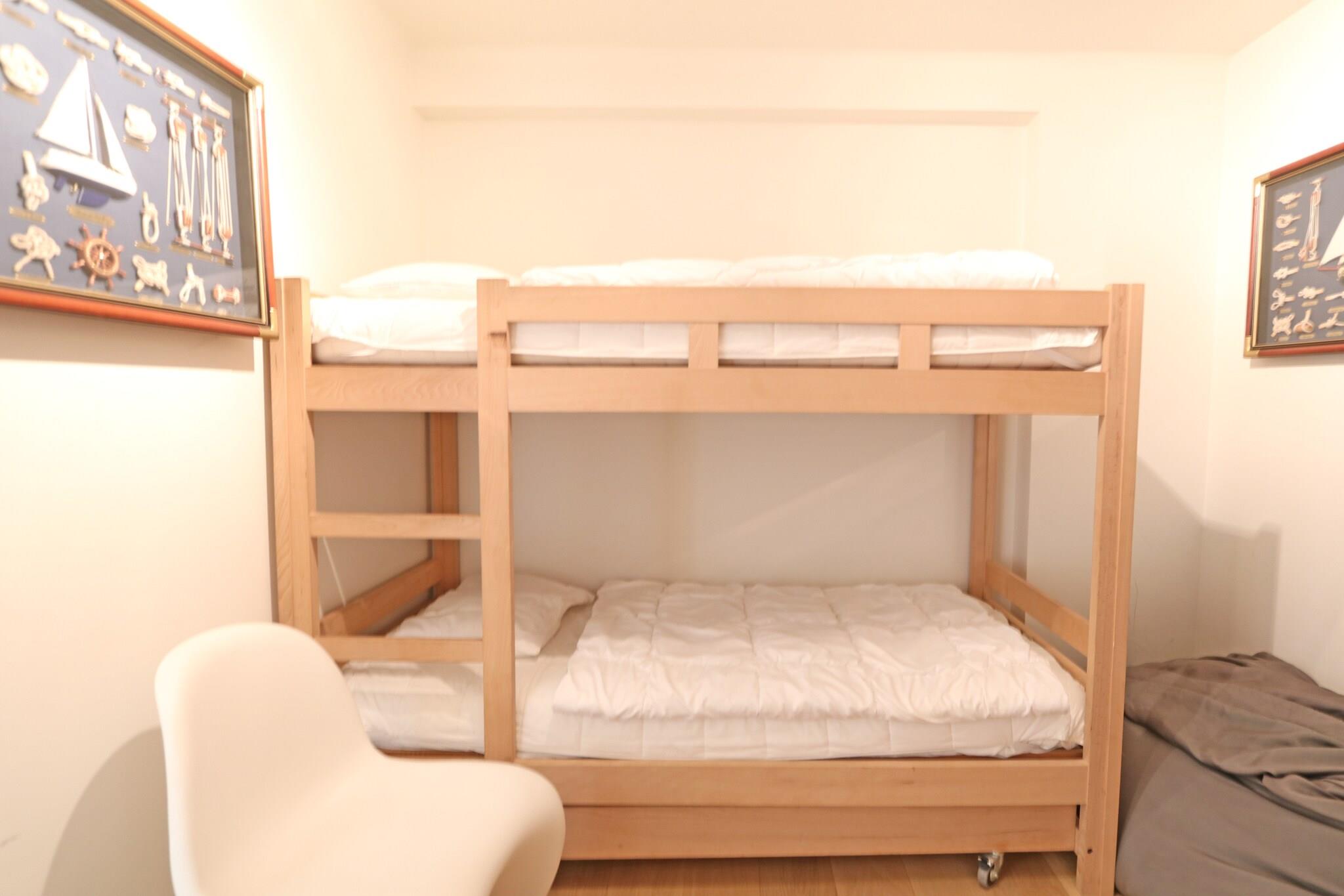 In der 5. Etage: (offene Küche(Kochplatte(Ceranfeld, Induktion), Kaffeemaschine(cups, Filter), Backofen, Kombi-Mikrowelle, Mikrowelle, Spülmaschine, Kühl-/Gefrierkombination, Mixer), Wohn/Esszimmer(TV(Flatscreen, digital), Esstisch, Sitzecke, Gasofen), Schlafzimmer(Doppelbett(Doppelbettdecke)), Schlafzimmer(Doppelbett(Doppelbettdecke)), Schlafzimmer(Etagenbett(Bettdecke)), Badezimmer(Dusche, Waschbecken), Badezimmer(Badewanne mit Dusche, Waschbecken, Toilette), Toilette(Toilette)) Trockner, Waschmaschine, Fahrradabstellraum, Parkplatz, Aufzug, Sea view