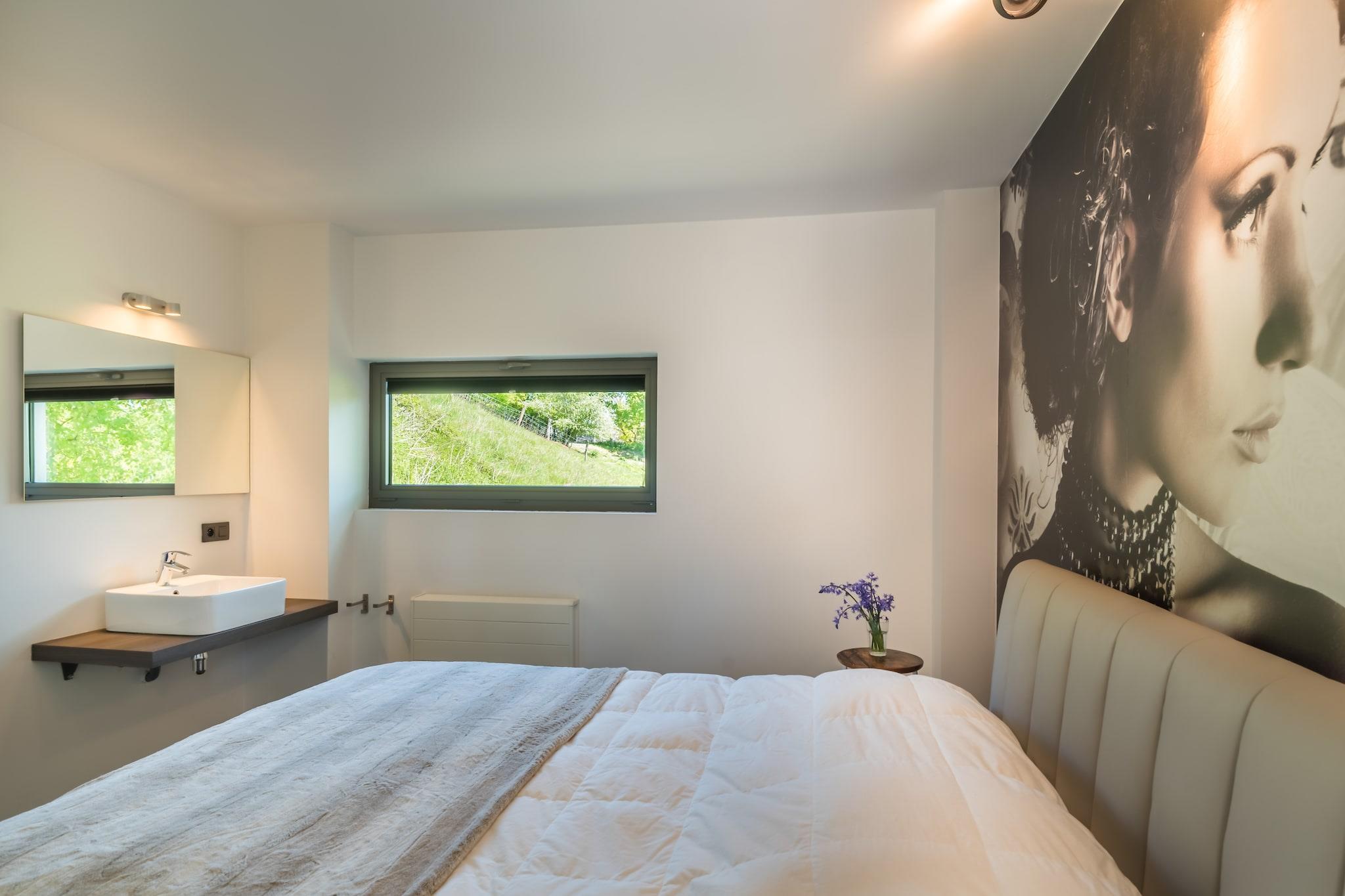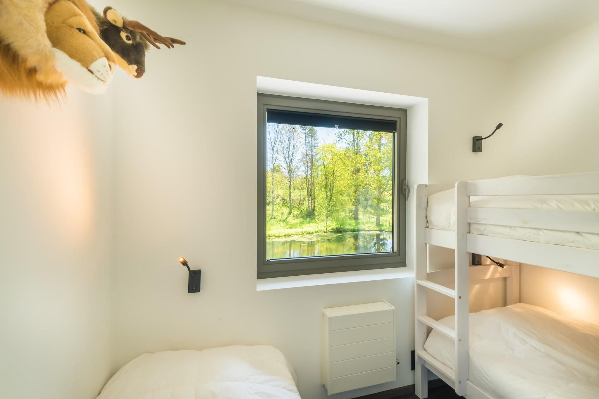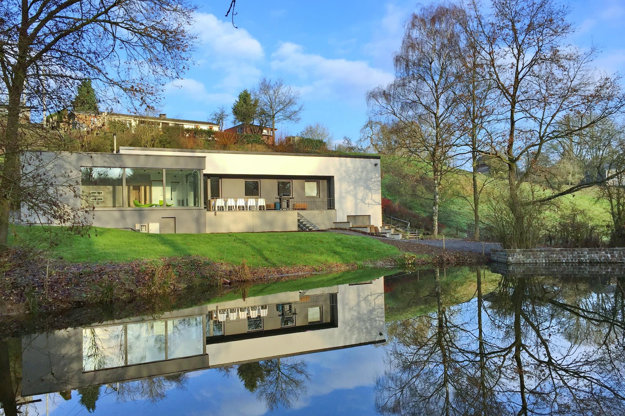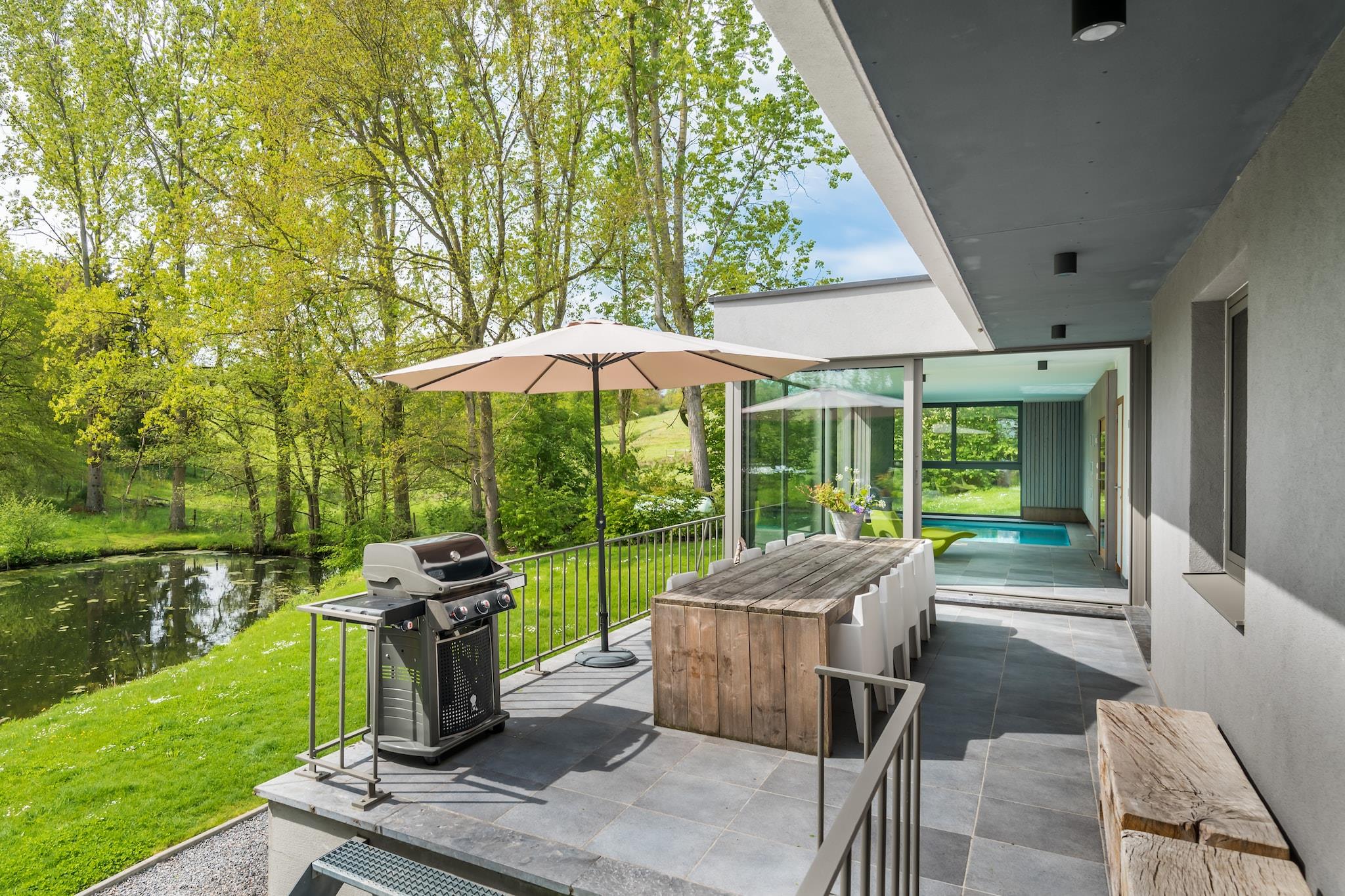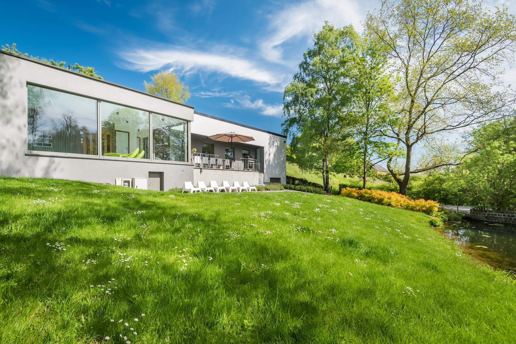 Das Ferienhaus ist eine moderne, sehr gut isolierte Villa mit Hallenbad inmitten der Natur am Rande des Dorfes Noiseux in der Nähe von Ourthe und Durbuy. Geräumiges Wohnzimmer mit moderner Küche, Wohnzimmer mit Holzofen, Internet TV / DVD mit Home Cinema und PS3, 4 Schlafzimmer, 3 mit Doppelbett und Waschbecken und ein Kinderzimmer mit Etagenbett sowie ein zusätzliches Einzelbett. Badezimmer mit Bad / Dusche, separates Bad k. mit Dusche am Pool, 2 separate Toiletten. Der Innenpool mit Sauna hat großen Fenstern und bietet Aussicht auf den privaten Garten und den Teich. (Wasser 28 ° C, Raum 30 ° C). Die Terrasse ist teilweise überdacht und mit einem Gasgrill ausgestattet. Der Dorfladen ( ca 1 km) wird täglich mit frischen Brötchen versorgt und an der Ourthe (1 km) gibt es im Sommer eine schöne Liegewiese. Abschliessbare Garage für Fahrräder oder Motorräder. Aufgrund der Bestandsaufnahme der Immobilie, bitten wir Sie an der Rezeption zwischen 15h und 16h30 einzuchecken. *Doppelte Anzahlung für Gruppen unter 30 Jahren erforderlich (= EURO 2000)*