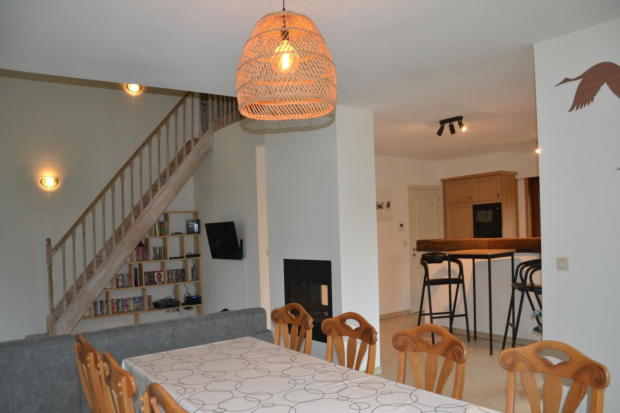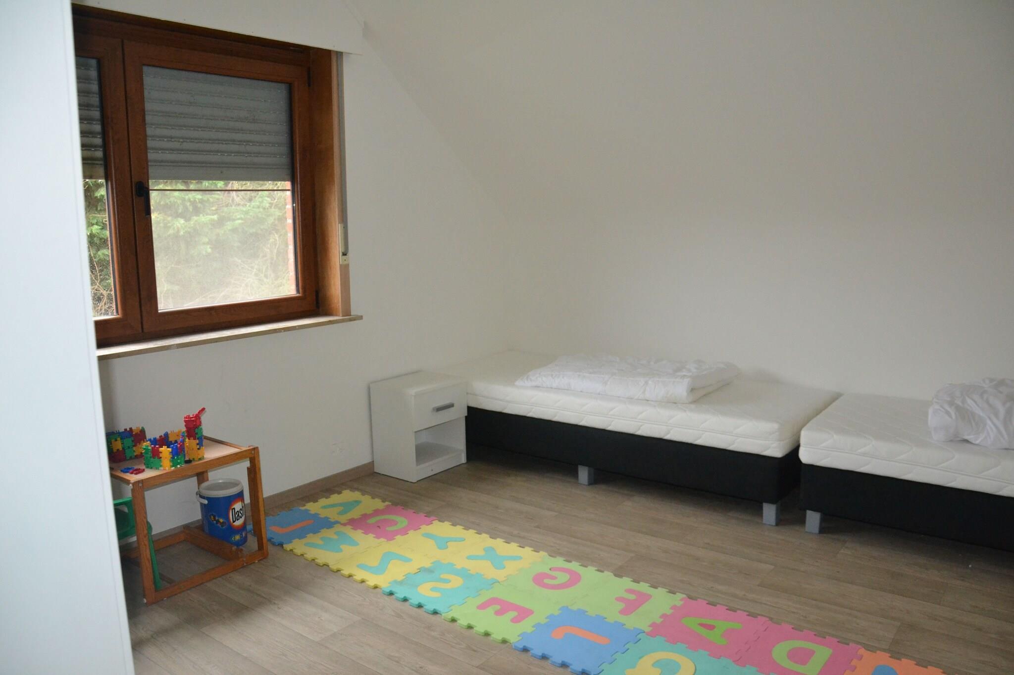 Parterre: (Eingang(Toilette), Wohnzimmer(TV, Kaminofen, Sitzecke, DVD-Spieler, Gesellschaftsspiele, Spielzeug), Küche(Esstisch, Kochplatte, Wasserkocher, Toaster, Dunstabzugshaube, Kaffeemaschine, Backofen, Mikrowelle, Spülmaschine, Kühlschrank, Hochstuhl, Stabmixer), Abstellraum(Tiefkühlschrank, Waschmaschine), Dusche, Waschbecken) In der 1. Etage: (Schlafzimmer(Doppelbett, Kinderbett), Schlafzimmer(Einzelbett, Einzelbett), Schlafzimmer(Einzelbett, Einzelbett, Etagenbett), Schlafzimmer(Einzelbett, Einzelbett), Kinderzimmer(Etagenbett), Badezimmer(Badewanne, Dusche, Waschbecken), Toilette(Toilette)) Garage, Garage, Terrasse, Garten, Gartenmöbel, Grill, Parkplatz, Tischfußball, Billard