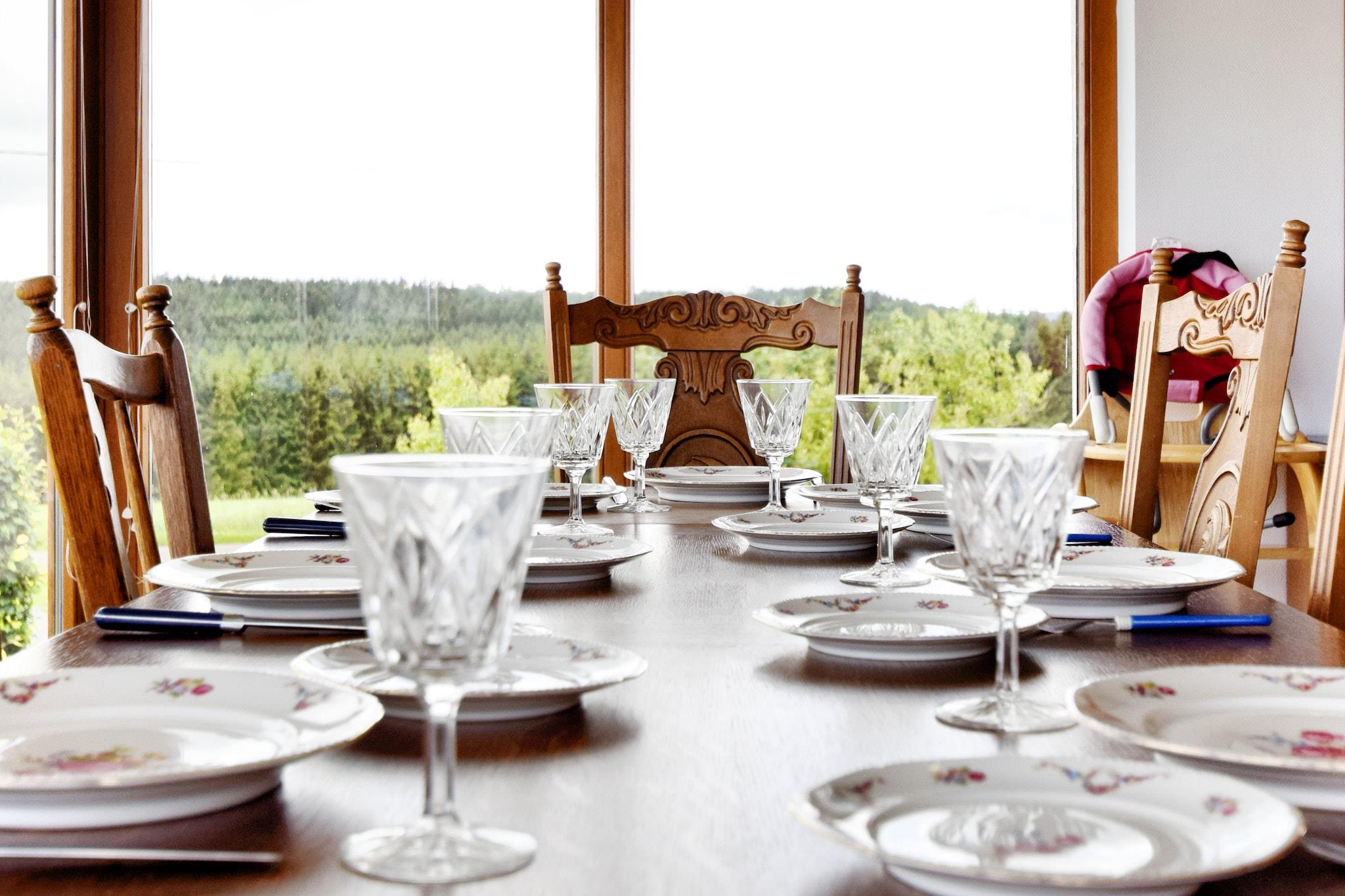 Parterre: (Eingangshalle, Küche(Kochherd(5 Kochplatten, Gas), Kaffeemaschine, Backofen, Mikrowelle, Kühl-/Gefrierkombination), Wohn/Esszimmer(TV, Ofen), Badezimmer(Badewanne, Dusche, Waschbecken), Toilette, Wintergarten) In der 1. Etage: (Schlafzimmer(Doppelbett), Schlafzimmer(Doppelbett), Schlafzimmer(2x Einzelbett), Schlafzimmer(3x Einzelbett), Toilette(Waschbecken)) Spülmaschine, Heizung(Zentral), Terrasse, Garten(Gemeinschaftliche Nutzung mit dem Eigentümer und anderen Gästen ), Grill, Parkplatz, Trampolin, Spielgeräte, Rutsche