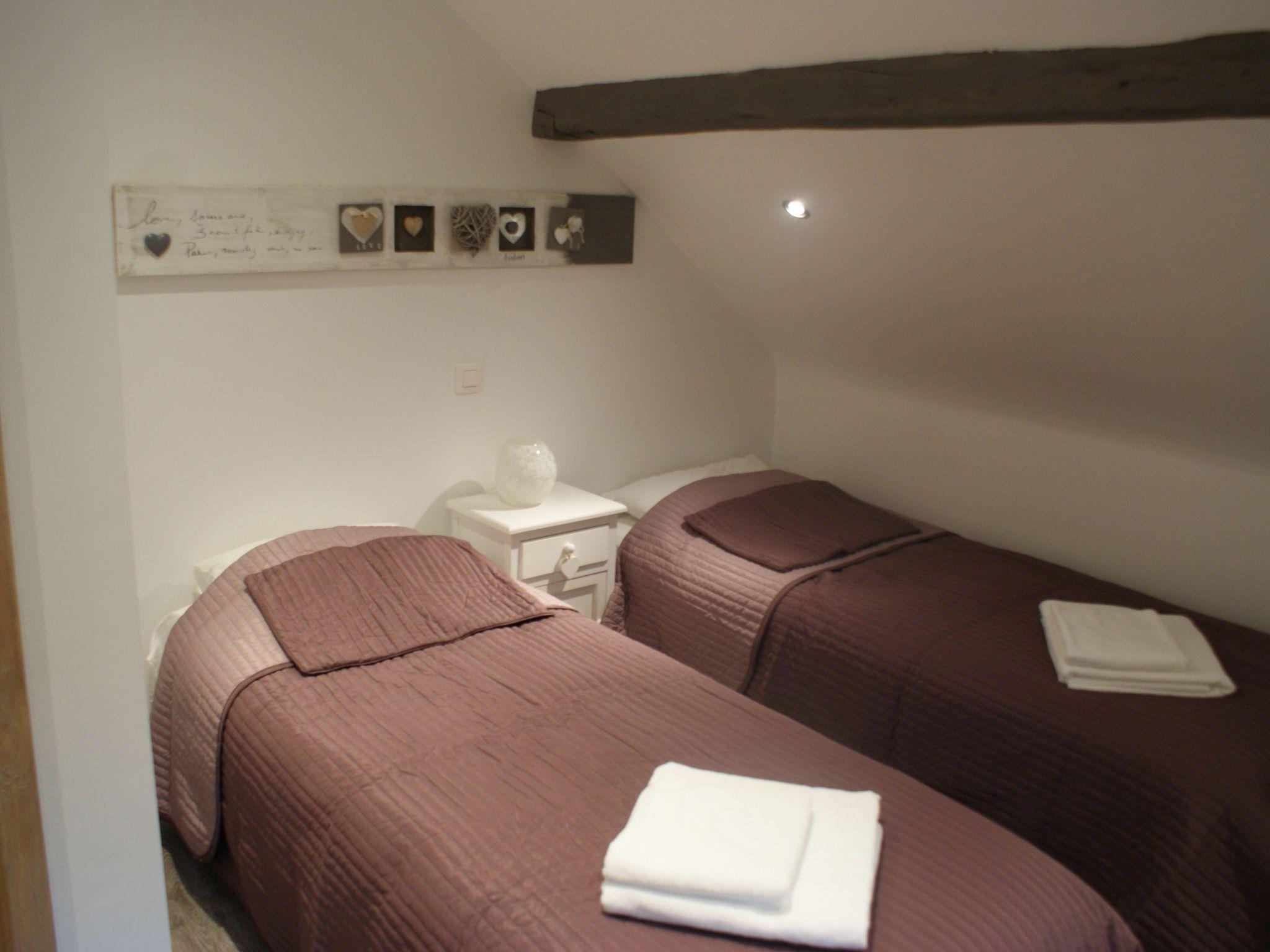 Im zweiten Stock befindet sich ein großes Schlafzimmer mit 3 Einzelbetten (90 cm), TV und eigenem Badezimmer (Dusche, Waschbecken, Toilette).