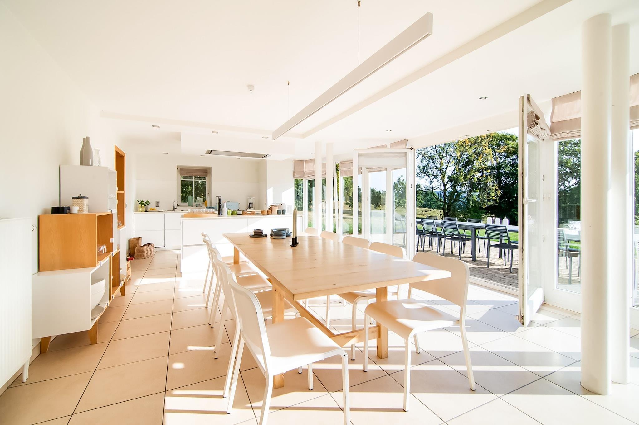 Parterre: (Wohnzimmer(TV(internationale TV-Kanäle), Esstisch(10 Personen), Esstisch(8 Personen), Kaminofen), offene Küche(Kochherd(Induktion), Kaffeemaschine(Filter), Backofen, Mikrowelle, 2x Spülmaschine, Kühl-/Gefrierkombination, 2x Hochstuhl)) In der 1. Etage: (Schlafzimmer(Doppelbett oder 2 Einzelbetten(Boxspring, 90 x 200 cm), Waschbecken), Schlafzimmer(Doppelbett oder 2 Einzelbetten(Boxspring, 90 x 200 cm), Waschbecken), Schlafzimmer mit Badezimmer(Doppelbett oder 2 Einzelbetten(Boxspring, 90 x 200 cm), Badewanne, Waschbecken, Toilette), Schlafzimmer mit Badezimmer(Einzelbett(90 x 200 cm), Einzelbett(90 x 200 cm), Einzelbett(90 x 200 cm), Dusche, Waschbecken), Badezimmer(Badewanne, Waschbecken, Toilette), Toilette, Toilette) Gästeunterkunft Parterre: (Ruheraum(Dusche, Sauna, Toilette), Pool(alleinige Nutzung, erwärmt, 8 x 4 m.)) Gästeunterkunft in der 1. Etage: (Schlafzimmer(2x Doppelbett, Waschbecken)) Trockner, Heizung(Zentral), Terrasse, Garten(alleinige Nutzung, > 1000 m2), Gartenmöbel, Grill, 10x Parkplatz, Sonnenschirm, Tischtennisplatte