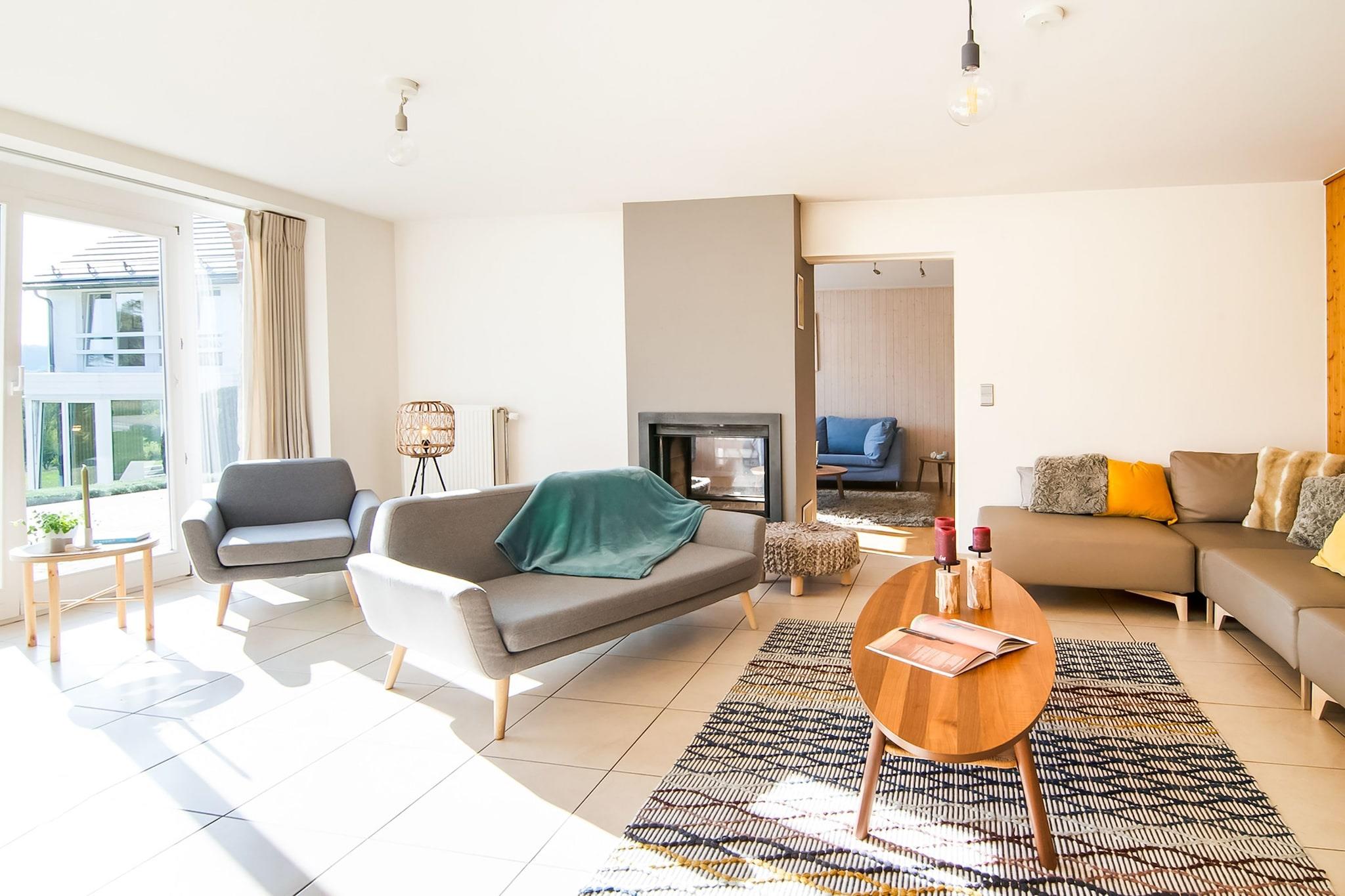 Diese wunderschöne, luxuriöse Wohnung ist vollständig renoviert und liegt in der Region der Seen von Robertville und Bütgenbach. Das Haus ist sehr großzügig angelegt und damit ideal für Familien und Verwandtschaft. Die Ferienwohnung verfügt über einen großen Wohnbereich mit verschiedenen Sitzecken, einem Tischfußballtisch und einen schönen offenen Kamin, den Sie von beiden Seiten genießen können. An den Wohnbereich schließt sich die große, offene Küche an, die mit allen Annehmlichkeiten ausgestattet ist. Wollen Sie sich mal entspannten, gehen Sie natürlich in die feine Saune oder den beheizten Innenpool. Vom Pool aus finden Sie Flügeltüren, über die Sie auf die Terrasse mit Grill und in den schönen Garten gelangen. Der Eigentümer spricht französisch, englisch und deutsch. Viele Wanderrouten beginnen vom Haus aus und führen zu herrlichen Panoramaaussichten auf die umliegende, hügelige Landschaft. Für Geschäfte und Straßencafés sind Sie in Waimes (3,5 km), Malmedy (8 km), Stavelot (17 km) und Spa (27 km) richtig. Andere Sehenswürdigkeiten sind die Seen von Robertville und Bütgenbach (9 km), das Schloss von Reinhardstein (11 km) und der Naturpark Hohes Venn (12 km). Ferner befinden Sie sich in 11 Kilometern Entfernung von den Ski- und Langlaufpisten des Hohen Venns.