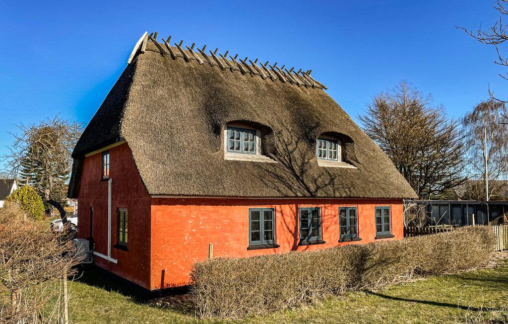Charmantes Fachwerkhaus mit Reetdach auf Ærø, ideal für ruhige Ferien in ländlicher Idylle und historischer Atmosphäre.