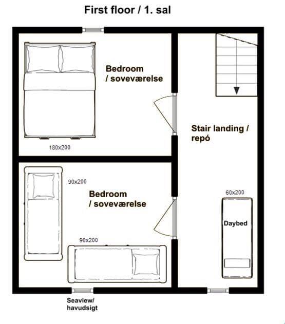 Im Obergeschoss befinden sich zwei Schlafzimmer: eines mit Doppelbett und eines mit zwei Einzelbetten. Im Erdgeschoss gibt es zudem ein Zimmer mit Schlafsofa für die Kinder sowie ein Kinderbett und einen Hochstuhl für die jüngsten Gäste.