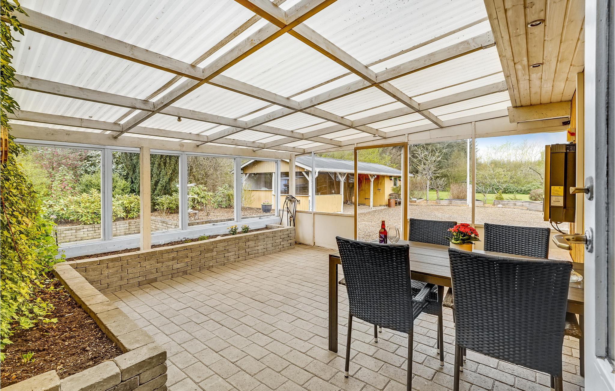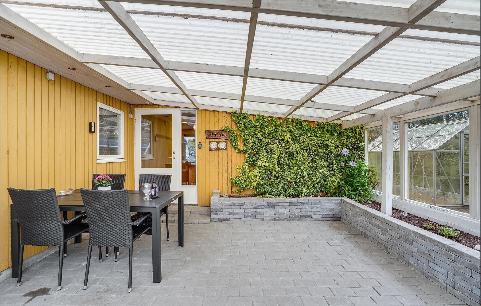 Gemütliches Ferienhaus nahe Fjord mit Terrasse, Gartenmöbeln und Kaminofen für einen erholsamen Urlaub.