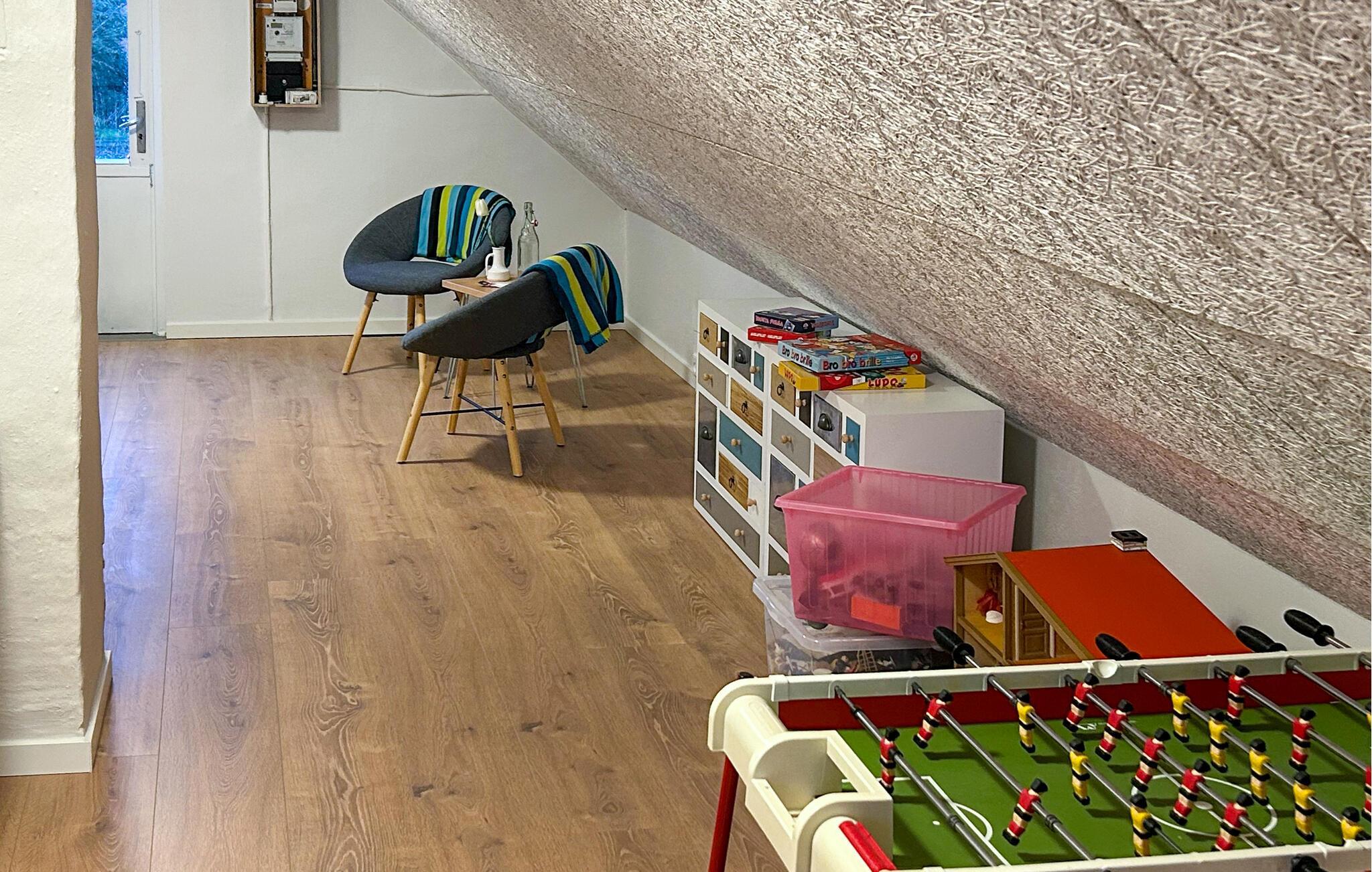 Ihr Ferienhaus bietet Ihnen die Möglichkeit, sich eine Pause vom Alltag zu gönnen und die Umgebung in Ihrem eigenen Tempo zu erkunden. Machen Sie es sich im großzügigen Wohnbereich gemütlich. Die Holzböden und die warme Einrichtung sorgen für eine behagliche Atmosphäre. Verbringen Sie entspannte Abende auf dem Sofa und den Sesseln, lesen Sie ein Buch oder schauen Sie einen Film. Der angrenzende Essbereich lädt zu geselligen Mahlzeiten ein, die Sie in der praktischen Küche zubereiten können.