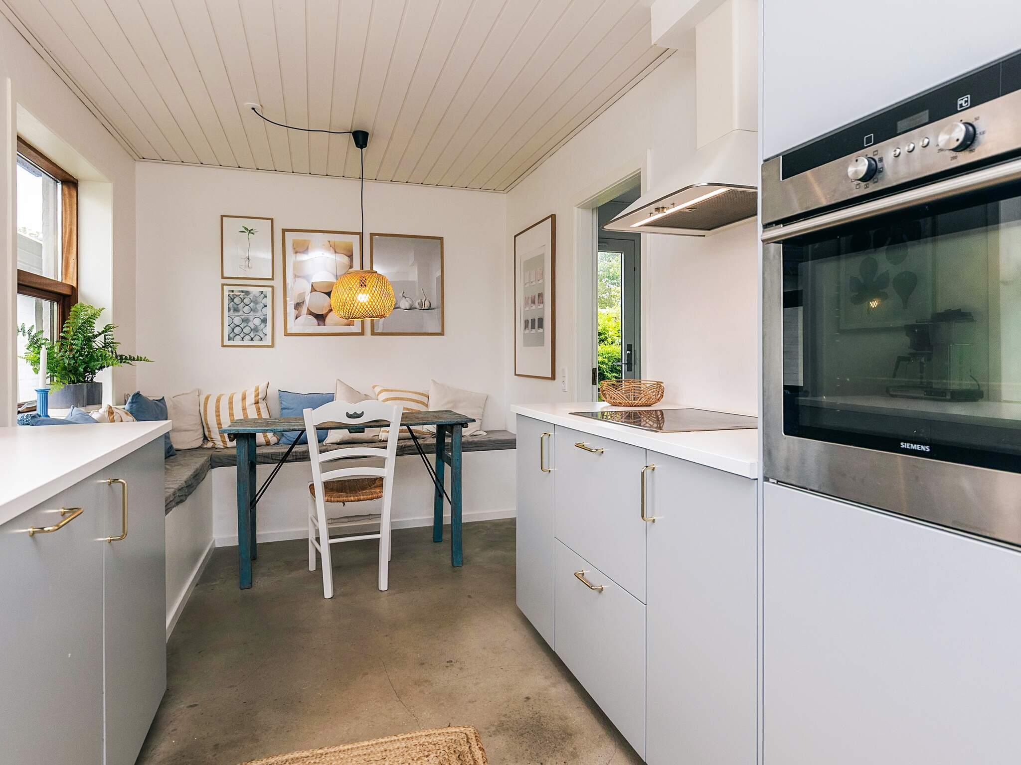 Das Ferienhaus bietet eine schöne Küche mit gemütlichem Essbereich, in dem viel Platz zum gemeinsamen Kochen und Genießen guter Mahlzeiten ist. Das große, helle Wohnzimmer ist mit bequemen Möbeln und einem Holzofen ausgestattet, der an kühlen Abenden für zusätzliche Wärme und Atmosphäre sorgt – perfekt zum Entspannen bei einem guten Buch oder Film.