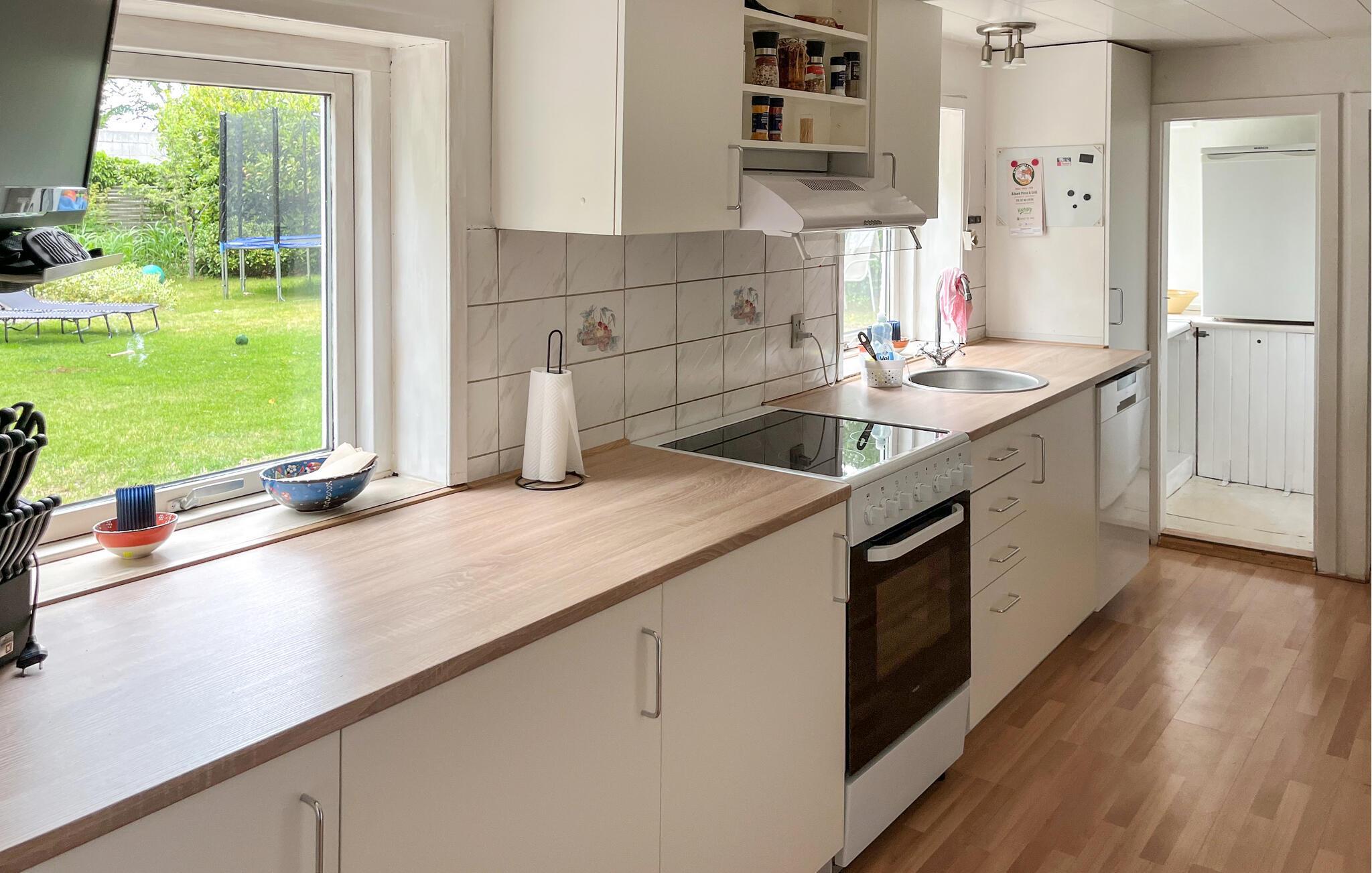 Erleben Sie eine erholsame Auszeit in Ihrem einladenden Ferienhaus mit geschütztem Garten. Das Haus ist ideal für Familien geeignet und bietet ein abwechslungsreiches Umfeld für entspannte Ferientage. Machen Sie es sich im Wohnbereich gemütlich. Nutzen Sie die bequemen Sofas zum Ausruhen, sehen Sie gemeinsam einen Film oder essen Sie am Esstisch in geselliger Runde. Mehrere Sitzecken im Haus bieten Rückzugsmöglichkeiten und Platz für anregende Gespräche oder lustige Spiele. In der langgezogenen, hellen Küche mit Blick in den Garten bereiten Sie gemeinsam Ihre Mahlzeiten zu. Ein zusätzlicher Essplatz in der Küche sorgt für Flexibilität im Alltag.
