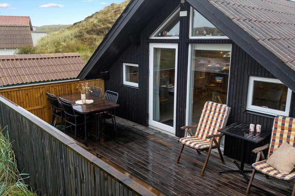 Es gibt mehrere Terrassen rund um das Haus – nach Osten, Süden und Norden. Diese garantieren Sonne oder Windschutz zu jeder Tageszeit. Die geschlossene, kinderfreundliche Terrasse ist perfekt für Familien mit Hund, denn hier können die Kleinen sicher spielen. Nördlicherseits sorgt eine Außendusche für Erfrischung nach dem Strandbesuch, und von der kleinen Bank aus könnt ihr schon morgens mit Kaffee den Blick auf den Fjord genießen. Es liegt eine ruhige und natürliche Atmosphäre über dem Ort – genau richtig, um tief durchzuatmen und den Wind in den Dünen flüstern zu hören. Für aktive Urlauber gibt es einen neuen, abschließbaren Schuppen - ideal zur sicheren Aufbewahrung von E-Bikes, Surfausrüstung oder anderem Equipment. Kurz gesagt: Hier lässt sich das Ferienleben auch draußen voll ausleben – von früh bis spät.