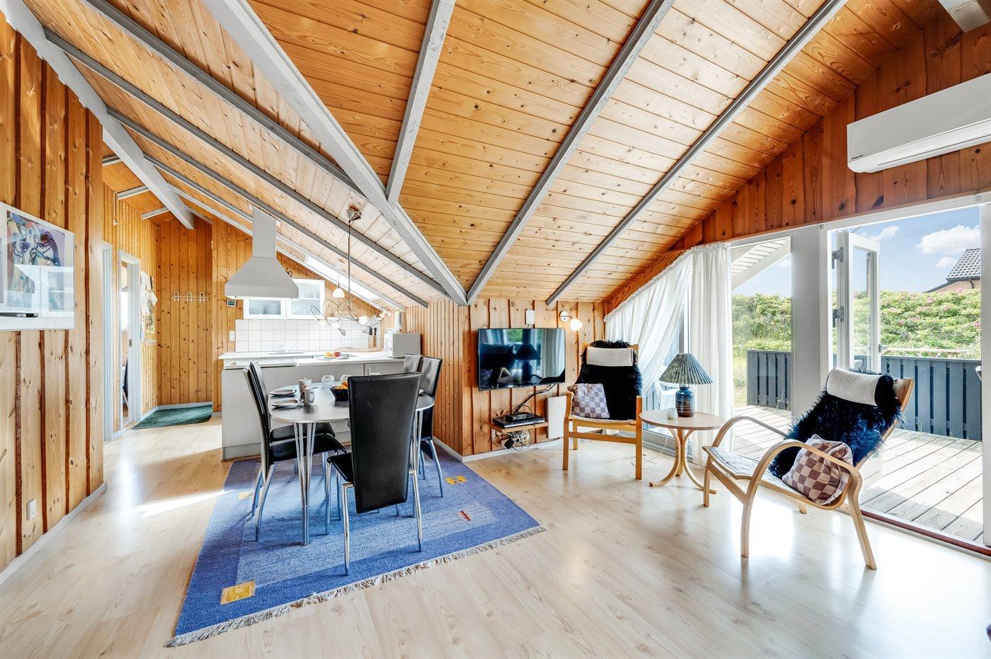 Der helle und gemütliche Wohn- und Essbereich im dänischen Stil lädt zum Entspannen und gemütlichen Beisammensein ein. Auf der großen, bequemen Couch kannst du dich mit einem guten Buch zurücklehnen, während im Hintergrund das Feuer im Kaminofen knistert. Vom Wohnzimmer aus hast du direkten Zugang zur großen, teils überdachten Holzterrasse und zum schönen Dünengrundstück. Mit Blick auf die Dünen kannst du hier entspannen, spielen oder mit dem Hund herumtollen.
