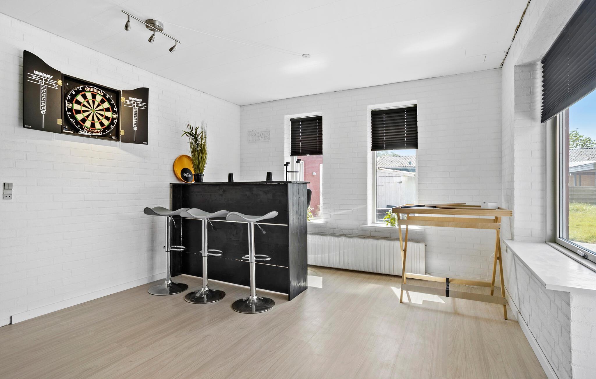 Willkommen in diesem großen Ferienhaus, das Sie mit hellen Räumen und dunkler, eleganter Einrichtung in Empfang nimmt. Erholung und Unterhaltung finden Sie hier im gleichen Maße. Lesen Sie im Wohnzimmer ein Buch auf dem Sofa oder vergnügen sich beim Darts, Tischfußball oder der hauseigenen Bar. Finden Sie Ruhe in den zahlreichen Schlafzimmern und genießen am Morgen Ihren Kaffee auf der Sonnenterrasse und sehen Ihren Kindern beim Spielen im Garten zu.