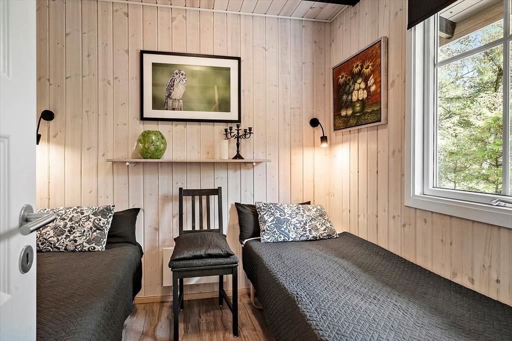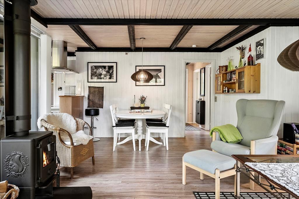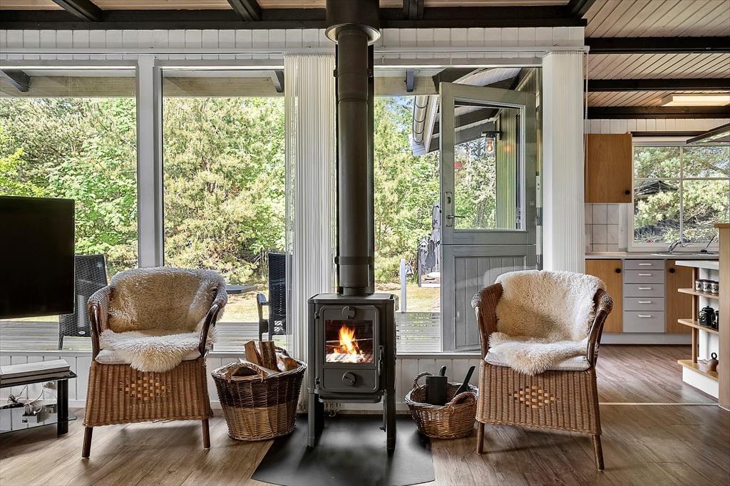 Im Inneren erwartet dich eine wohltuende Atmosphäre mit viel Charme. Die Einrichtung ist stimmungsvoll und gemütlich, mit liebevoll ausgesuchten Details und klassischen Sommerhauselementen, die sofort für Wohlbefinden sorgen. Die Kombination aus Holz, warmen Farbtönen und großen Fenstern, die das Tageslicht hereinlassen, verleiht dem Wohnraum eine angenehme Offenheit. Der knisternde Kamin lädt zu entspannenden Abenden ein – sei es mit Spielen, einem guten Buch oder einfach im Kreis der Familie. Auch die Schlafzimmer strahlen Ruhe und Geborgenheit aus – der perfekte Rückzugsort nach einem Tag voller Naturerlebnisse.