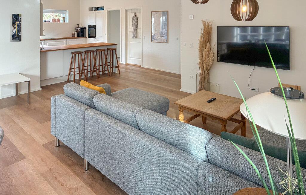 Betreten Sie den großzügigen Innenbereich und genießen Sie die offene Gestaltung mit viel Licht. Helle Materialien, Holzböden und eine geschmackvolle Einrichtung schaffen eine angenehme Wohnatmosphäre. Nehmen Sie im komfortablen Wohnbereich Platz und entspannen Sie auf dem großen Sofa, während Sie den Blick in den Garten schweifen lassen oder einen guten Film schauen. Nutzen Sie den weitläufigen Essbereich für gemeinsame Mahlzeiten und gesellige Runden. Bereiten Sie Ihre Speisen in der schönen Küche zu und verweilen Sie an der Theke oder am Esstisch, um den Tag in ruhiger Atmosphäre ausklingen zu lassen.
