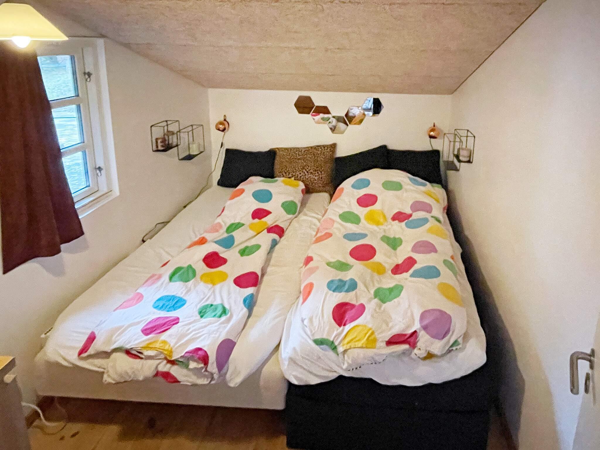 Das Haus verfügt über drei Schlafzimmer: eines mit Doppelbett und zwei weitere Zimmer mit jeweils einem 120 cm breiten Doppelbett und einem 90 cm breiten Einzelbett. Unter der Dachschräge befindet sich ein Hems mit Matratzen und Sichtschutzvorhängen für zusätzlichen Schlafplatz. Ein helles Badezimmer mit Dusche rundet das Interieur ab.