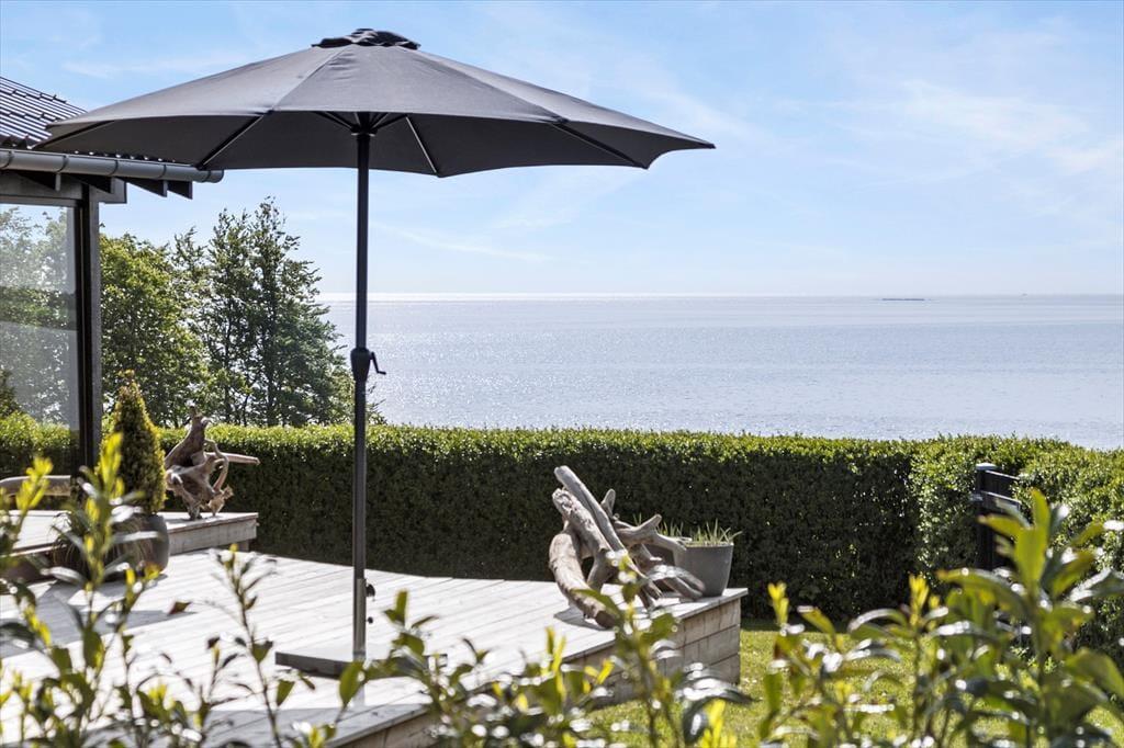 Wir kommen nicht darum herum, auch bei den Außenbereichen die Lage und den tollen Meerblick in den Fokus zu rücken. Der Garten mit Grasfläche ist eher kleinerer Natur. Dafür lockt allerdings eine schöne, große Holzterrasse, die mit guten Gartenmöbeln, Liegestühlen einem Sonnenschirm und einem Weber Gasgrill ausgestattet ist und somit zu traumhaft erholsamen Stunden und geselligen Runden einlädt. Während Sie sich auf der Terrasse erholen und entspannen, werden Ihre Kinder sicherlich mit viel Spaß auf dem großen Trampolin im Garten hüpfen.