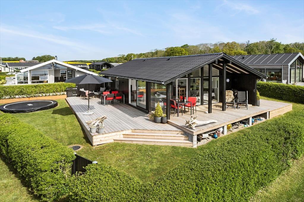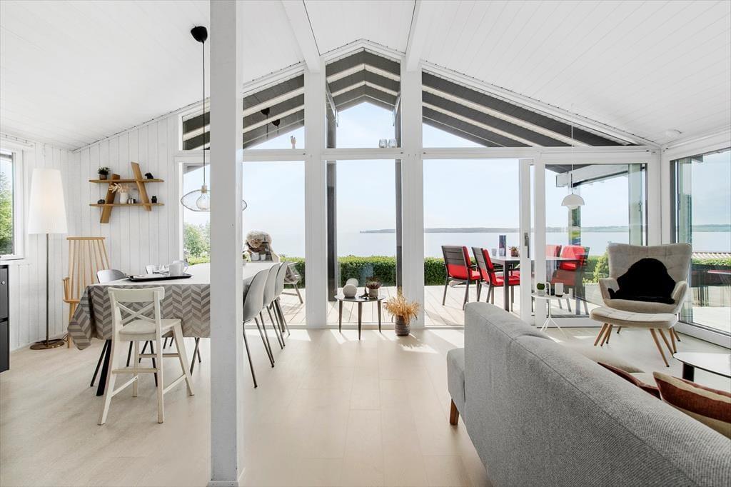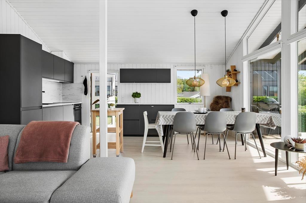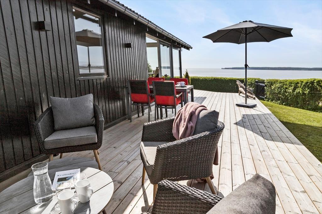 Es ist uns ein großes Vergnügen, Ihnen dieses wirklich schöne Ferienhaus präsentieren zu dürfen. Das attraktive Mietobjekt liegt erhöht in der Umgebung - nur 100 Meter abseits des Strandes - und verwöhnt mit einer traumhaften Panoramaaussicht über das Meer. Den herrlichen Blick genießen Sie sowohl vom Hausinneren aus, als auch auf der wunderbar großen Holzterrasse. Das Urlaubsdomizil wird im Jahr 2021 komplett renoviert und begrüßt Sie daher mit einem hellen und freundlichen Ambiente in bester, gemütlicher Ferienhausmanier. Das Herzstück des Ferienhauses bildet der offen kombinierte Küchen-, Wohn- und Essbereich, der Sie aufgrund der großen Fenster mit einem reizvollen Panoramameerblick verwöhnt. Die moderne Küche beinhaltet alles, was Sie für die Zubereitung Ihrer Urlaubsmahlzeiten benötigen. Ihre gemeinsamen Essen am Esstisch, der Platz für alle Mitreisenden bietet, werden ebenfalls vom Ausblick auf das Meer untermalt. Selbst von der Sofaecke im Wohnbereich genießen Sie den Meerblick. Falls Sie sich von diesem Anblick losreißen können, bietet Ihnen der Fernseher mit dänischen, deutschen, schwedischen und norwegischen Sendern sowie Streamingmöglichkeiten über Chromecast viel Unterhaltung und Abwechslung.